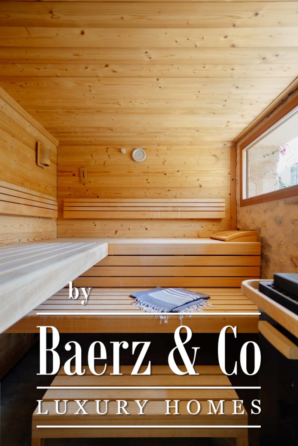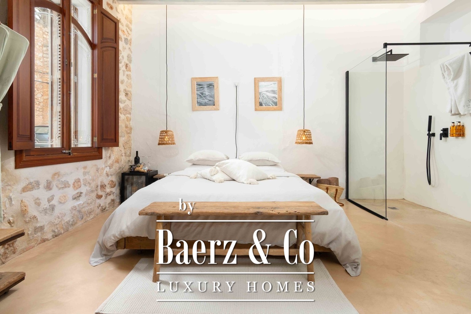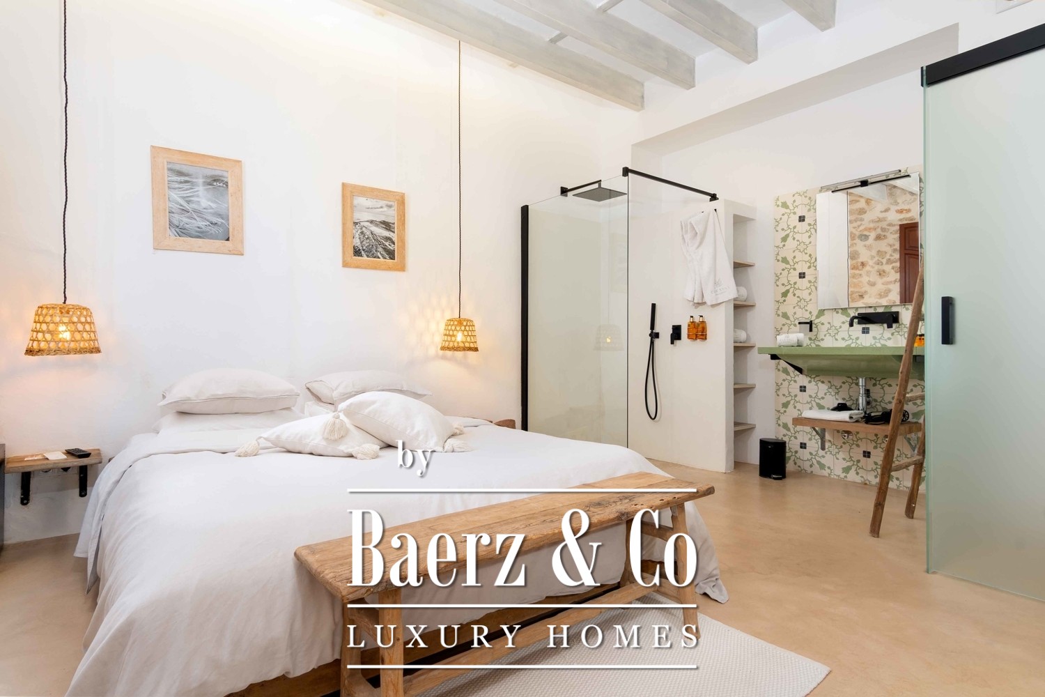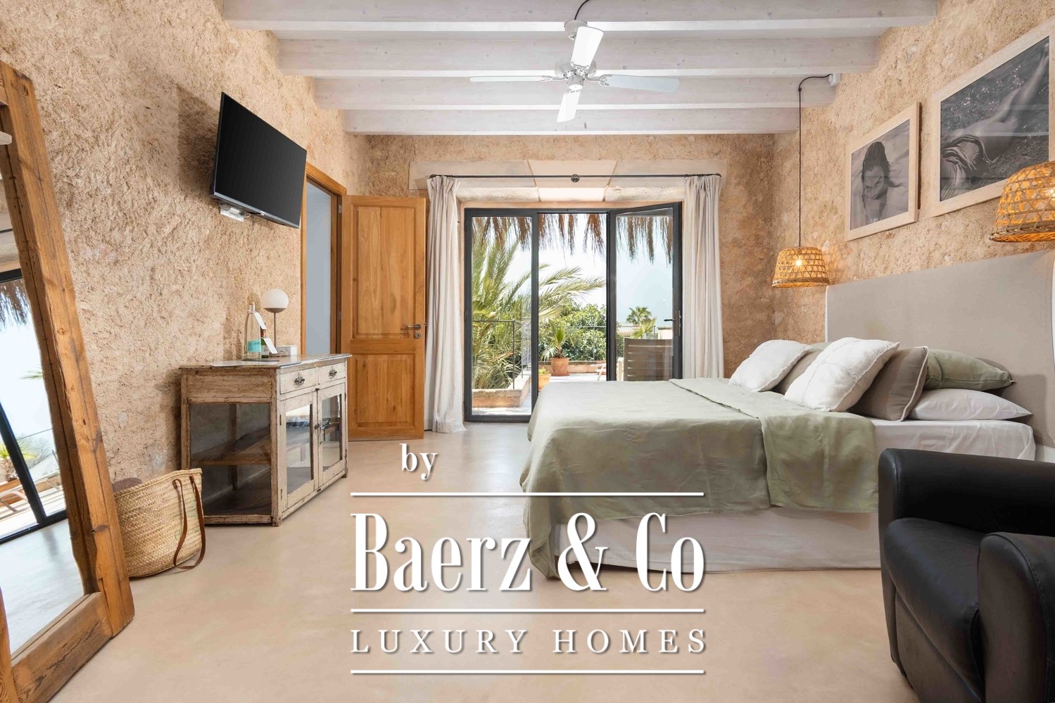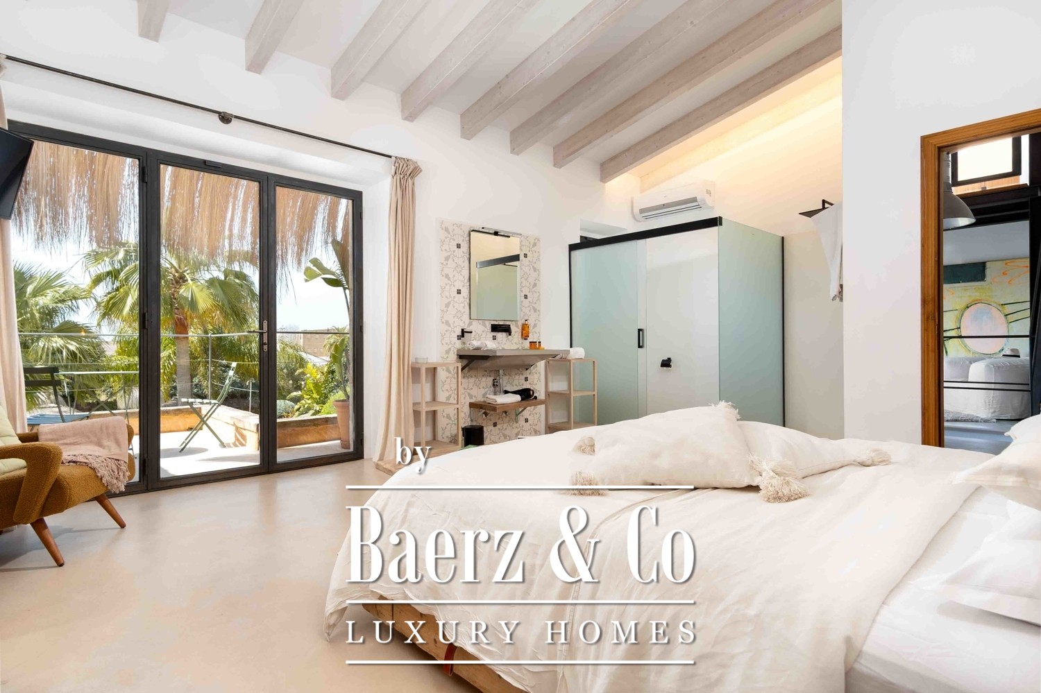 Spaces flow between the formal and the intimate: sunlit terraces, a lush garden, and a pool create the rhythm for restful days, while a separate sauna area extends the promise of privacy and rejuvenation. Each room has been designed as a tranquil escape, filled with light and air, supported by air conditioning, ceiling fans, and underfloor heating. Several bedrooms open to balconies with sweeping views of the landscaped garden, the water, and the historic skyline of Cas Concos and its church.