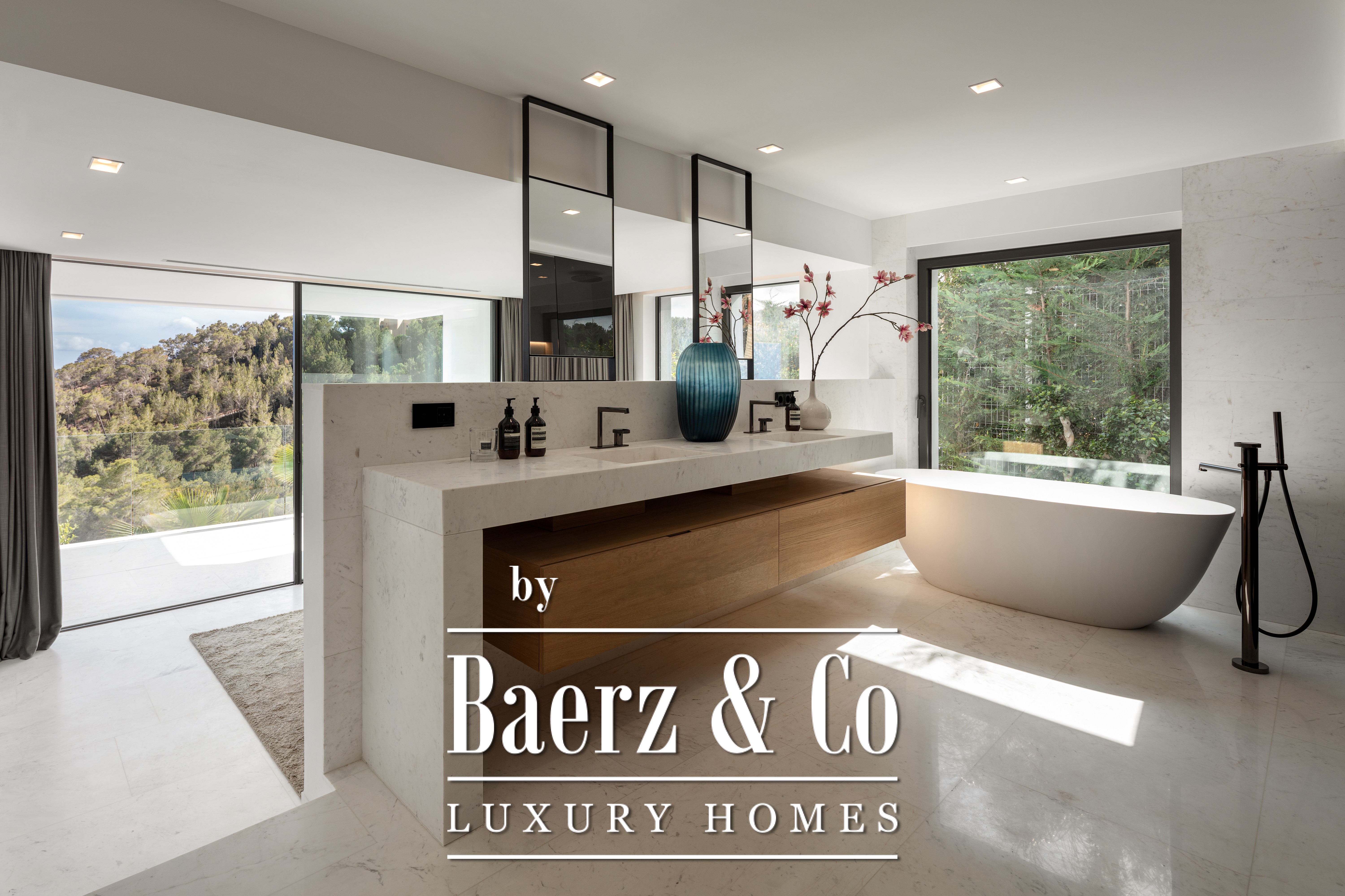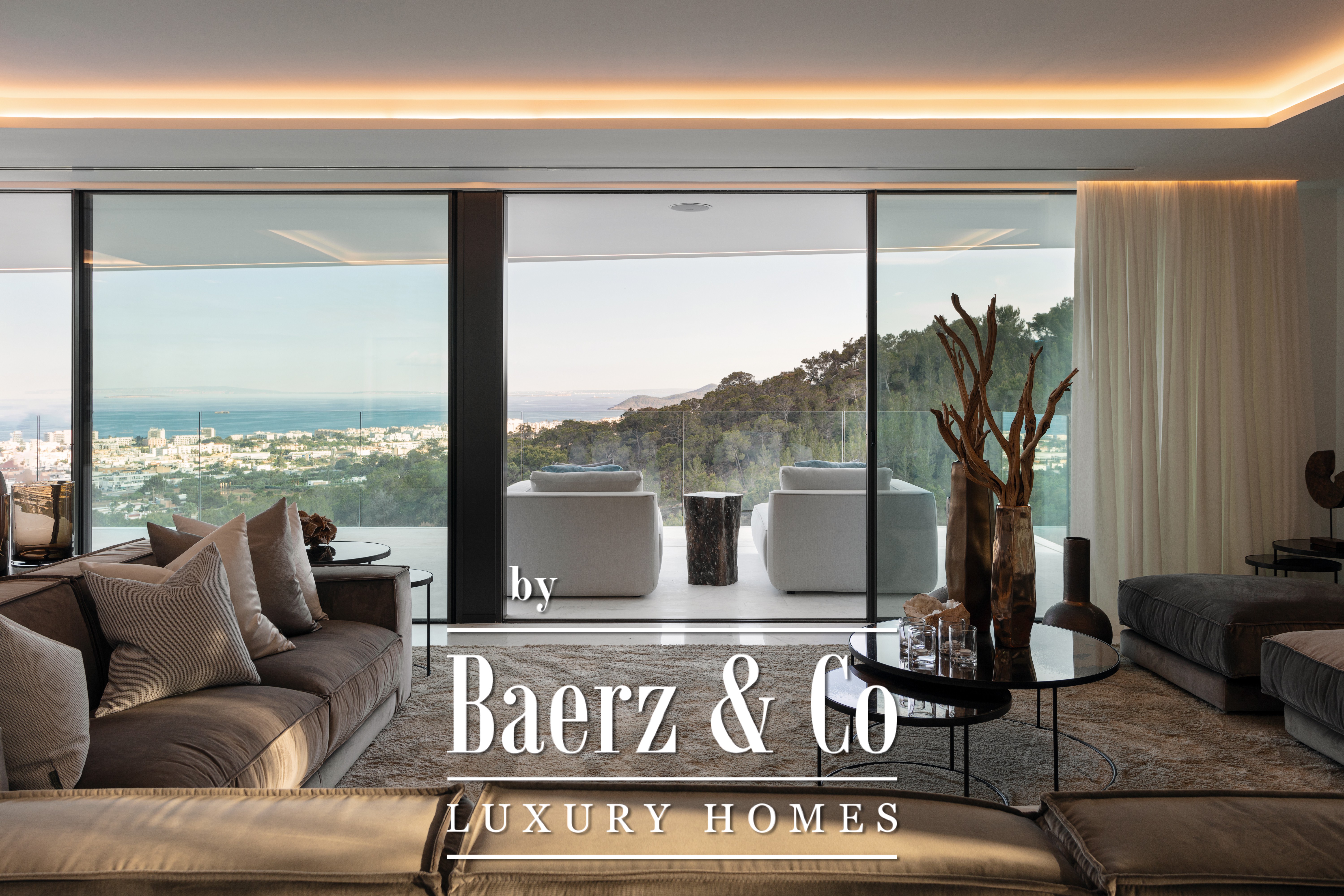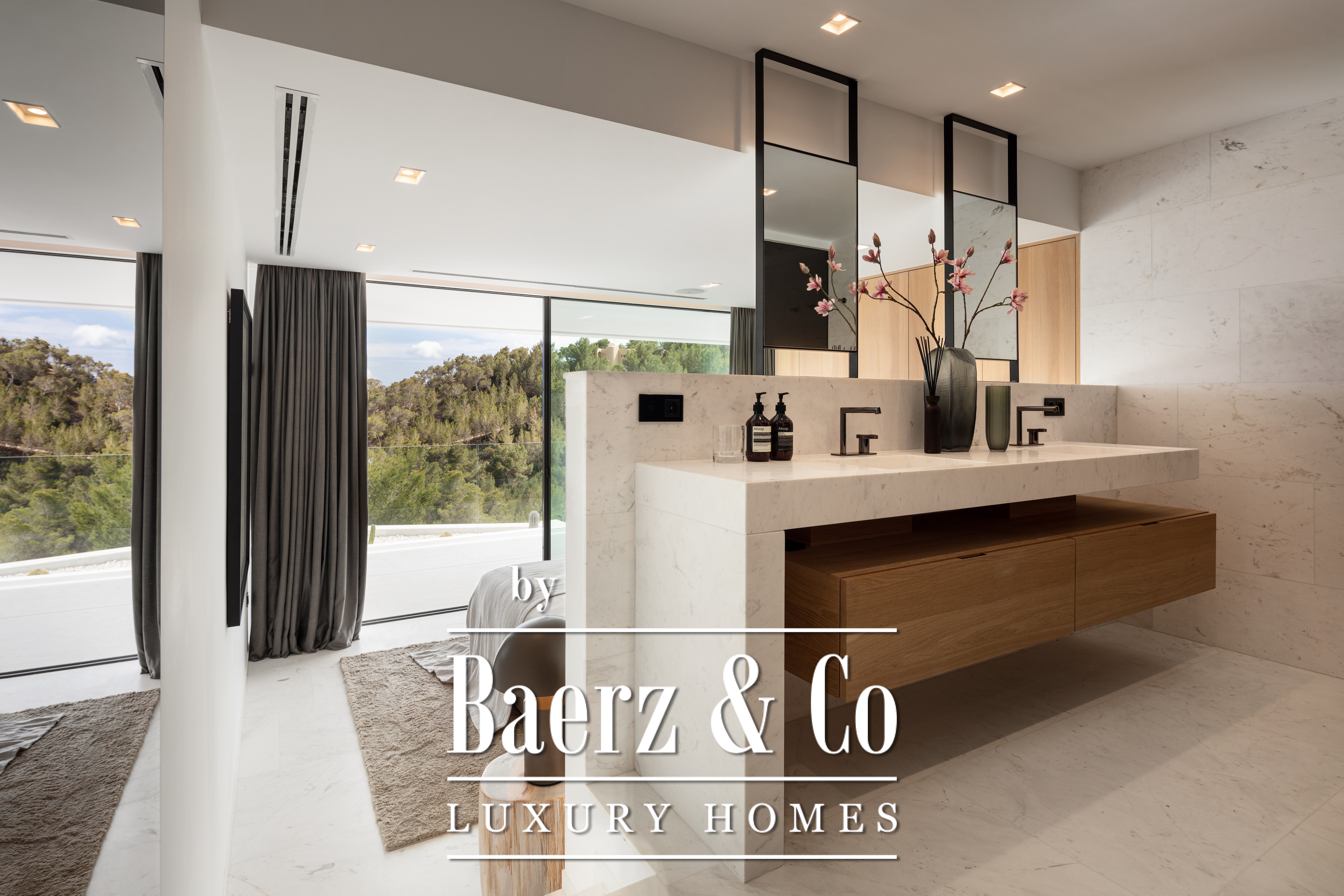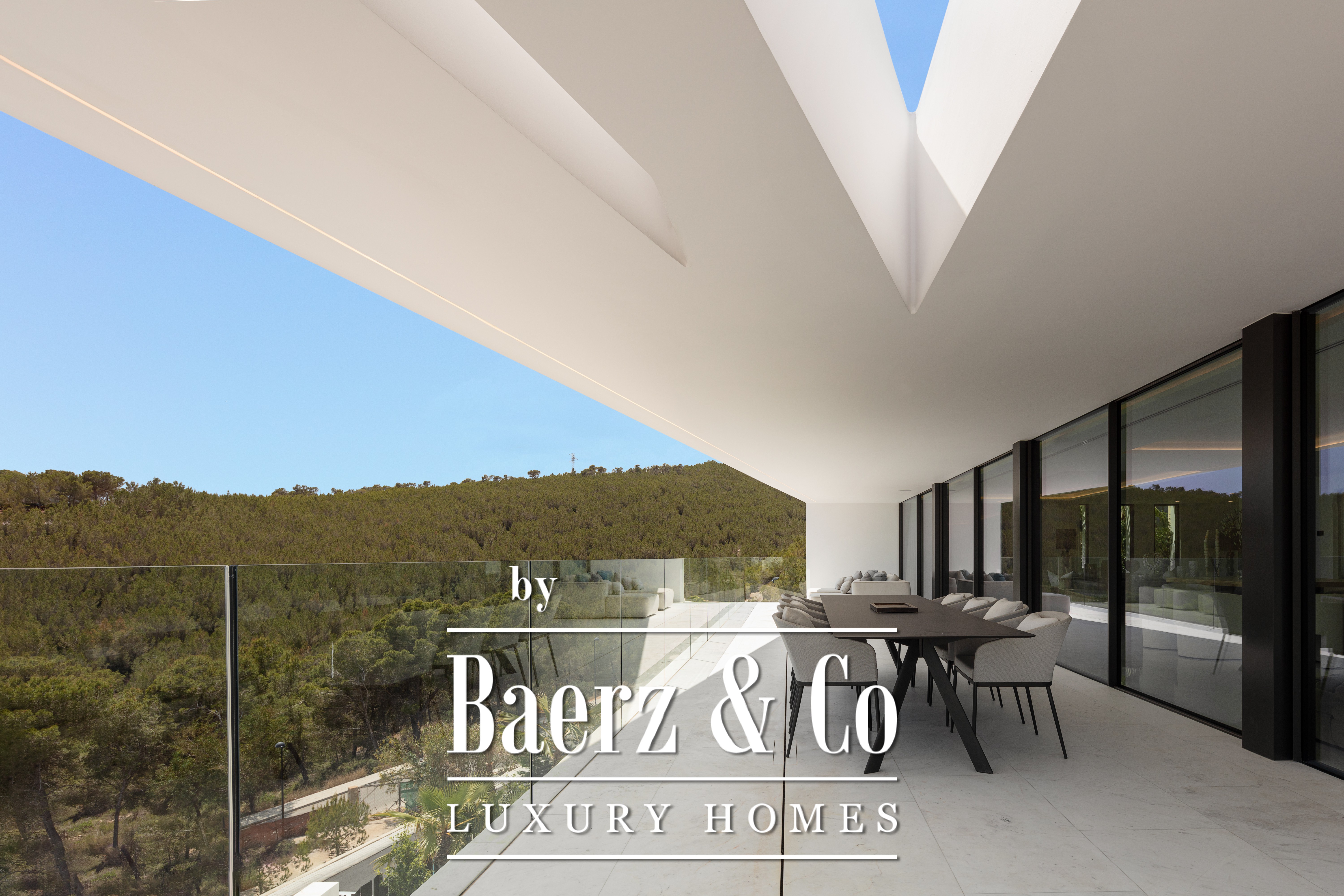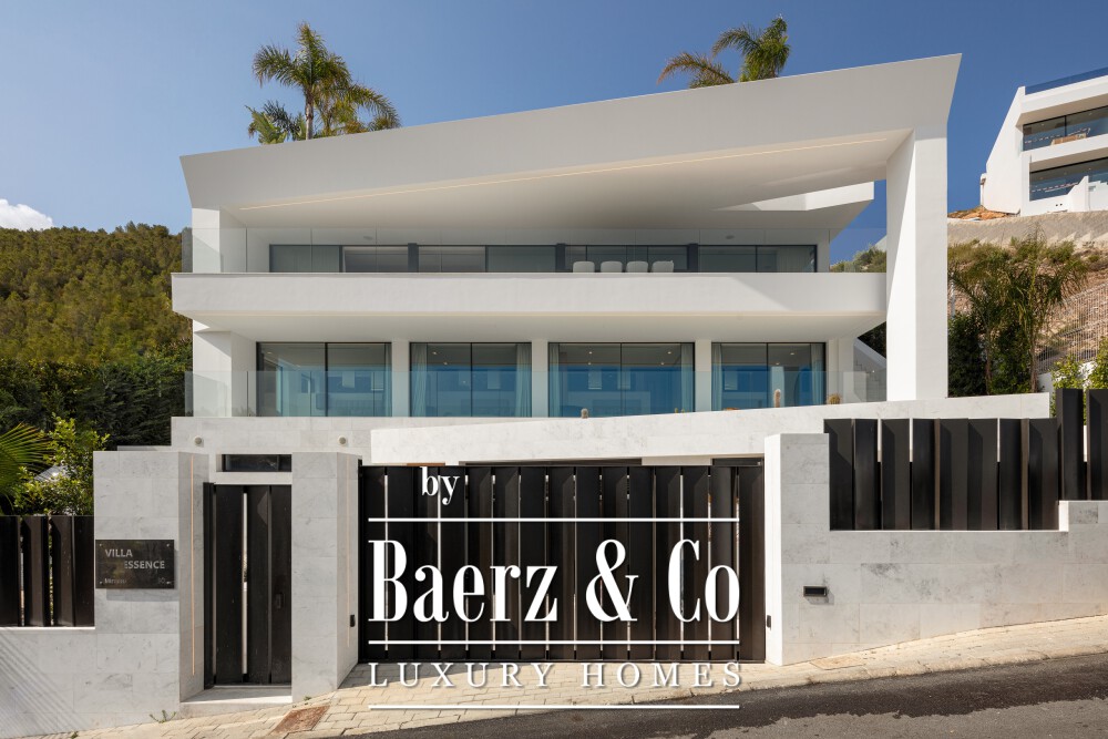 Luxury villa Cas Mut presents a refined perspective on contemporary coastal living in Spain. This newly constructed, fully furnished 685 m² villa stands just five minutes from Ibiza's city center and its lively port, offering unobstructed sea panoramas and iconic views of Formentera from every room. The villa’s design celebrates modern lines, where expansive minimalist windows frame the Mediterranean light, white marble floors and wall cladding enhance a sense of effortless sophistication, and natural wood doors lend organic warmth throughout the home.