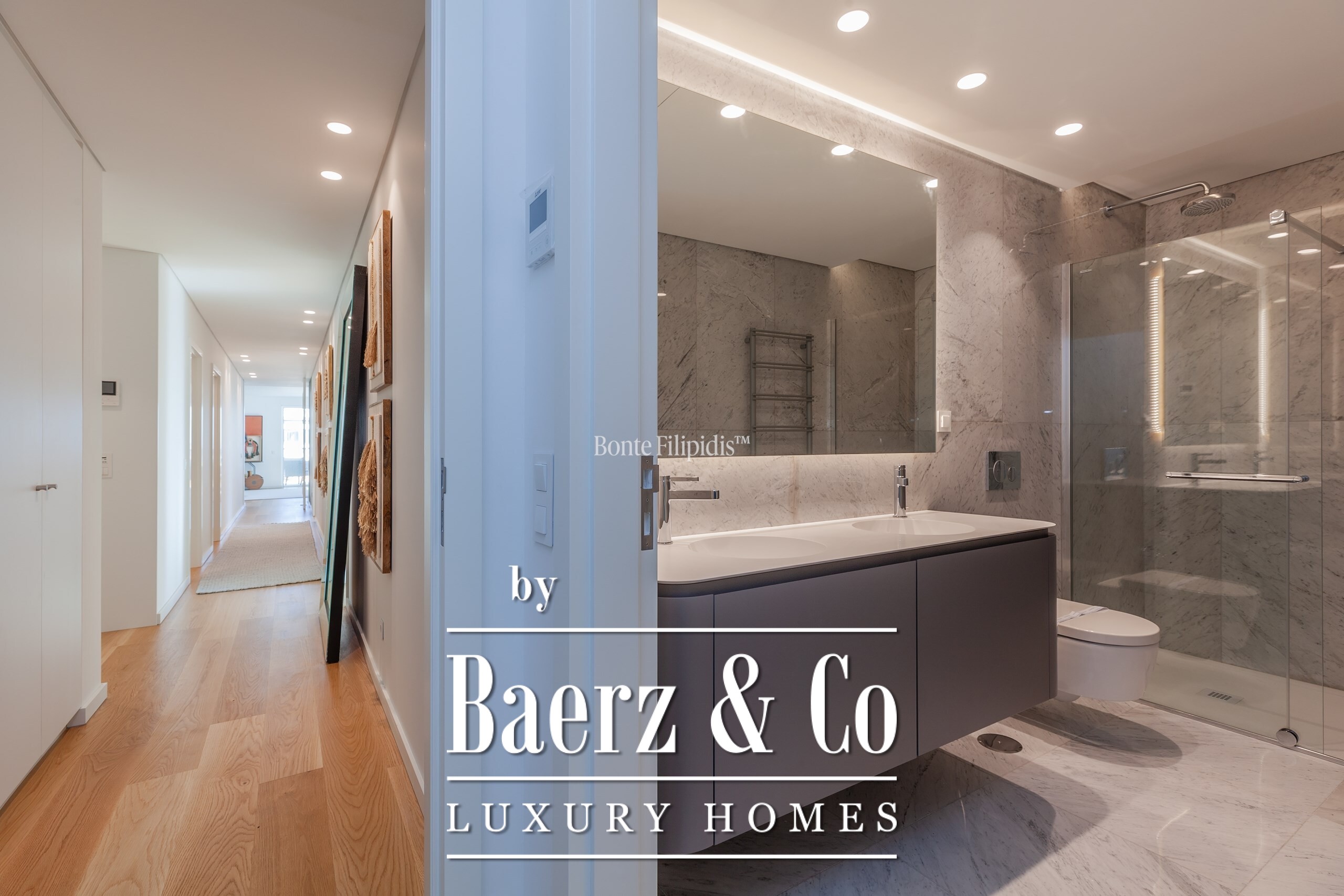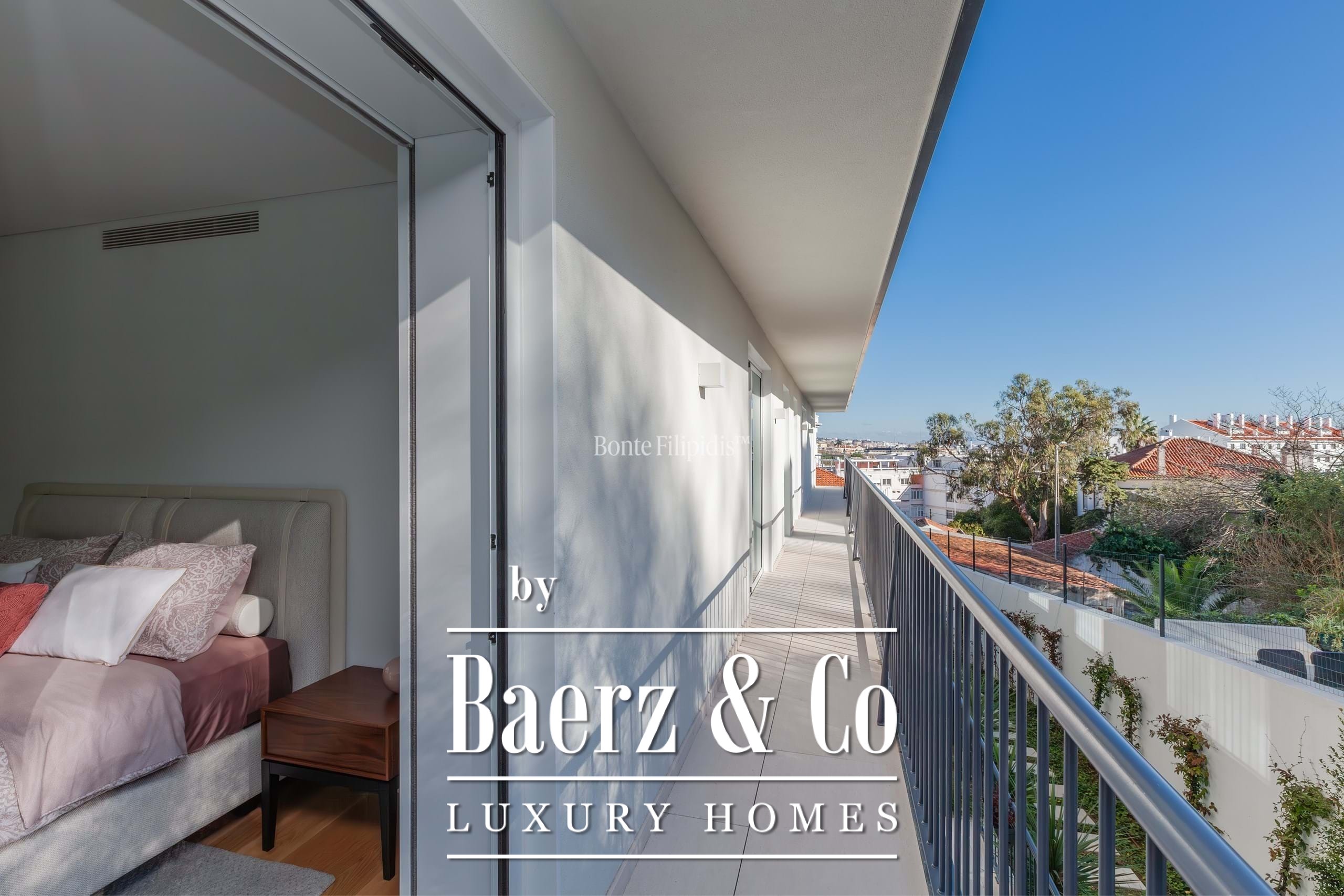 Apartment Cascais e Estoril defines contemporary refinement in a coveted enclave of the Portuguese Riviera. This 224 m² residence is part of an exclusive condominium with only four units, a landscaped garden, and a communal swimming pool, offering a rare sense of privacy and discretion. The apartment’s living and dining room extends directly to a 37,5 m² terrace, creating a seamless connection between interior spaces and the open air. Three additional balconies invite sunlight and varied views across the sea, pool, and garden.