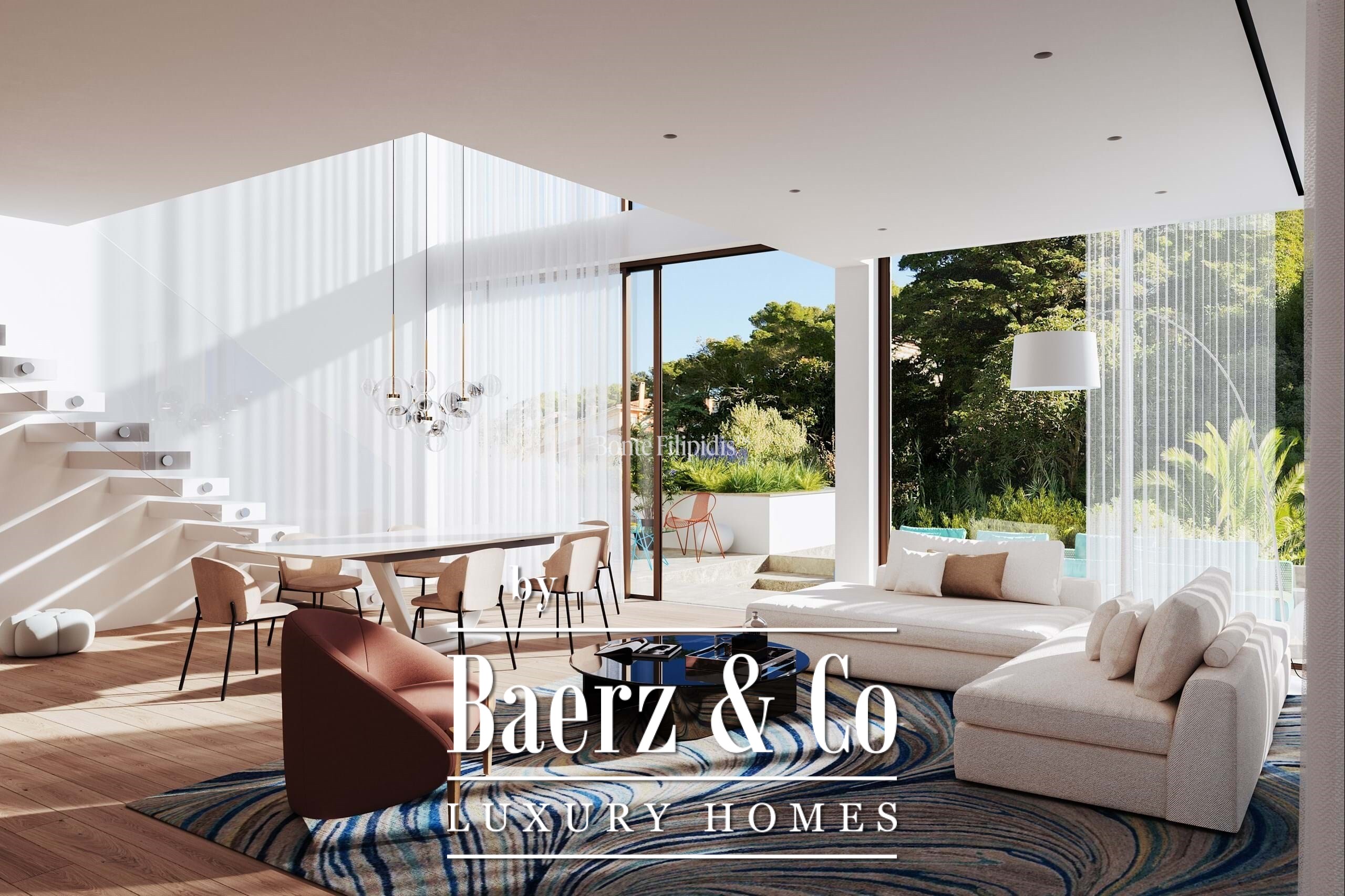 This duplex villa Cascais e Estoril sets a quiet and luminous rhythm just minutes from Atlantic beaches and the spirited pulse of Lisbon, offering 505 m² of considered space on a 505 m² plot. The property features four bedrooms and five bathrooms, with interiors defined by marble flooring, expansive glazing, and seamless connection to the terraces and private pool. South-facing light bathes each room, complemented by electric underfloor heating in the bathrooms, air conditioning, and a full home automation system. Daylight moves fluidly through spaces where contemporary lines soften into tranquil garden views.
