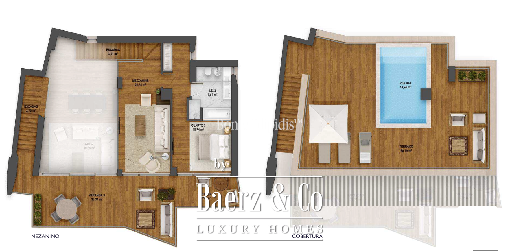 Penthouse Cascais stands at the heart of the city, capturing the rhythm of coastal life within 335 m² of refined living space. This penthouse cascades across two levels, beginning with an open-plan living area where the kitchen meets the lounge, leading seamlessly to a generous terrace designed for indoor-outdoor gatherings. Two en-suite bedrooms open to the terrace, inviting natural light while fostering privacy, complemented by a guest bathroom and laundry room that accentuate the sense of order and ease.