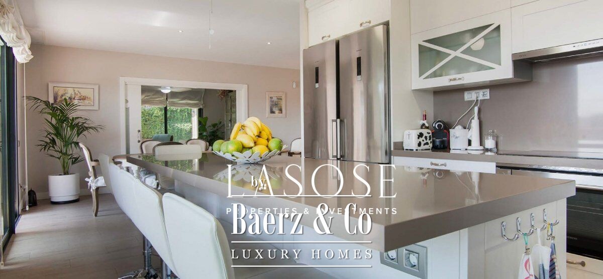 Generous floor-to-ceiling windows and double glass doors define the principal living space, framing serene, open views and inviting the outdoors in. The flow between the living room, formal dining area, and open-plan kitchen feels organic, punctuated by a versatile island and easy access to two distinct outdoor terraces. The garden, anchored by a private pool and shaded by mature trees, creates a tapestry of settings for relaxation and gatherings.