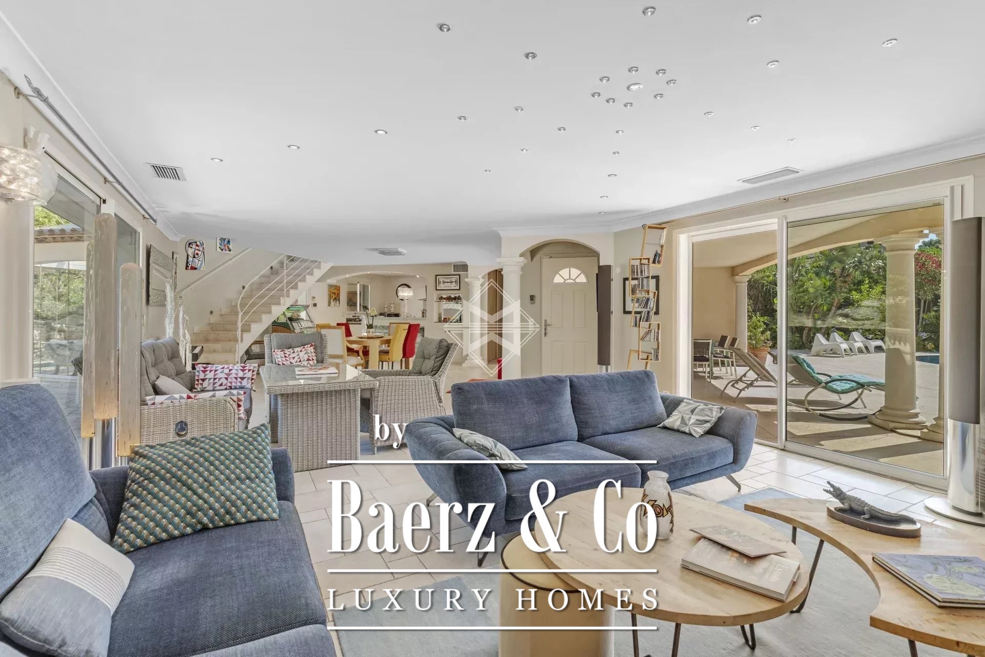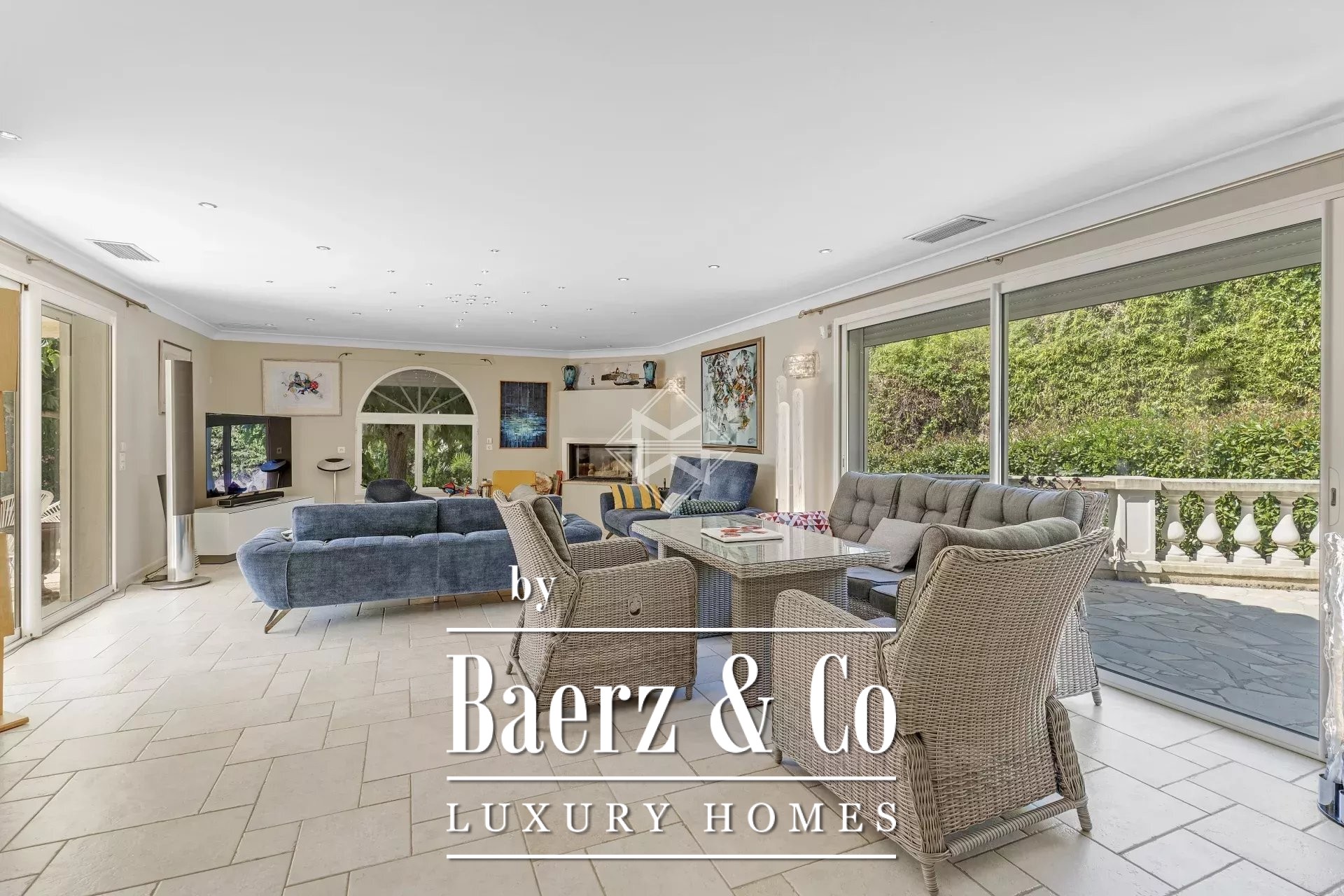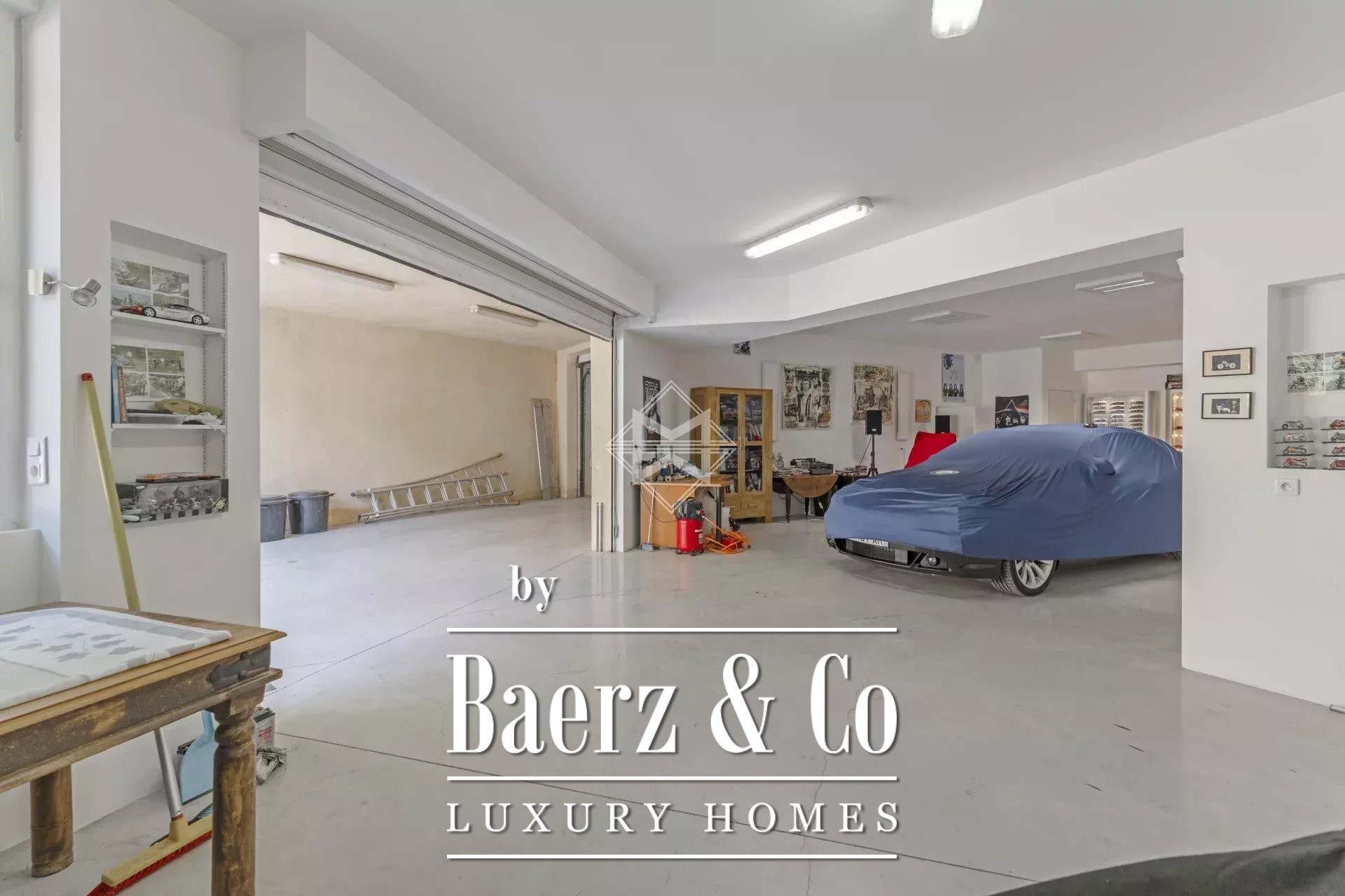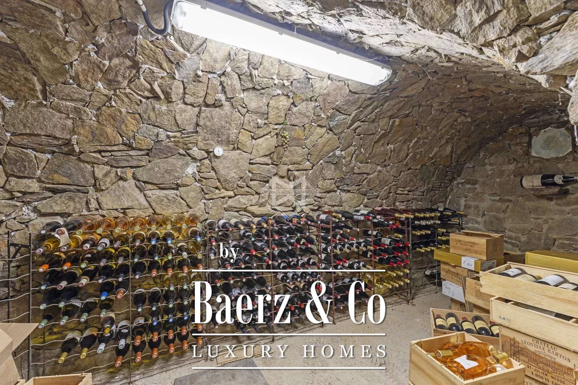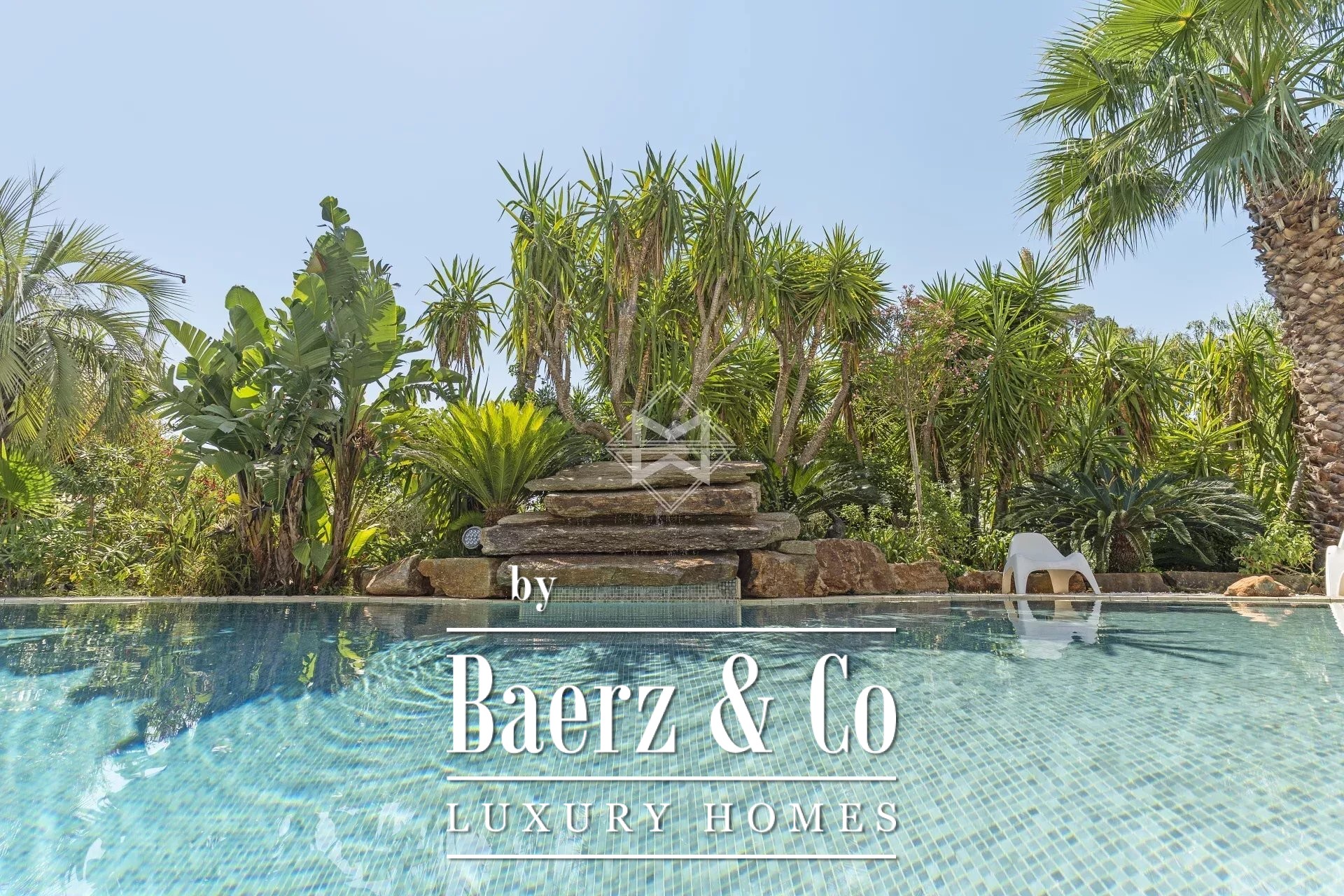 Upstairs, two further bedrooms culminate in a master suite with direct access to a spacious terrace. The surrounding gardens flow towards a 12x6 m swimming pool with counter-current, waterfall, and whirlpool, framed by mature vegetation. The villa’s ensemble is completed by an advanced cinema room, office with library, wine cellar in local stone, laundry, and a six-car garage.