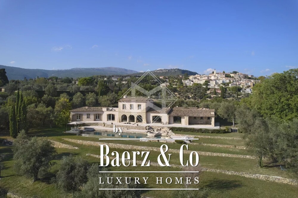 Villa Châteauneuf-Grasse invites a quiet sense of arrival, expertly crafted by architect Richard Sansoe just moments from the village. This property encompasses 625 m² of living space, set within 9,700 m² of landscaped gardens conceived by Jean Mus, fully fenced, and planted with 140 olive trees. The panoramic 360-degree vista extends from the hills to the bay of Nice and Cannes, imbuing each terrace and reception room with a distinctive light and atmosphere.