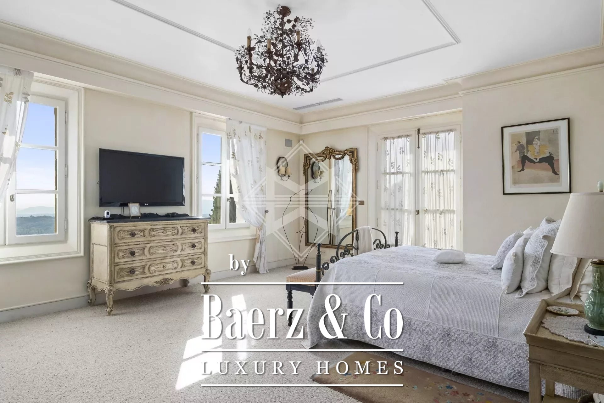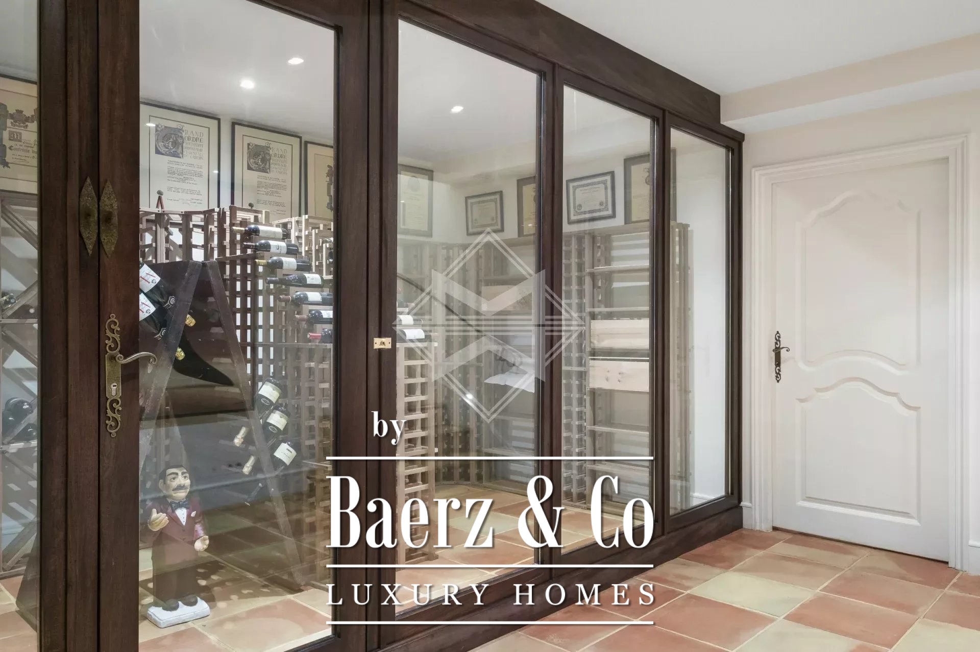 Reception spaces harmoniously link to broad terraces, placing the landscape at the heart of daily life. The main house comprises five bedrooms with private dressing rooms and en suite bathrooms, while the caretaker's house provides a sixth bedroom. The principal suite has its own secluded terrace, complemented by an elegant office with fireplace, which offers potential as a seventh bedroom. Underfloor heating, air-conditioning, and advanced home automation elevate comfort and security.