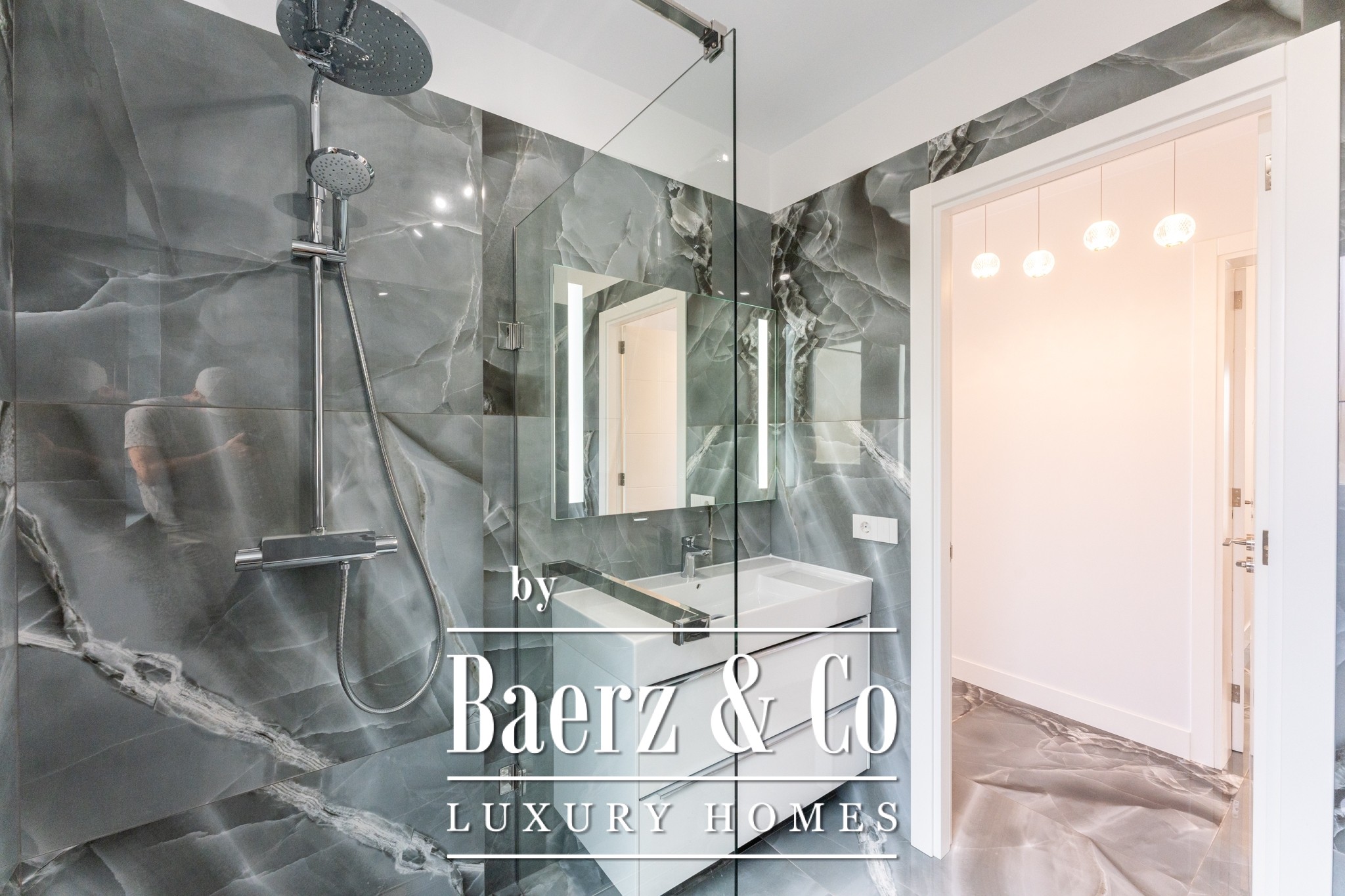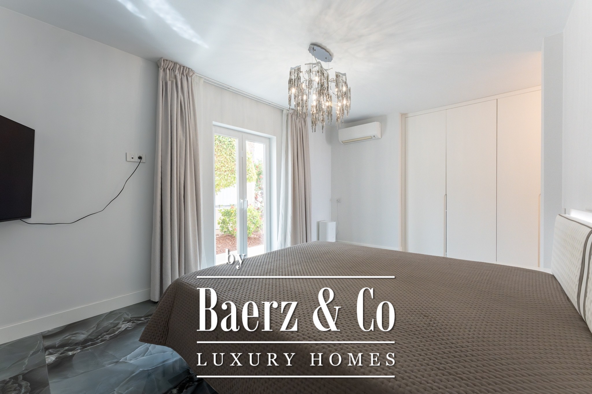 The residence presents 198 m² of living space on a 440 m² plot, comprising four bedrooms, each with an en-suite bathroom, a laundry room, and a semi-open kitchen that blends into the spacious living area. Full-length windows accentuate natural light, while the flow between interior and exterior is seamless, inviting an atmosphere of calm and clarity. Refined materials underline every detail, creating a home where quality is evident but never overstated.
