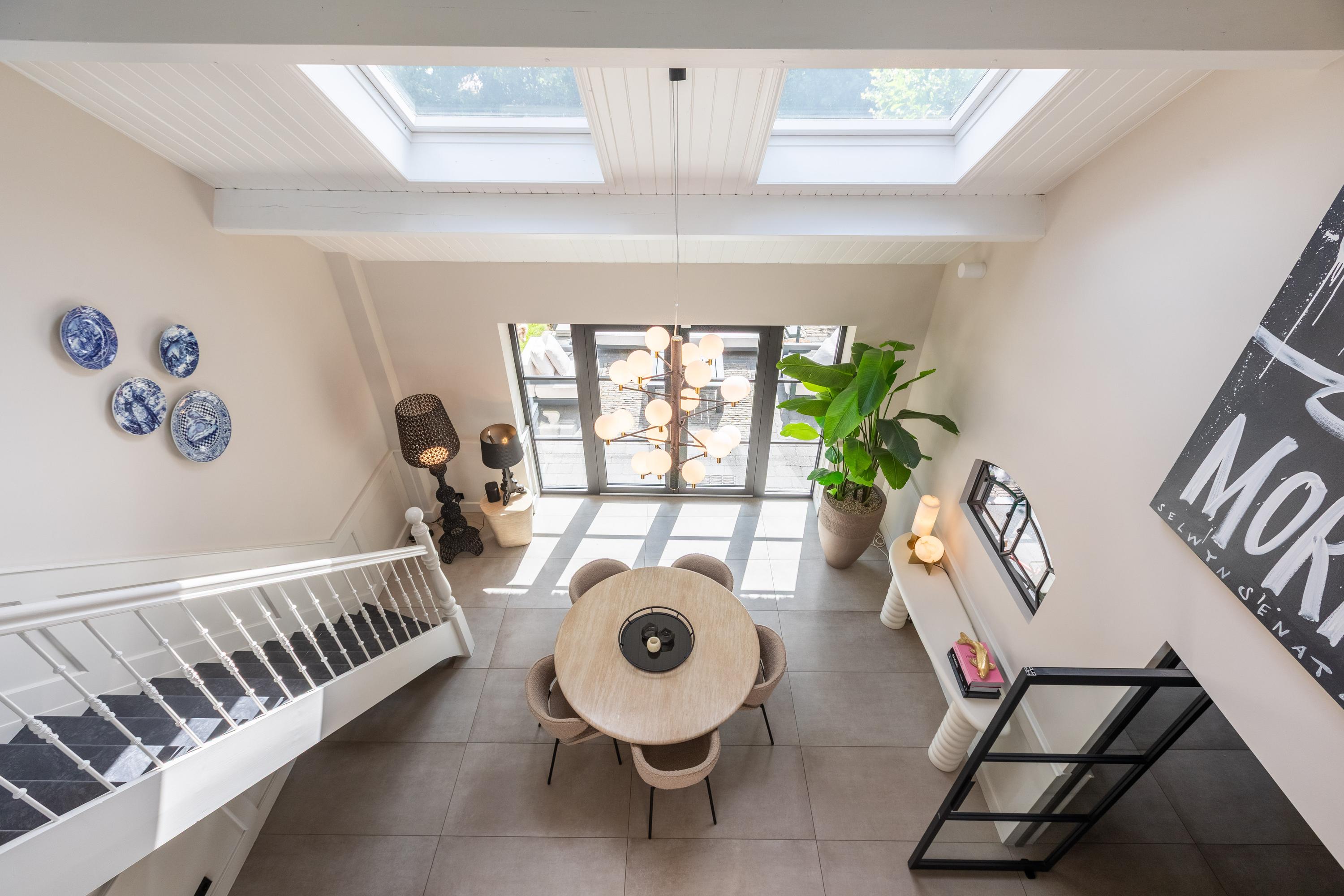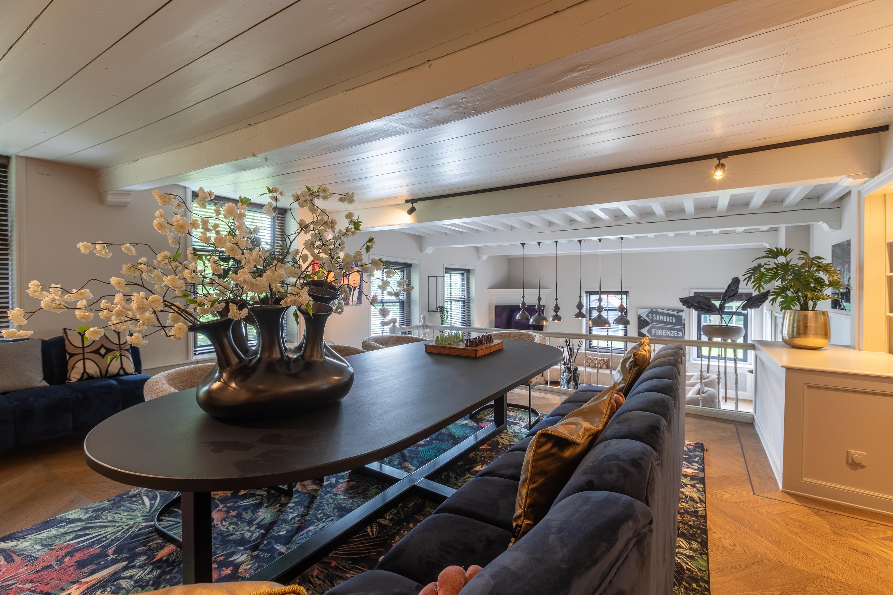 Adjacent to this is the stylish living room, consisting of two parts that can be arranged according to your own wishes. Currently, the dining room is located in the former upper room (the raised section) and the sitting room in the lower section, where the characteristic beamed ceiling immediately catches the eye. If desired, the dining room and living room can easily be swapped.