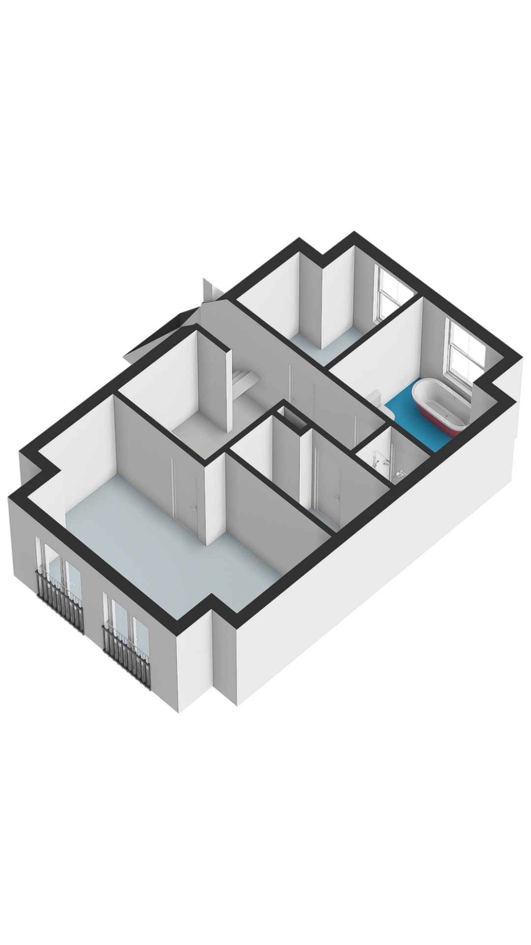Landing with access to 2 bedrooms, one of which is a very spacious (master) bedroom at the rear with French balconies and a view of the water. The bathroom is luxuriously finished and equipped with a freestanding bathtub, a spacious double shower with steam cabin function, and an oak vanity with double sinks. Opposite the bathroom is a spacious walk-in closet.