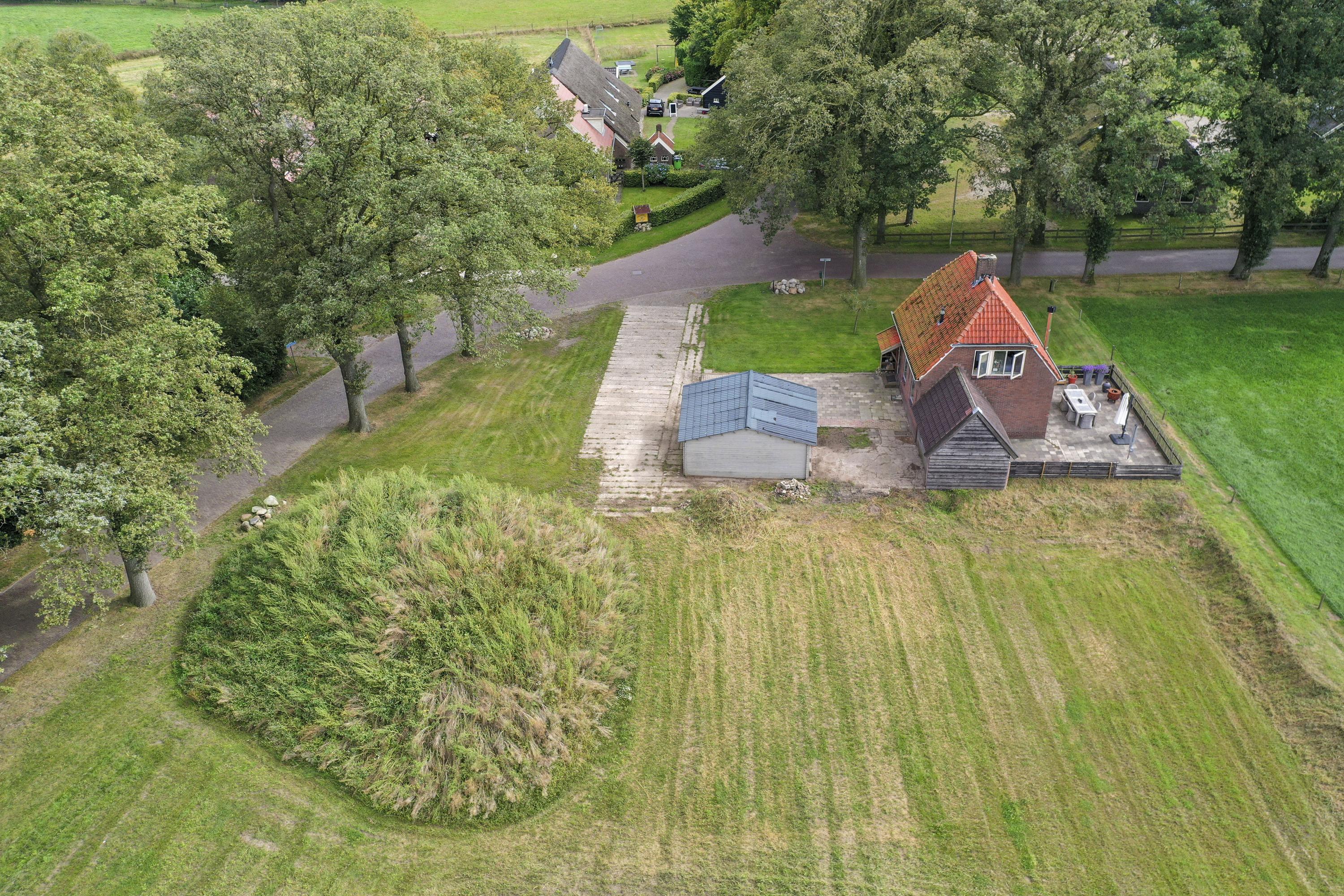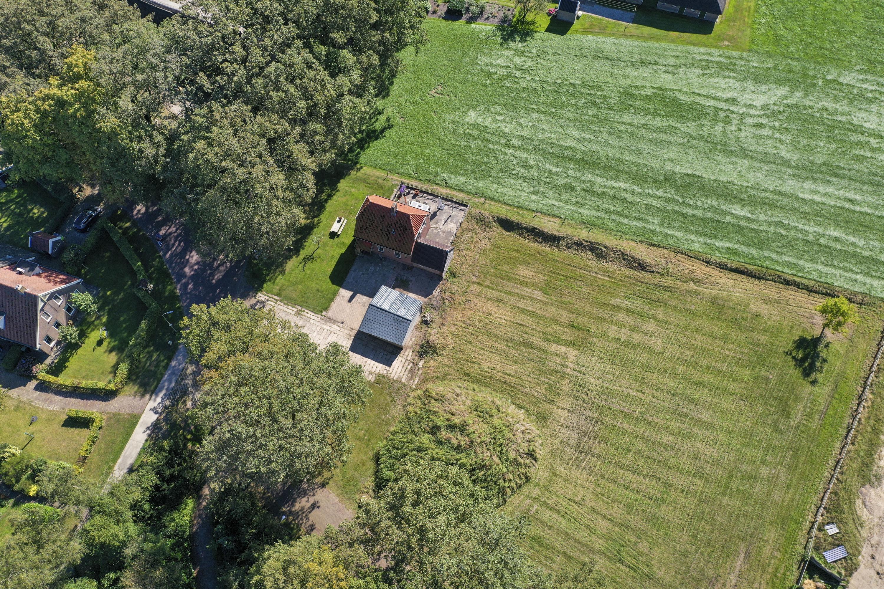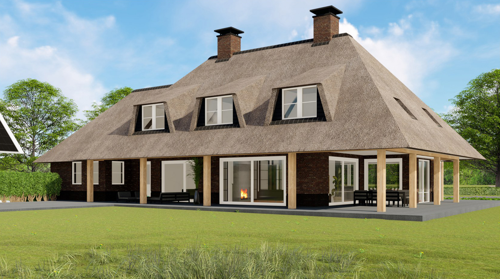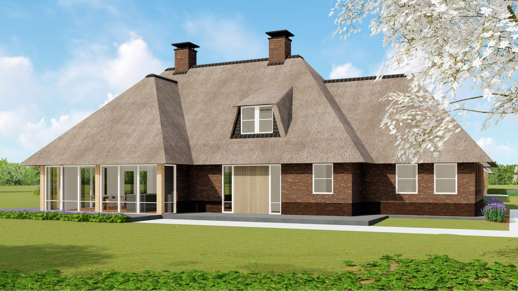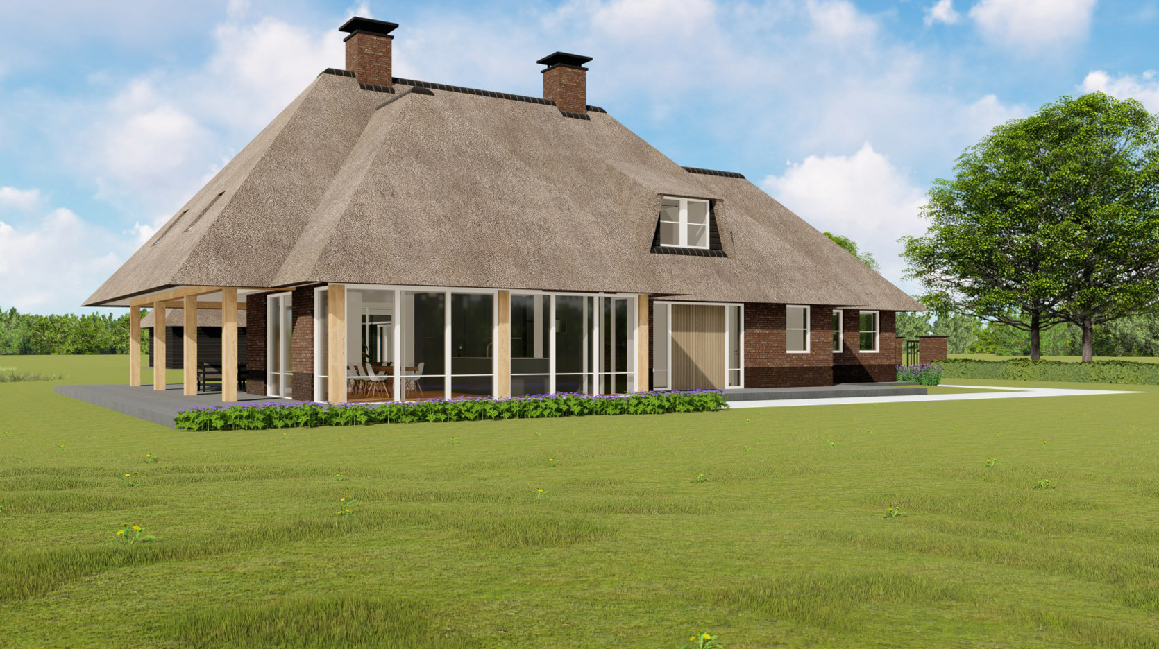 The architect involved in this design is Bekhuis & Kleinjan. The design is inspired by country living with reference to the traditional Drenthe farmhouse but with all the luxury and comfort of today. The house features thatched roofs with brick chimneys, sturdy oak beams and pillars, large windows oriented toward beautiful natural surroundings, wide roof overhangs with covered wine & dine areas, a pool house (or guesthouse) with wellness facilities, and a spacious double garage with attic and carport. All of this is arranged in a horseshoe layout to ensure maximum privacy. In addition to the construction drawings, a garden design is also available. The permit is valid indefinitely, allowing the house to be positioned freely on the plot, with the condition that the old house will be demolished. The existing house is perfectly habitable during the construction of the new residence. The existing home built in 1945, has three bedrooms, a bathroom, a semi-open kitchen, and a living room with a south-facing terrace.