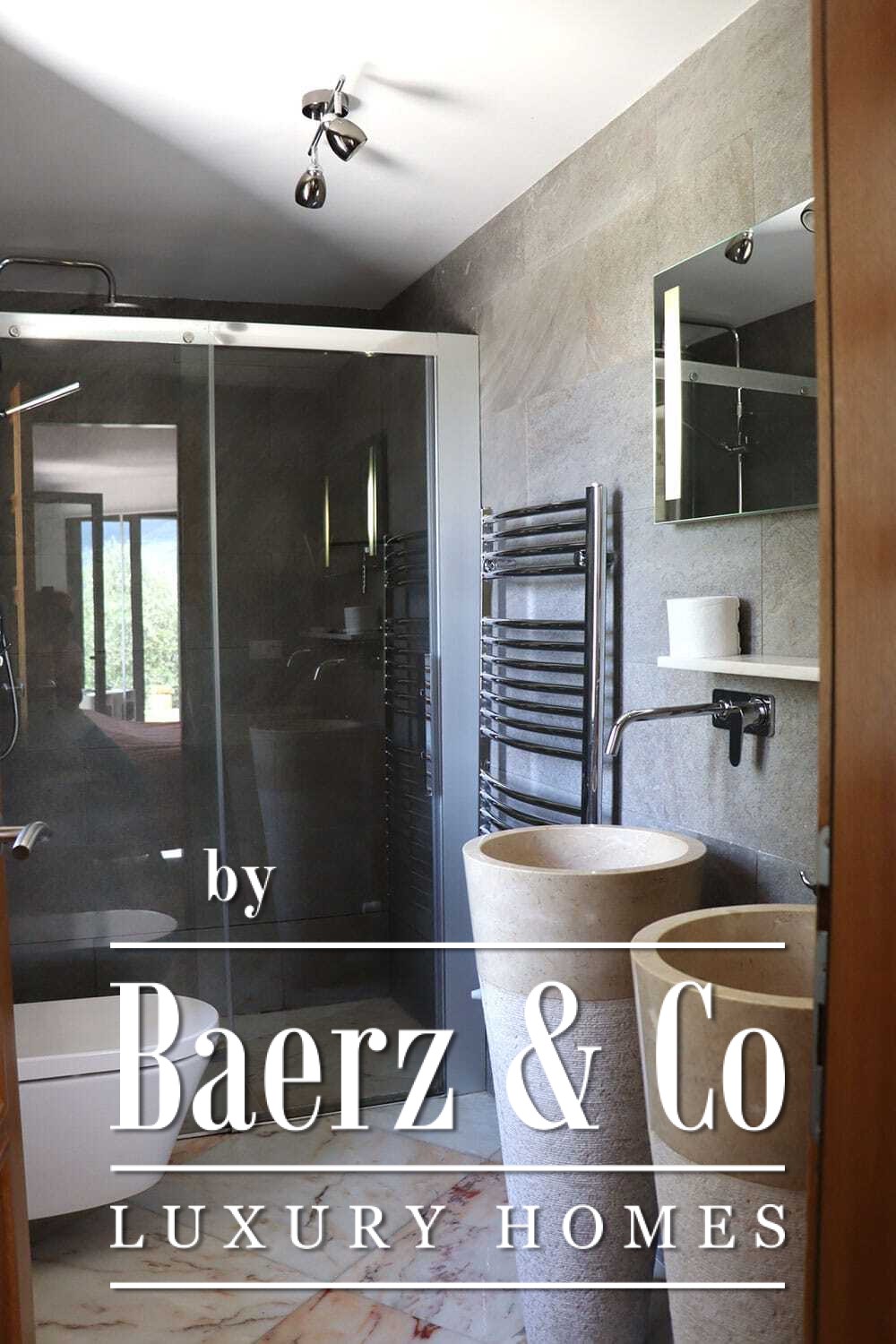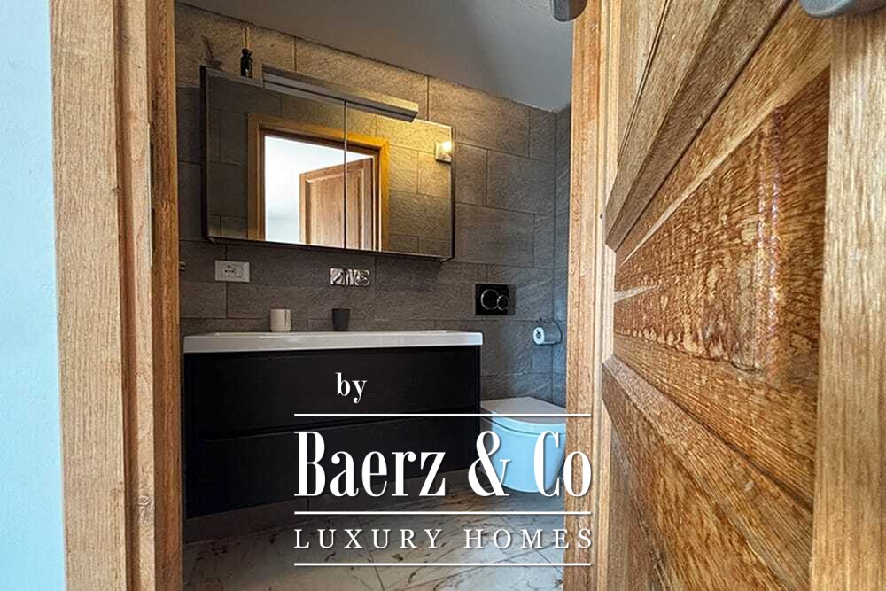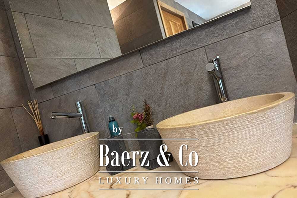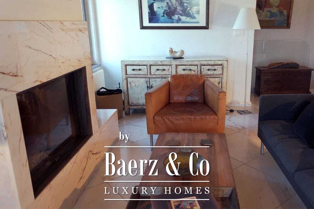Within its two floors, the villa offers four bedrooms and four bathrooms. Three ground floor bedrooms, each with French doors, open to a lower terrace and mountain vistas. The master suite features a large bath, separate shower, twin marble basins, and designer fittings, defining a sense of sanctuary. The studio bedroom, with private entrance, enhances flexibility for guests or work. Upstairs, a beamed living room with fireplace adjoins a walnut and stainless steel kitchen equipped with premium Miele appliances. High glass doors lead to a lounge with a second fireplace and access to terraces finished with granite tables and Philippe Starck chairs.