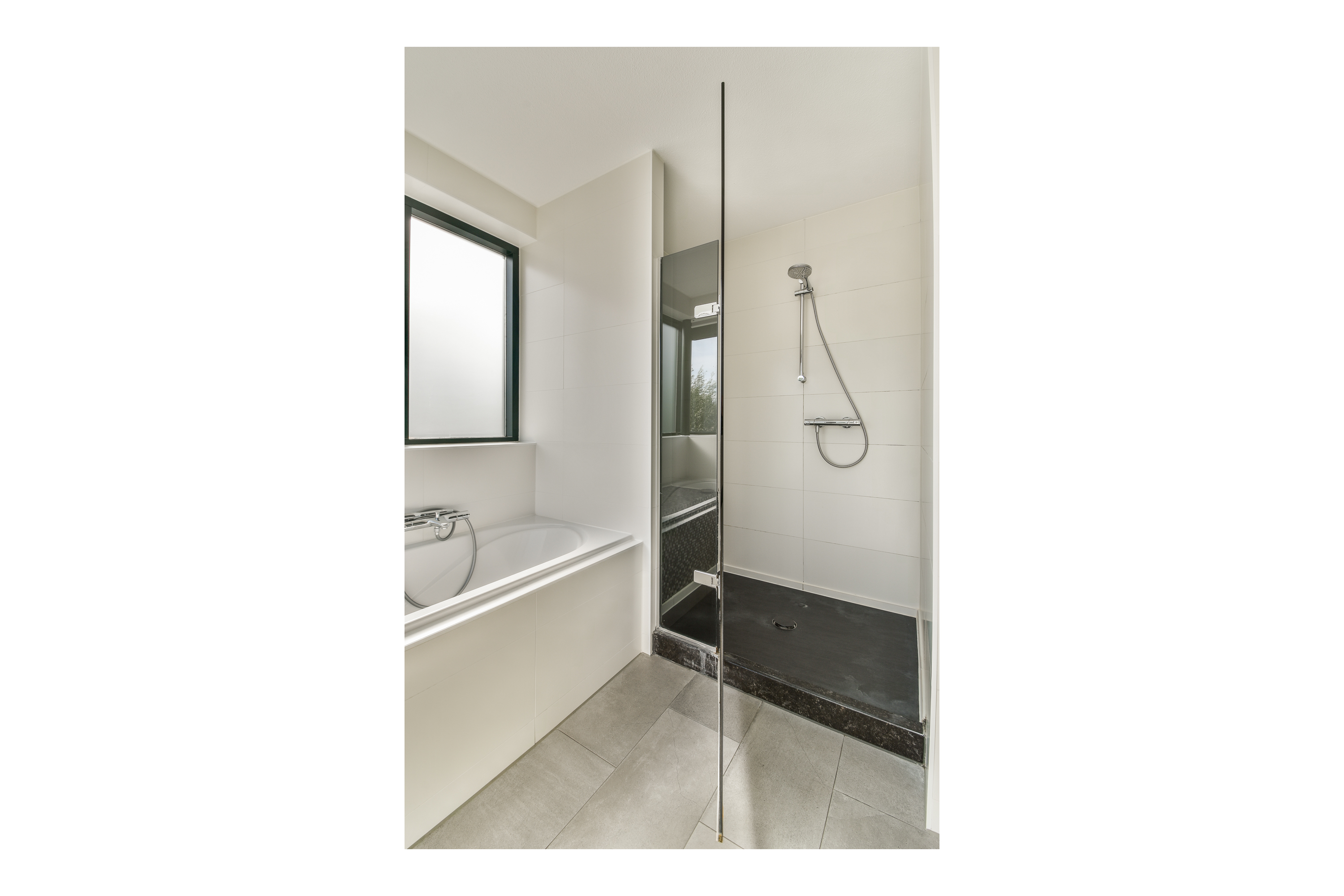 En-suite bathroom, accessible from the primary bedroom, featuring a bathtub, washbasin unit, and separate shower.