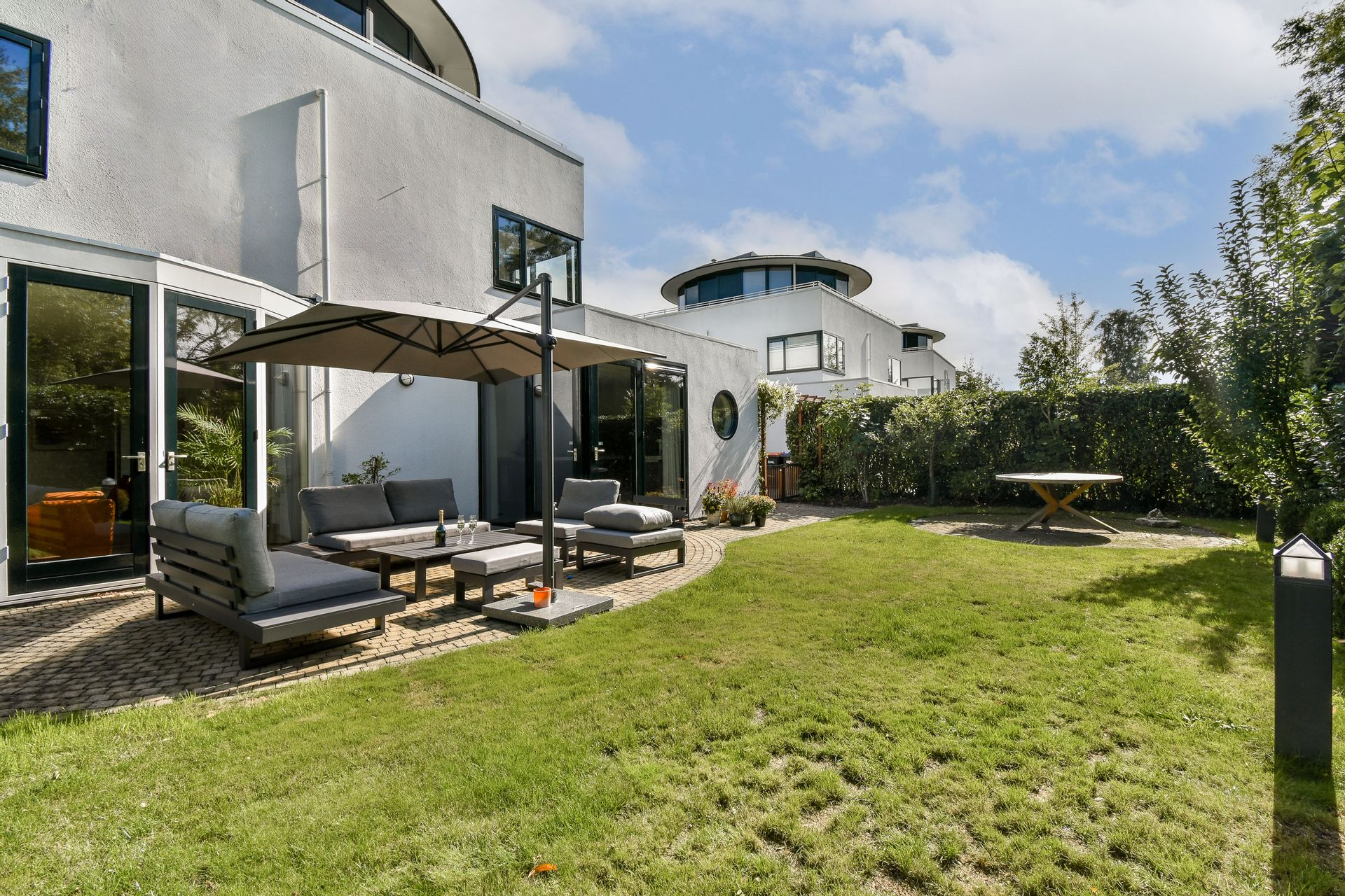 Designed by renowned architect Cees Dam, the villa was completed in 1995 and is instantly recognisable by its distinctive architecture, featuring a harmonious interplay of clean lines and rounded contours. The front of the property borders a wide water feature and is accessed via a bridge shared with the neighbouring home. The rear garden is expansive, beautifully private, and ideally positioned to enjoy the sun throughout the afternoon and evening with its west-facing orientation.