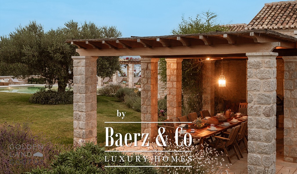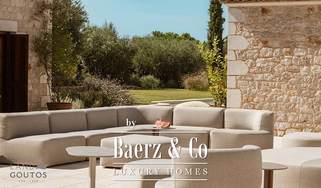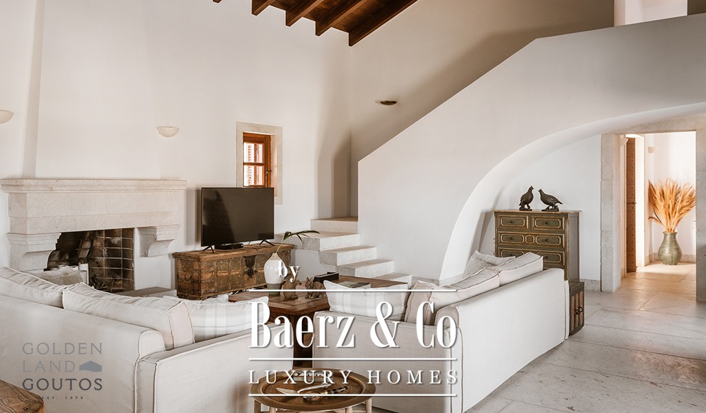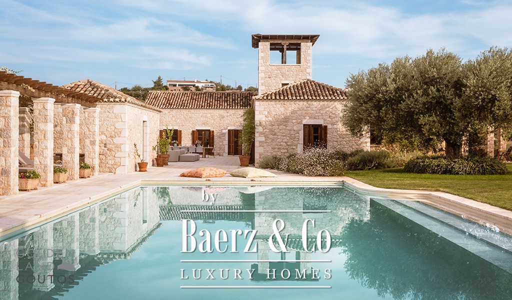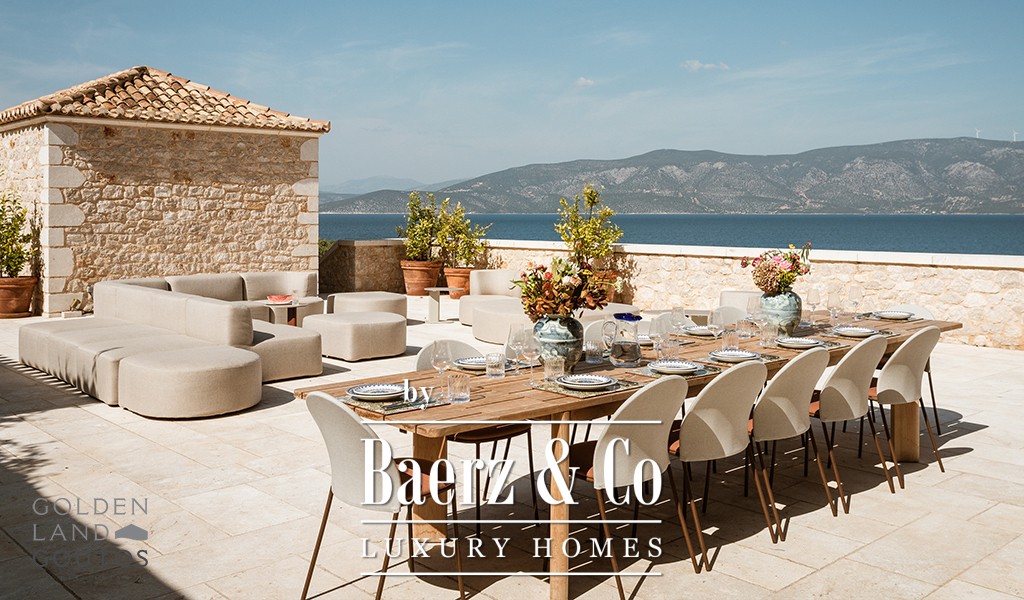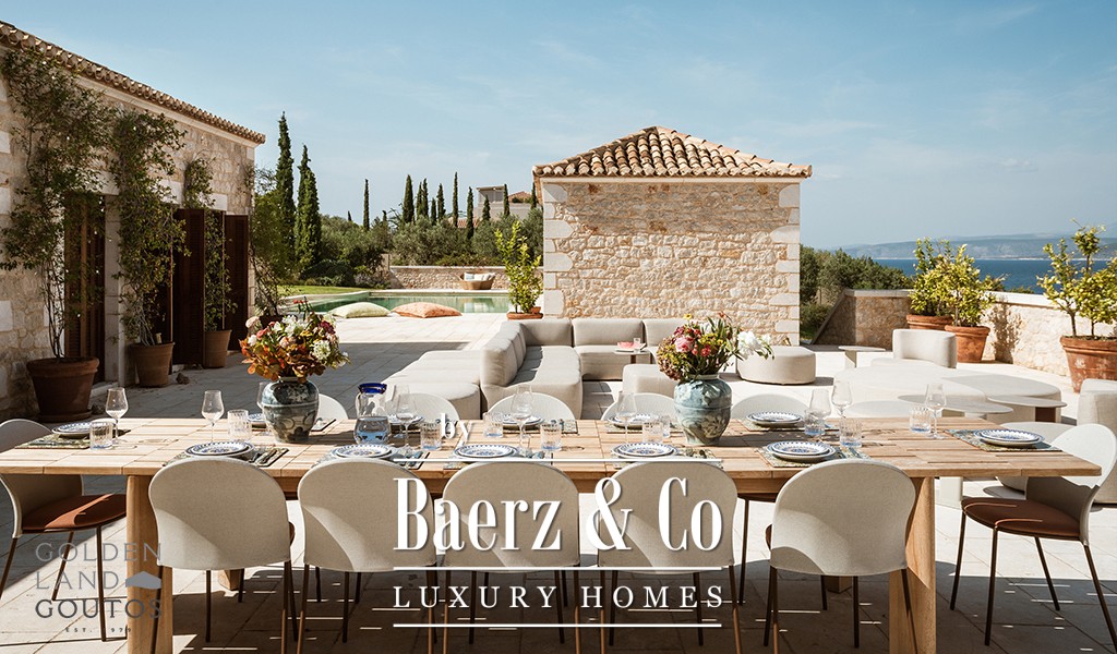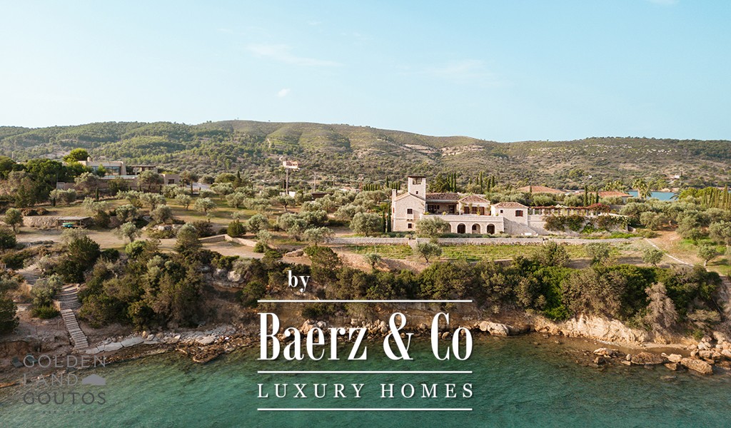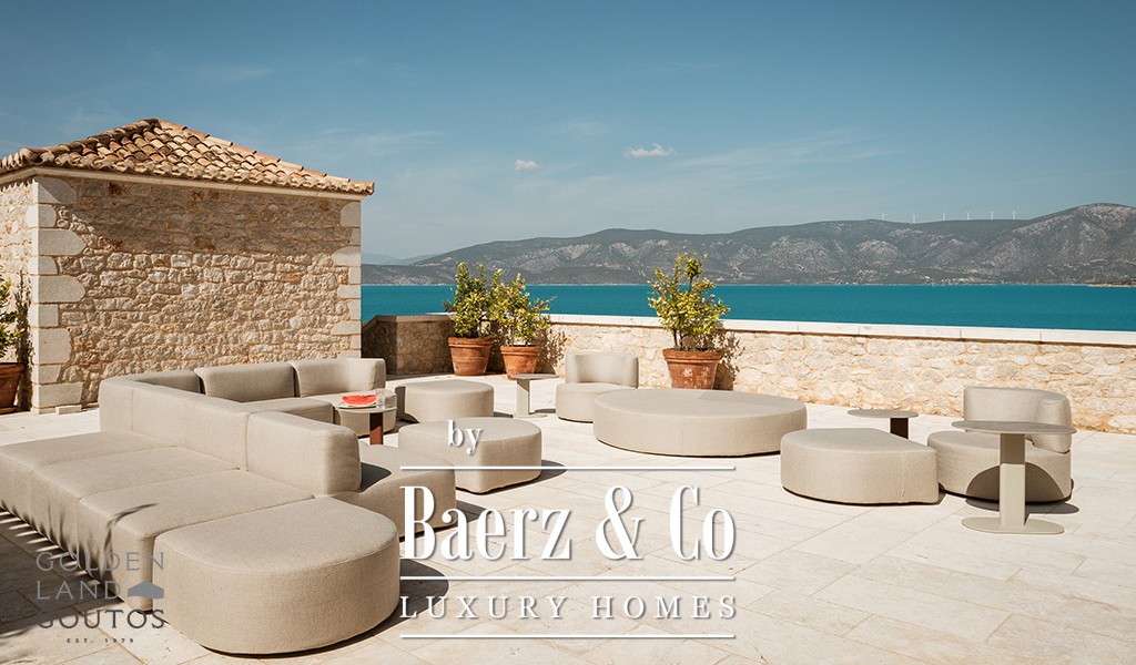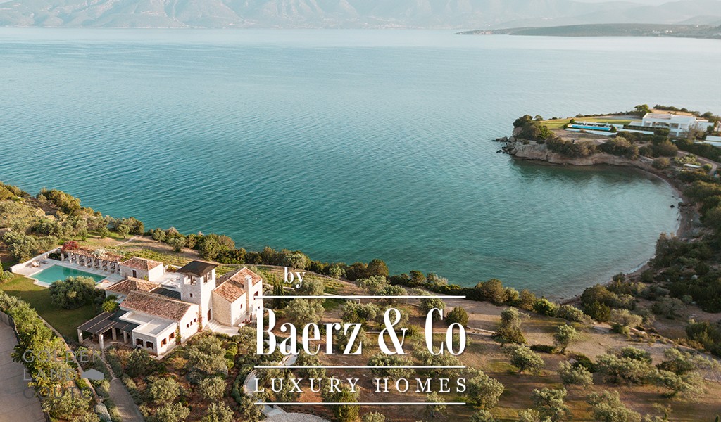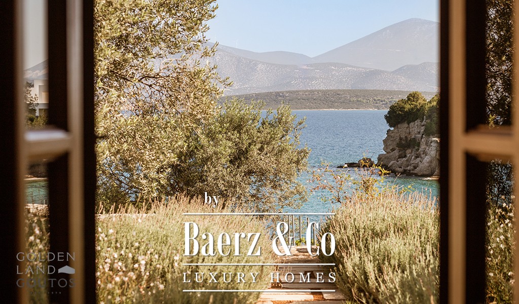Seafront villa Doroufi resides along the crystal waters of Greece, delivering 700 m² of refined living across 11,000 m² of lush grounds. This property sits on a semi-private beach with its own dock, offering rare privacy and immediate access to the sea. The villa’s architecture blends French countryside elegance with the rustic grace of Greece, its stone façade opening to interiors that whisper restraint and sophistication. Eight bedrooms provide space for family and guests, each benefitting from the villa’s careful orientation, ushering in light and framing sweeping sunsets.
