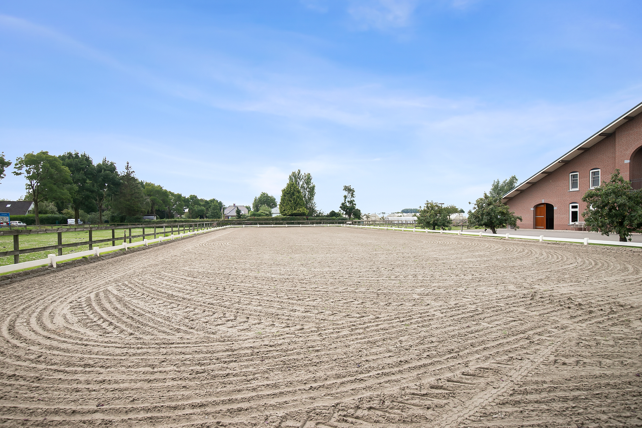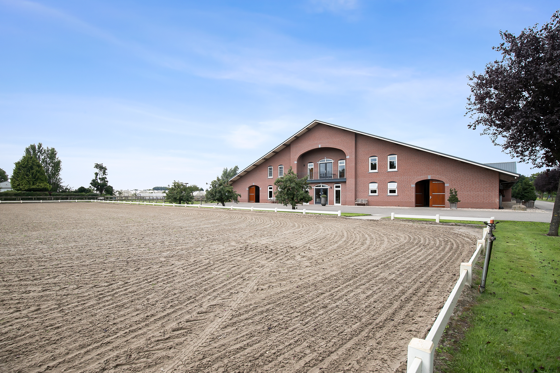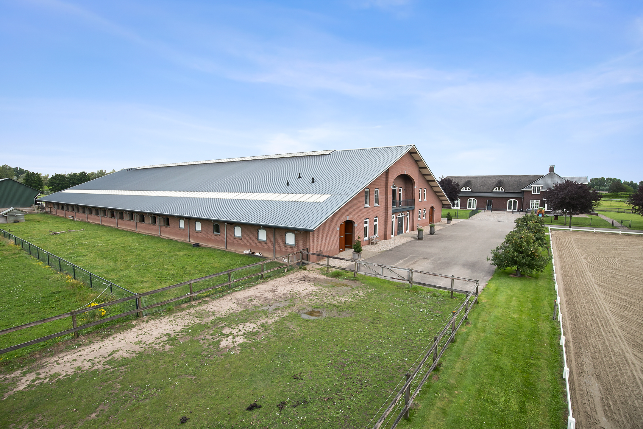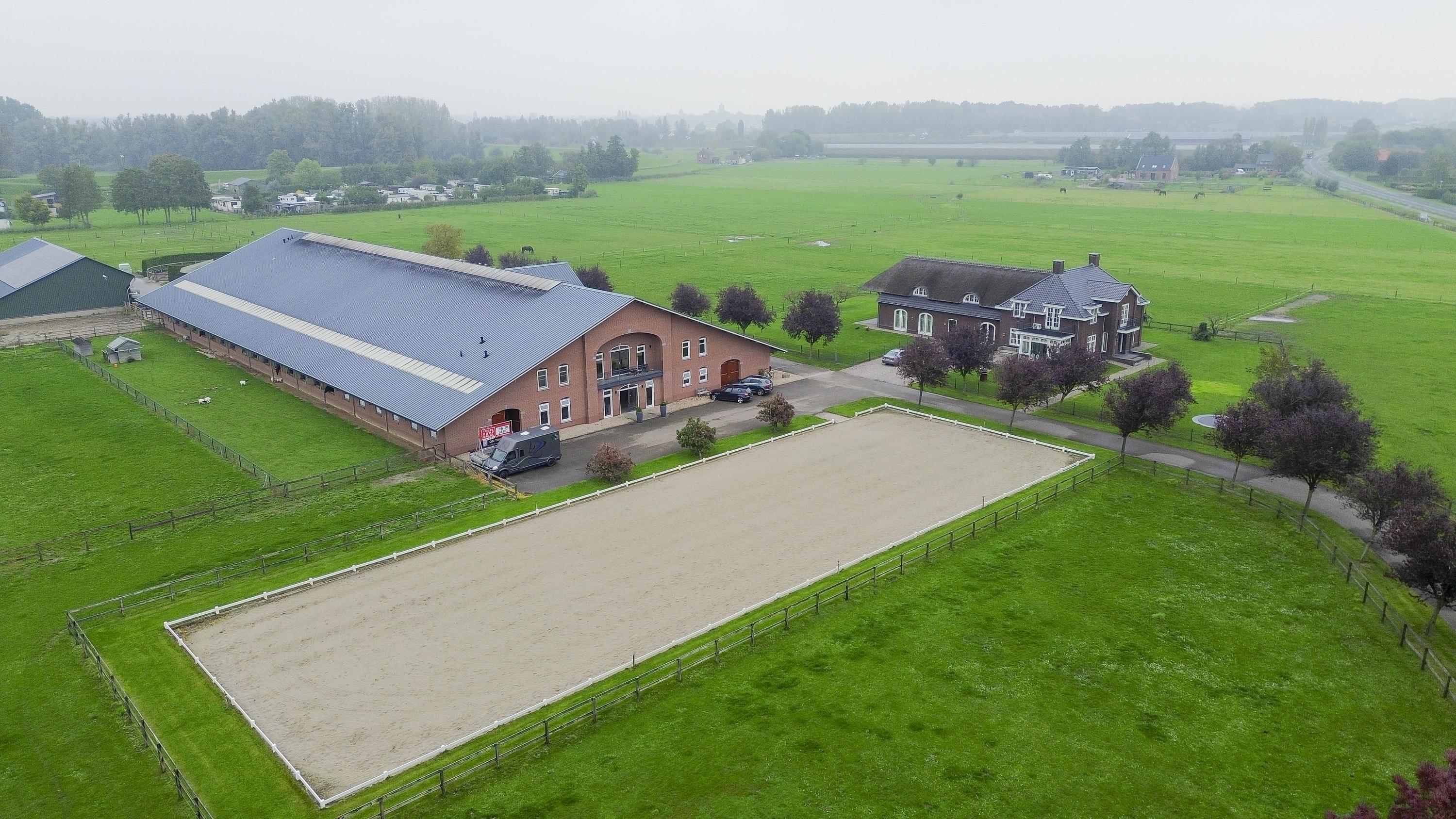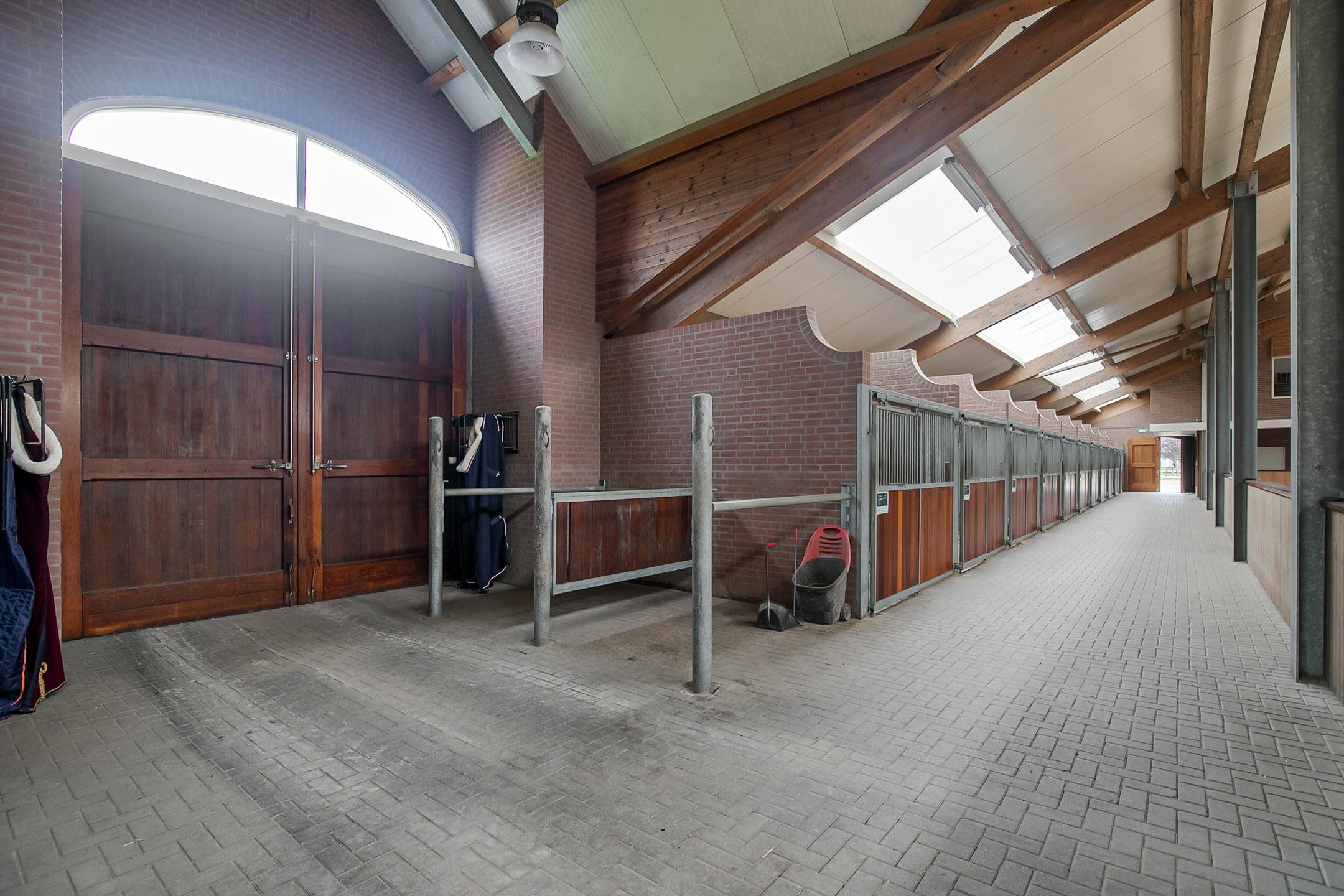The hall at the front of the riding hall has a cobbled floor and provides access to a storeroom, toilet rooms, laundry room and a shop area. A spiral staircase provides access to the 1st floor. The reception area and a flat are located here. The reception area has a tiled floor, stucco walls and a suspended ceiling. There is a kitchenette and bar. French doors provide access to a balcony at the front of the riding hall. Large windows offer nice views of the indoor arena and stables. There is also access from the reception area to a balcony above the indoor arena.The flat is equipped with a living room with open kitchen, 2 bedrooms and a spacious bathroom. The flat has a tiled floor. The kitchen unit features a sink, induction hob, dishwasher, fridge and combination microwave. The bathroom is fully tiled and further equipped with a shower room, washbasin with cabinet and a floating toilet. A laundry room is located behind a practical sliding wall. The indoor arena (approx. 21x61 m) is equipped with a professional soil (Ben Agterberg), a beautiful hardwood arena edge. Vaulted wooden rafters add to the atmosphere. A skylight in the ridge provides beautiful natural light. LED lighting is also available. The 39 horse stalls are divided over two stall corridors. The stalls have partly hardwood / partly galvanised front walls and masonry partitions and rear walls. The doors of the stalls are hinged. The stalls are also equipped with an outside hatch. Each stall corridor has its own facilities such as washing areas and a tack room. Between the corridors there are three spacious loose boxes. The washing areas are equipped with hot and cold water supply. There is also a place for the farrier and physio. There is another flat at the rear. Access is gained via a flight of stairs on the outside. There is also a balcony here. The flat features a spacious living room with open kitchen, 3 bedrooms, a spacious bathroom, a utility room, laundry room and a toilet room.At the rear of the plot is a detached field barn situated. The barn is constructed of masonry skirting with sheet pile walls and the insulated roof is covered with sandwich panels. At the front, the field barn is fitted with windbreak netting. There is a feed silo in the barn. There are currently 14 horse boxes and a lunging circle, but this barn is of course also extremely suitable for various other purposes.