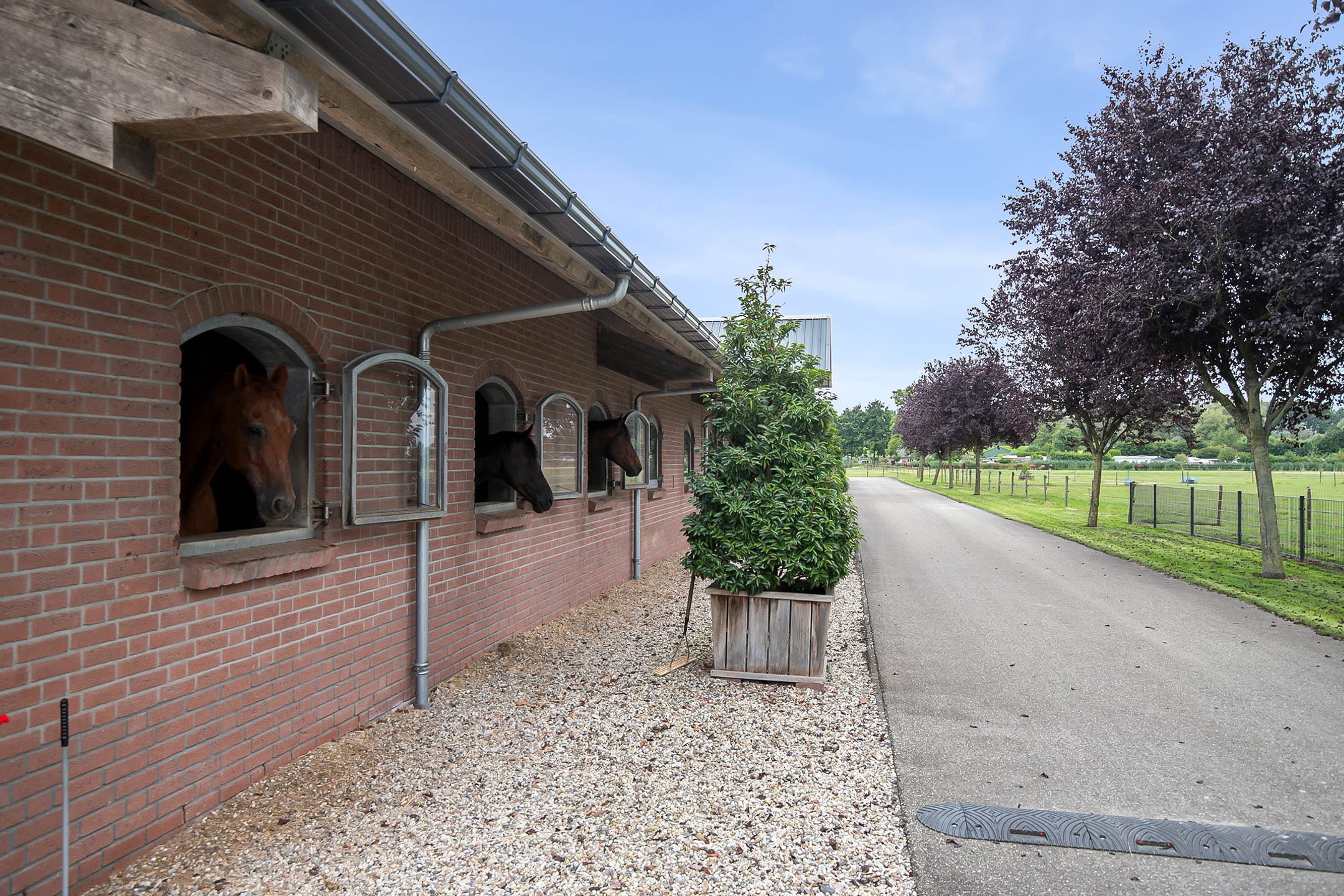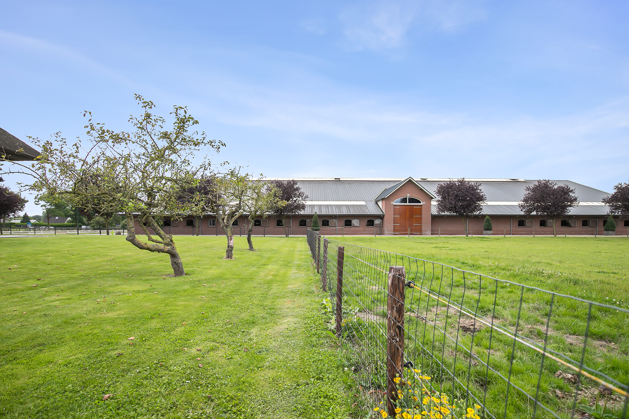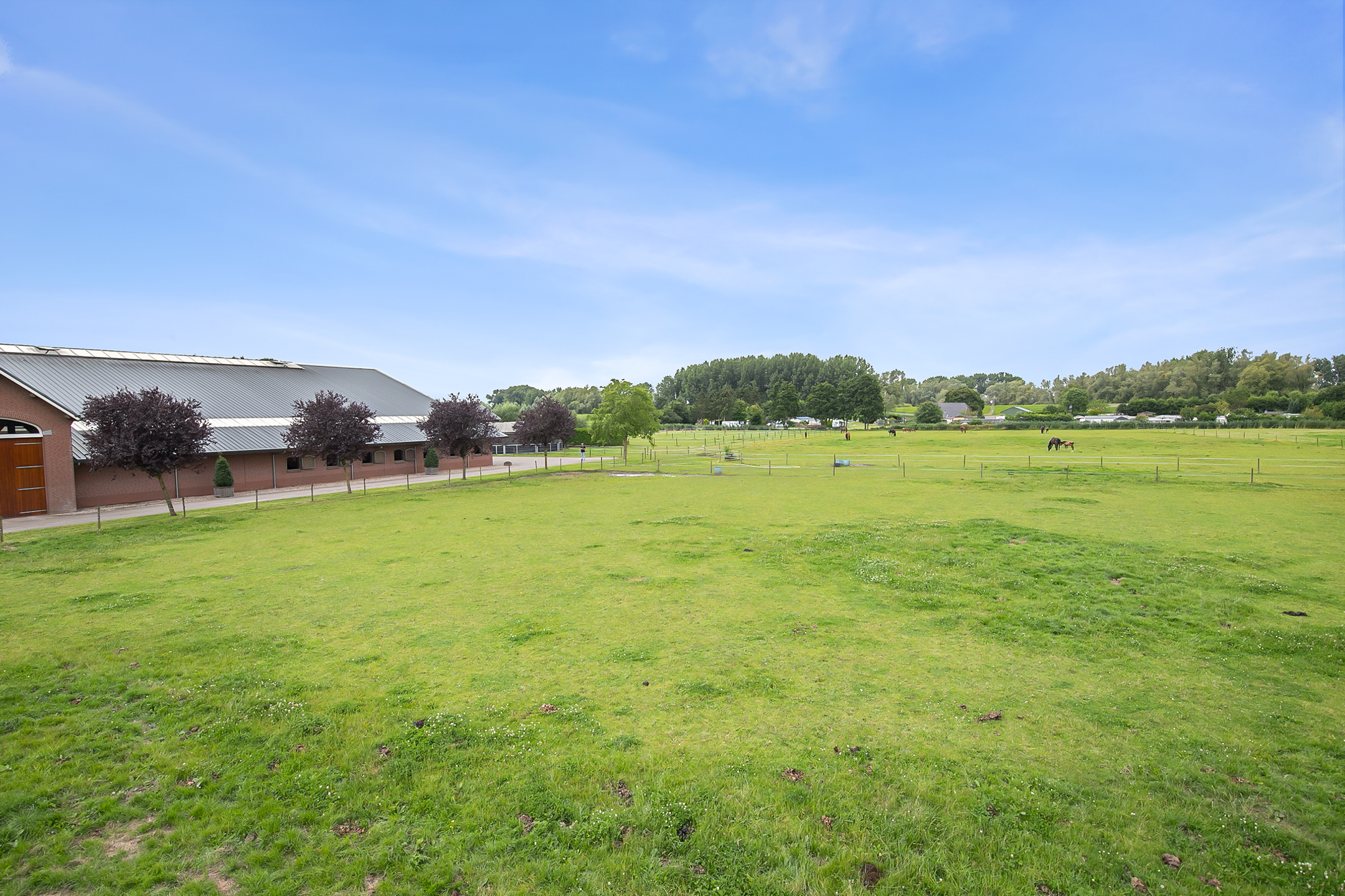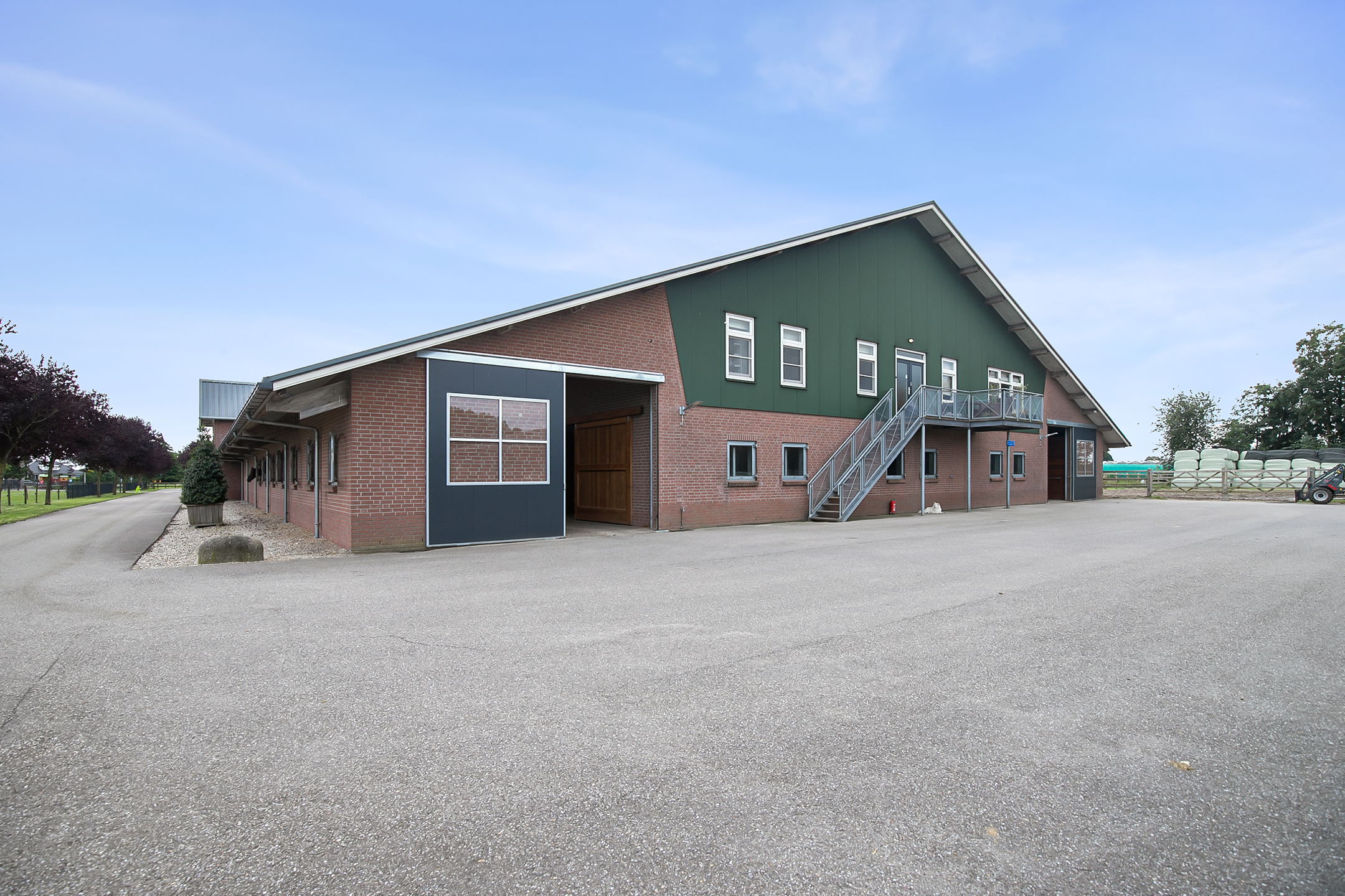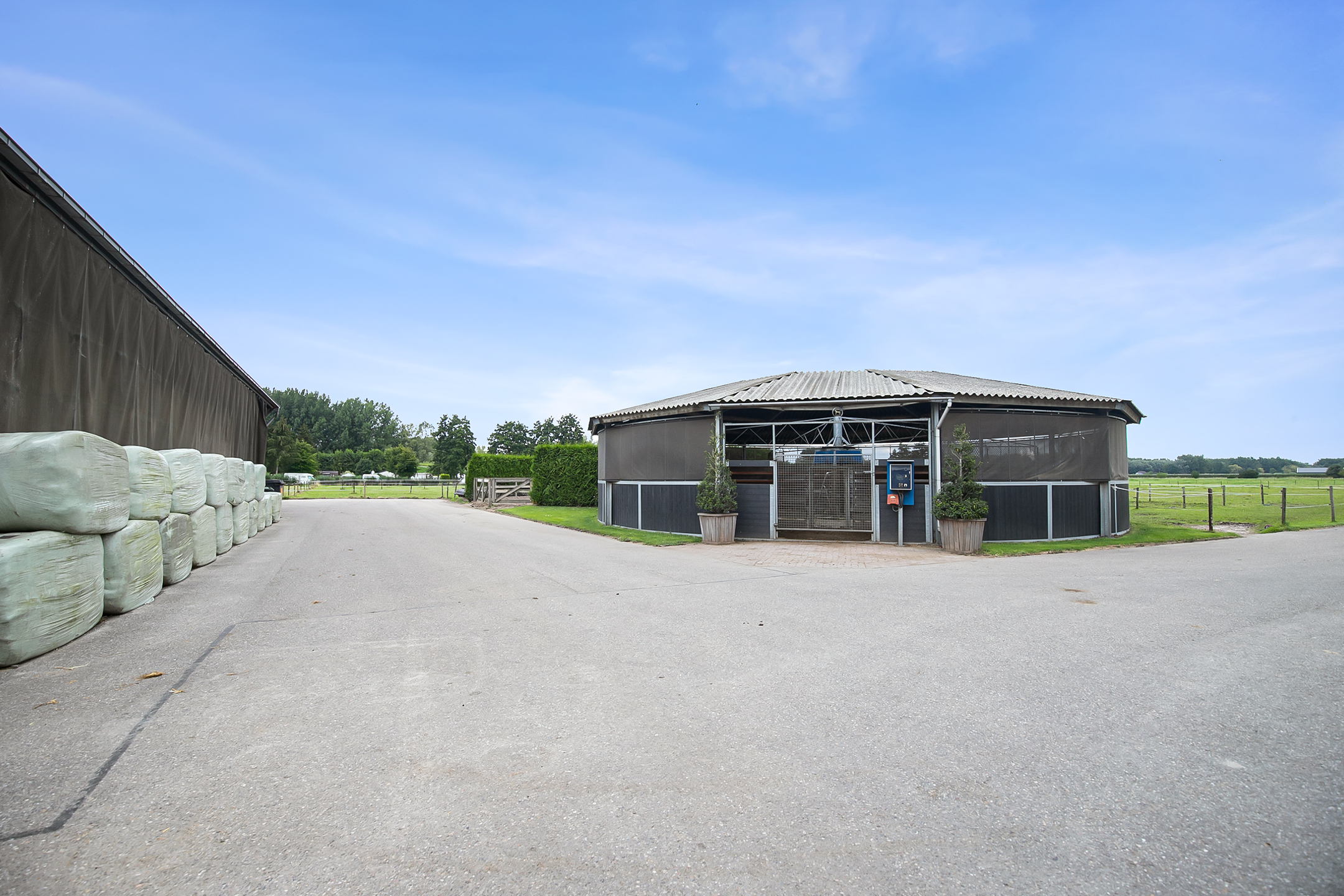 The hall at the front of the riding hall has a cobbled floor and provides access to a storeroom, toilet rooms, laundry room and a shop area. A spiral staircase provides access to the 1st floor. The reception area and a flat are located here. The reception area has a tiled floor, stucco walls and a suspended ceiling. There is a kitchenette and bar. French doors provide access to a balcony at the front of the riding hall. Large windows offer nice views of the indoor arena and stables. There is also access from the reception area to a balcony above the indoor arena.The flat is equipped with a living room with open kitchen, 2 bedrooms and a spacious bathroom. The flat has a tiled floor. The kitchen unit features a sink, induction hob, dishwasher, fridge and combination microwave. The bathroom is fully tiled and further equipped with a shower room, washbasin with cabinet and a floating toilet. A laundry room is located behind a practical sliding wall. The indoor arena (approx. 21x61 m) is equipped with a professional soil (Ben Agterberg), a beautiful hardwood arena edge. Vaulted wooden rafters add to the atmosphere. A skylight in the ridge provides beautiful natural light. LED lighting is also available. The 39 horse stalls are divided over two stall corridors. The stalls have partly hardwood / partly galvanised front walls and masonry partitions and rear walls. The doors of the stalls are hinged. The stalls are also equipped with an outside hatch. Each stall corridor has its own facilities such as washing areas and a tack room. Between the corridors there are three spacious loose boxes. The washing areas are equipped with hot and cold water supply. There is also a place for the farrier and physio. There is another flat at the rear. Access is gained via a flight of stairs on the outside. There is also a balcony here. The flat features a spacious living room with open kitchen, 3 bedrooms, a spacious bathroom, a utility room, laundry room and a toilet room.At the rear of the plot is a detached field barn situated. The barn is constructed of masonry skirting with sheet pile walls and the insulated roof is covered with sandwich panels. At the front, the field barn is fitted with windbreak netting. There is a feed silo in the barn. There are currently 14 horse boxes and a lunging circle, but this barn is of course also extremely suitable for various other purposes.