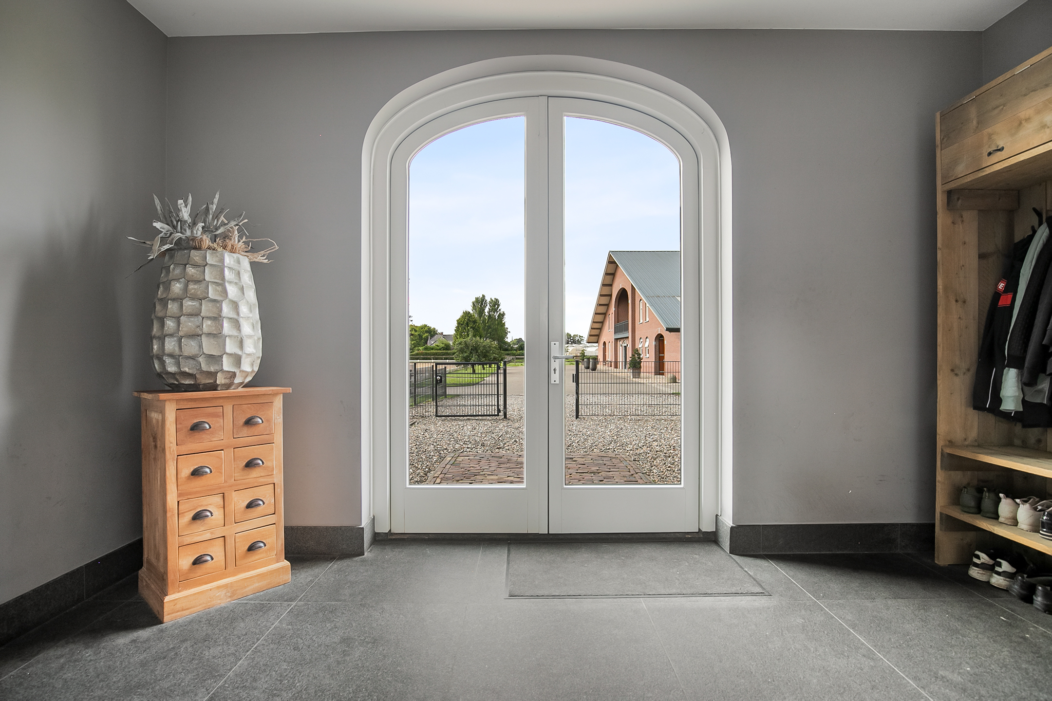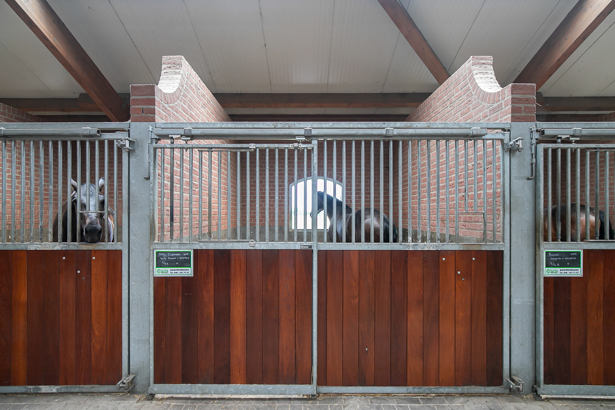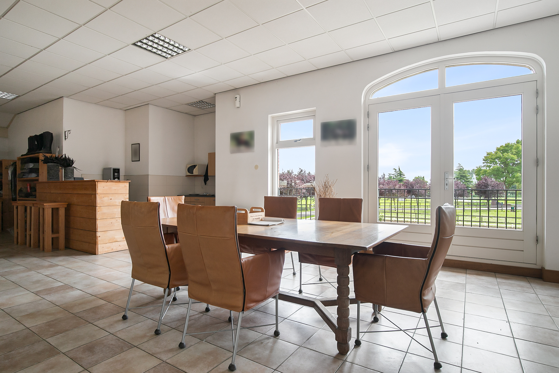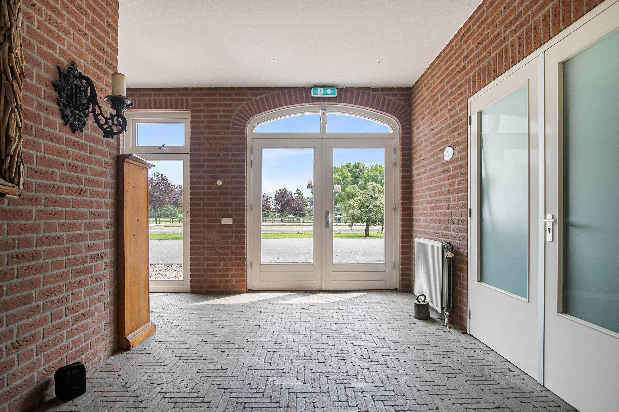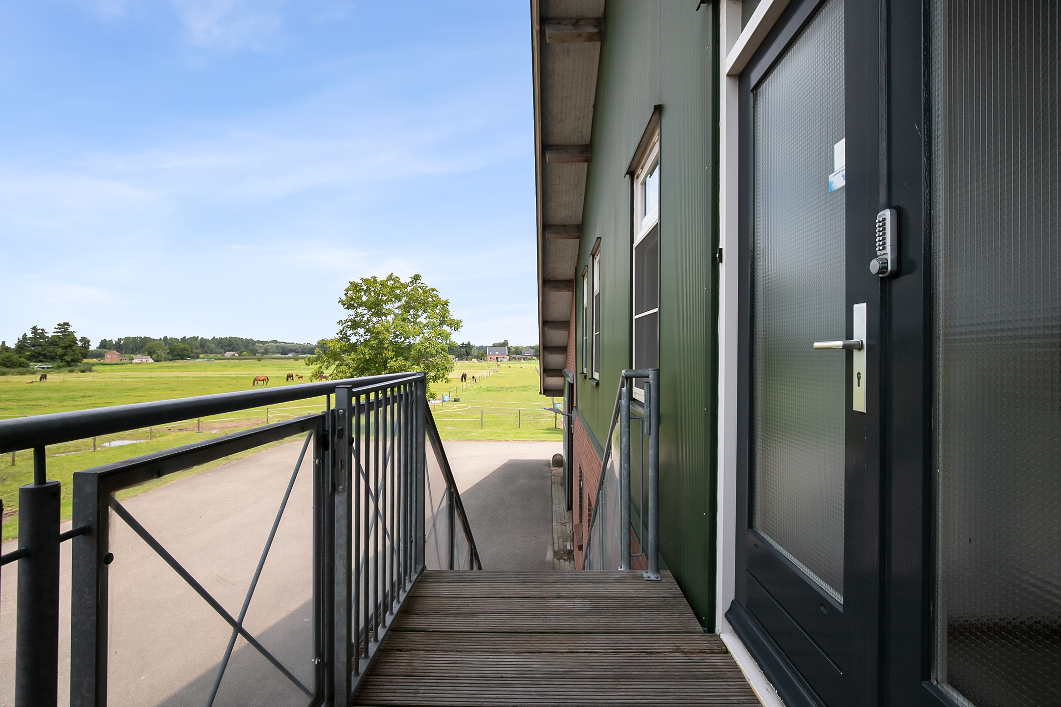 The hall at the front of the riding hall has a cobbled floor and provides access to a storeroom, toilet rooms, laundry room and a shop area. A spiral staircase provides access to the 1st floor. The reception area and a flat are located here. The reception area has a tiled floor, stucco walls and a suspended ceiling. There is a kitchenette and bar. French doors provide access to a balcony at the front of the riding hall. Large windows offer nice views of the indoor arena and stables. There is also access from the reception area to a balcony above the indoor arena.The flat is equipped with a living room with open kitchen, 2 bedrooms and a spacious bathroom. The flat has a tiled floor. The kitchen unit features a sink, induction hob, dishwasher, fridge and combination microwave. The bathroom is fully tiled and further equipped with a shower room, washbasin with cabinet and a floating toilet. A laundry room is located behind a practical sliding wall. The indoor arena (approx. 21x61 m) is equipped with a professional soil (Ben Agterberg), a beautiful hardwood arena edge. Vaulted wooden rafters add to the atmosphere. A skylight in the ridge provides beautiful natural light. LED lighting is also available. The 39 horse stalls are divided over two stall corridors. The stalls have partly hardwood / partly galvanised front walls and masonry partitions and rear walls. The doors of the stalls are hinged. The stalls are also equipped with an outside hatch. Each stall corridor has its own facilities such as washing areas and a tack room. Between the corridors there are three spacious loose boxes. The washing areas are equipped with hot and cold water supply. There is also a place for the farrier and physio. There is another flat at the rear. Access is gained via a flight of stairs on the outside. There is also a balcony here. The flat features a spacious living room with open kitchen, 3 bedrooms, a spacious bathroom, a utility room, laundry room and a toilet room.At the rear of the plot is a detached field barn situated. The barn is constructed of masonry skirting with sheet pile walls and the insulated roof is covered with sandwich panels. At the front, the field barn is fitted with windbreak netting. There is a feed silo in the barn. There are currently 14 horse boxes and a lunging circle, but this barn is of course also extremely suitable for various other purposes.