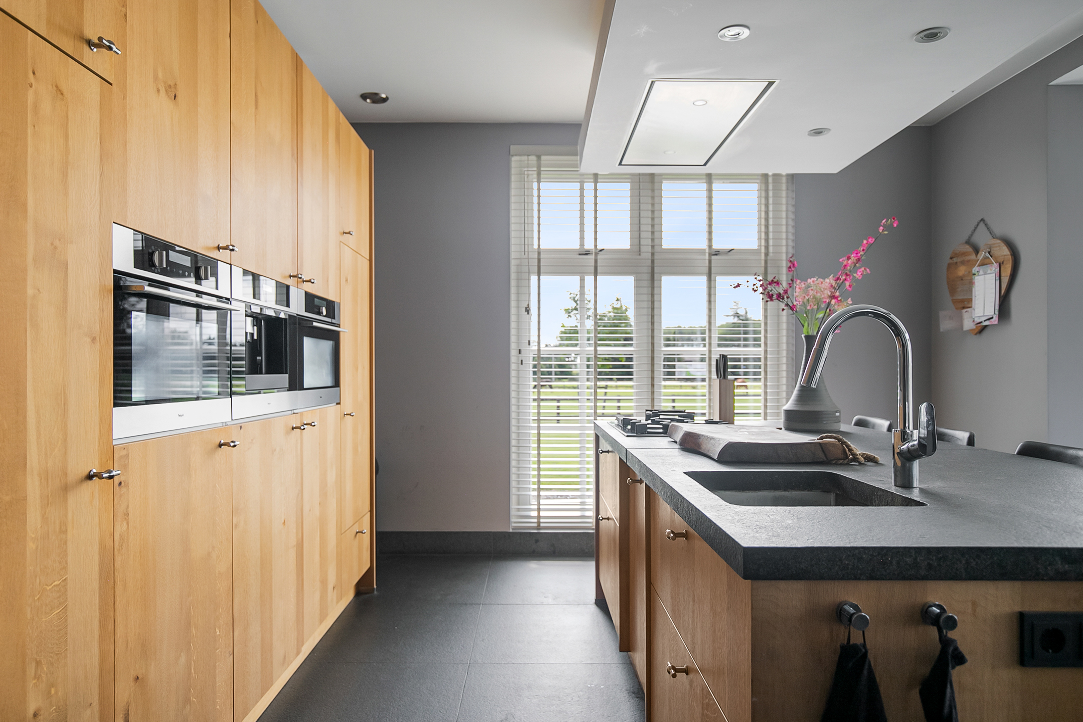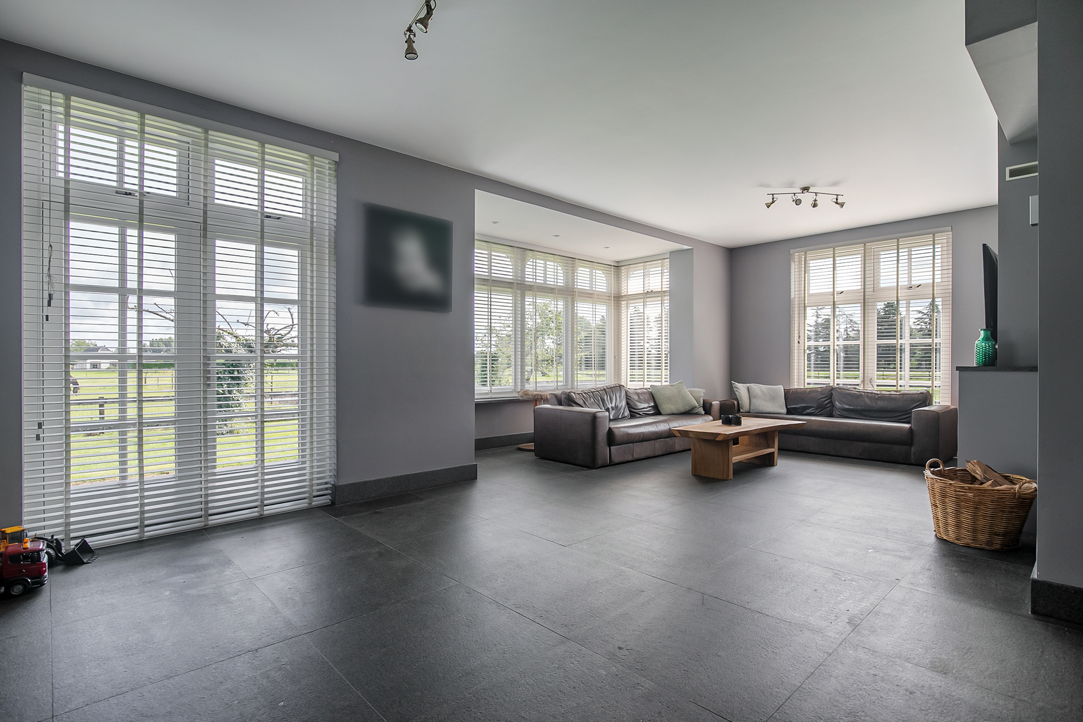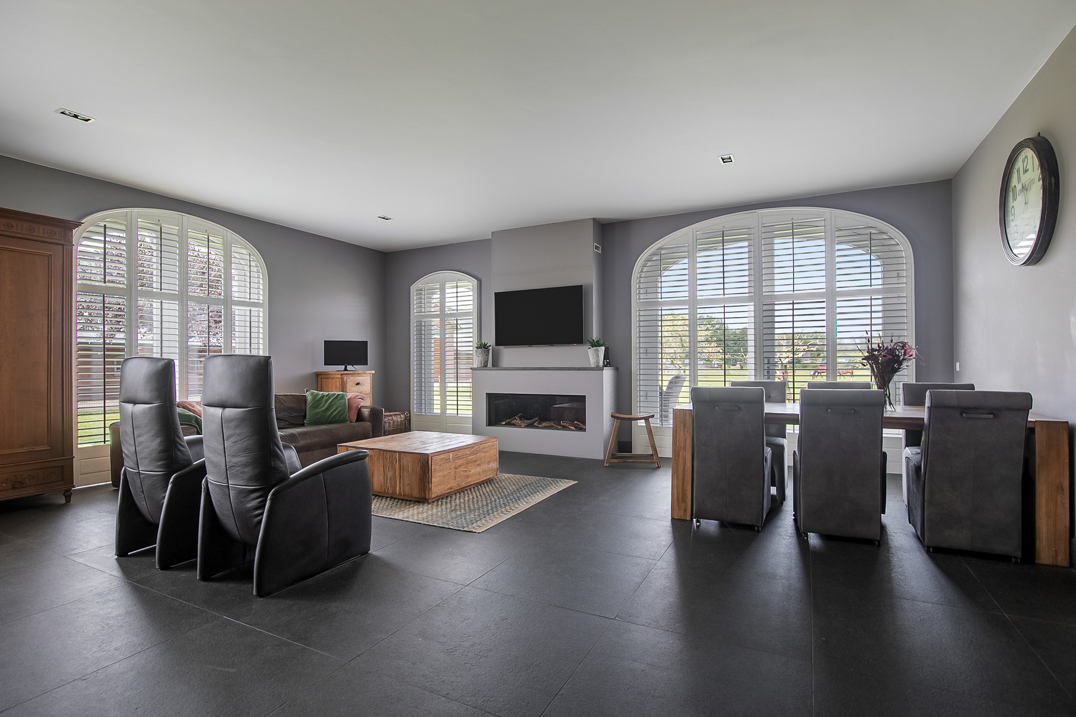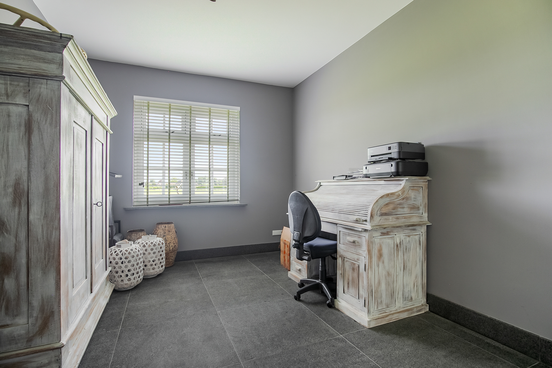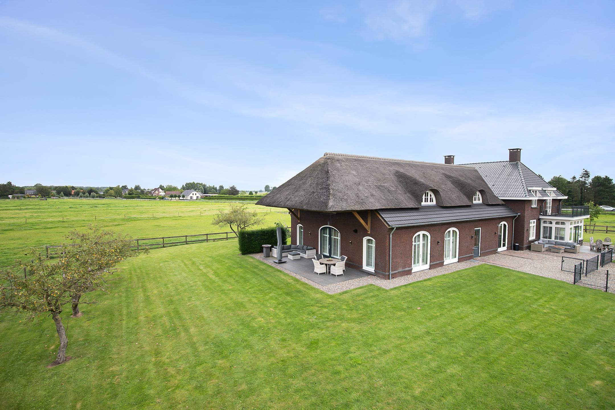 The covered entrance with a double sliding front door, gives this villa an attractive appearance. The spacious reception hall with imposing wooden staircase provides access to the living room and the 1st floor. The hall has a natural stone tiled floor, stucco walls and a stucco ceiling. The spacious living kitchen with dining area has a natural stone tiled floor, stucco walls and a stucco ceiling with recessed lighting. The kitchen features a wall-mounted unit with appliance wall and a cooking and rinsing island. The appliance wall is further equipped with an oven, coffee maker, steam oven and fridge. The island features a 5-burner gas hob with built-in extractor fan in the ceiling, a sink and a dishwasher. Various cupboards and drawers provide plenty of storage space. A large bay window/extension with French doors provide access to the garden. The many windows provide plenty of natural light. A fireplace adds atmosphere and warmth to the room. From the living room there is a nice view of the horse pastures. And here, too, large windows and double doors provide a sea of light. In addition, there is a beautiful, large fireplace with a gas fire that provides even more atmosphere and warmth in the room. Sliding doors close off the living room from the kitchen/dining area. Semi-circular French doors in the side wall of the house provide access to the front house. The spacious entrance hall provides access to the utility/laundry room, living room, toilet room and the meter cupboard. The utility/laundry room is equipped with a sink. Also located here are the connections for the washing equipment. From here, there is access to the office/workroom. The office space is a fine room which is obviously suitable for various purposes, such as a playroom or chill room.