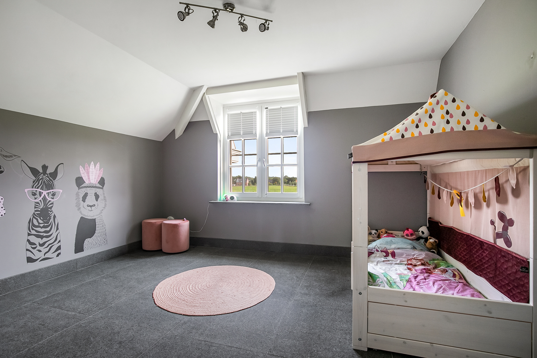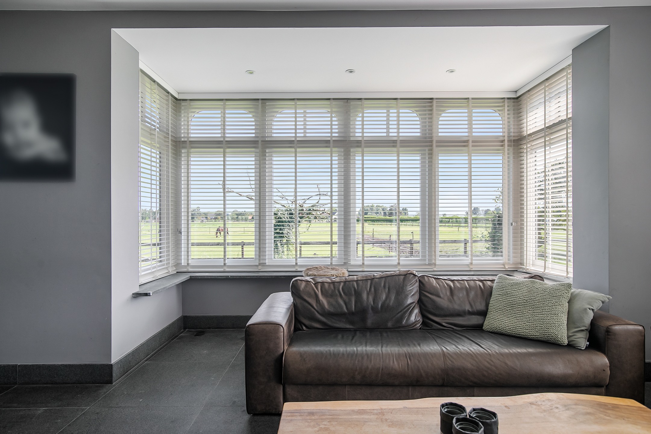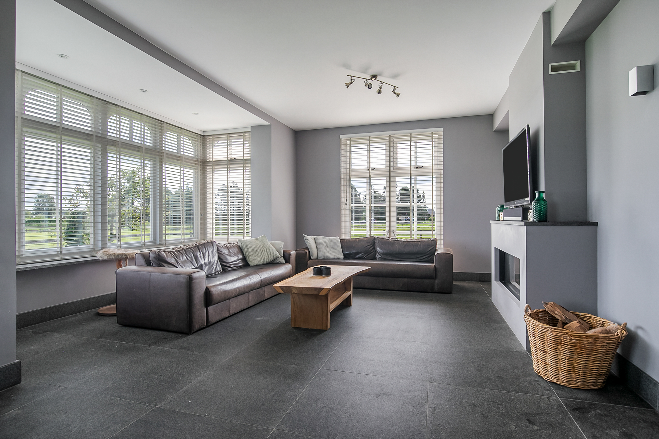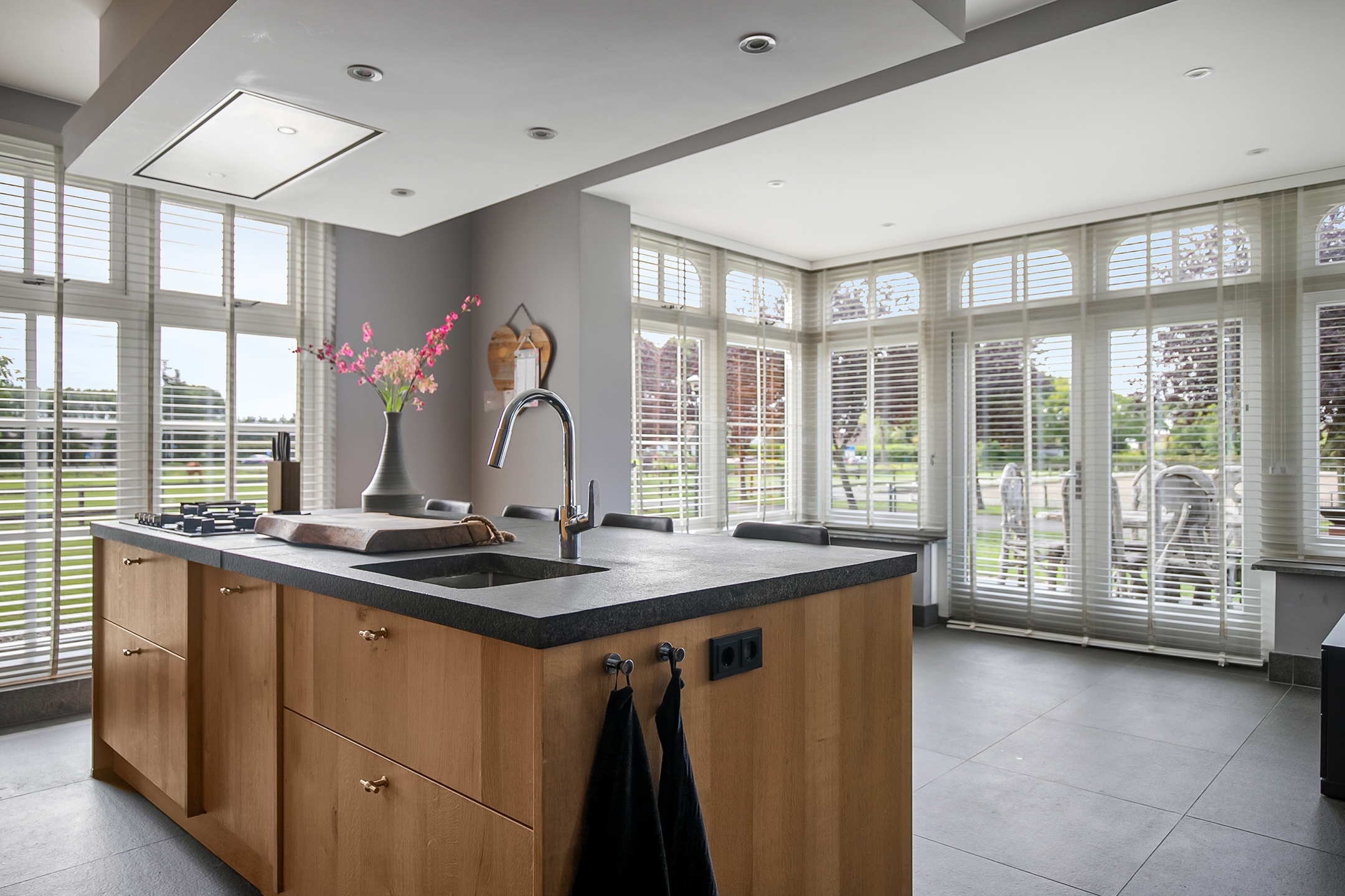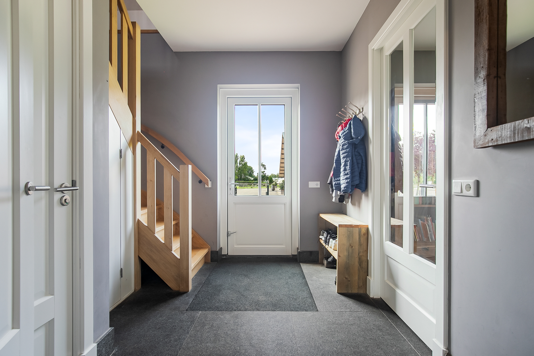 The covered entrance with a double sliding front door, gives this villa an attractive appearance. The spacious reception hall with imposing wooden staircase provides access to the living room and the 1st floor. The hall has a natural stone tiled floor, stucco walls and a stucco ceiling. The spacious living kitchen with dining area has a natural stone tiled floor, stucco walls and a stucco ceiling with recessed lighting. The kitchen features a wall-mounted unit with appliance wall and a cooking and rinsing island. The appliance wall is further equipped with an oven, coffee maker, steam oven and fridge. The island features a 5-burner gas hob with built-in extractor fan in the ceiling, a sink and a dishwasher. Various cupboards and drawers provide plenty of storage space. A large bay window/extension with French doors provide access to the garden. The many windows provide plenty of natural light. A fireplace adds atmosphere and warmth to the room. From the living room there is a nice view of the horse pastures. And here, too, large windows and double doors provide a sea of light. In addition, there is a beautiful, large fireplace with a gas fire that provides even more atmosphere and warmth in the room. Sliding doors close off the living room from the kitchen/dining area. Semi-circular French doors in the side wall of the house provide access to the front house. The spacious entrance hall provides access to the utility/laundry room, living room, toilet room and the meter cupboard. The utility/laundry room is equipped with a sink. Also located here are the connections for the washing equipment. From here, there is access to the office/workroom. The office space is a fine room which is obviously suitable for various purposes, such as a playroom or chill room.