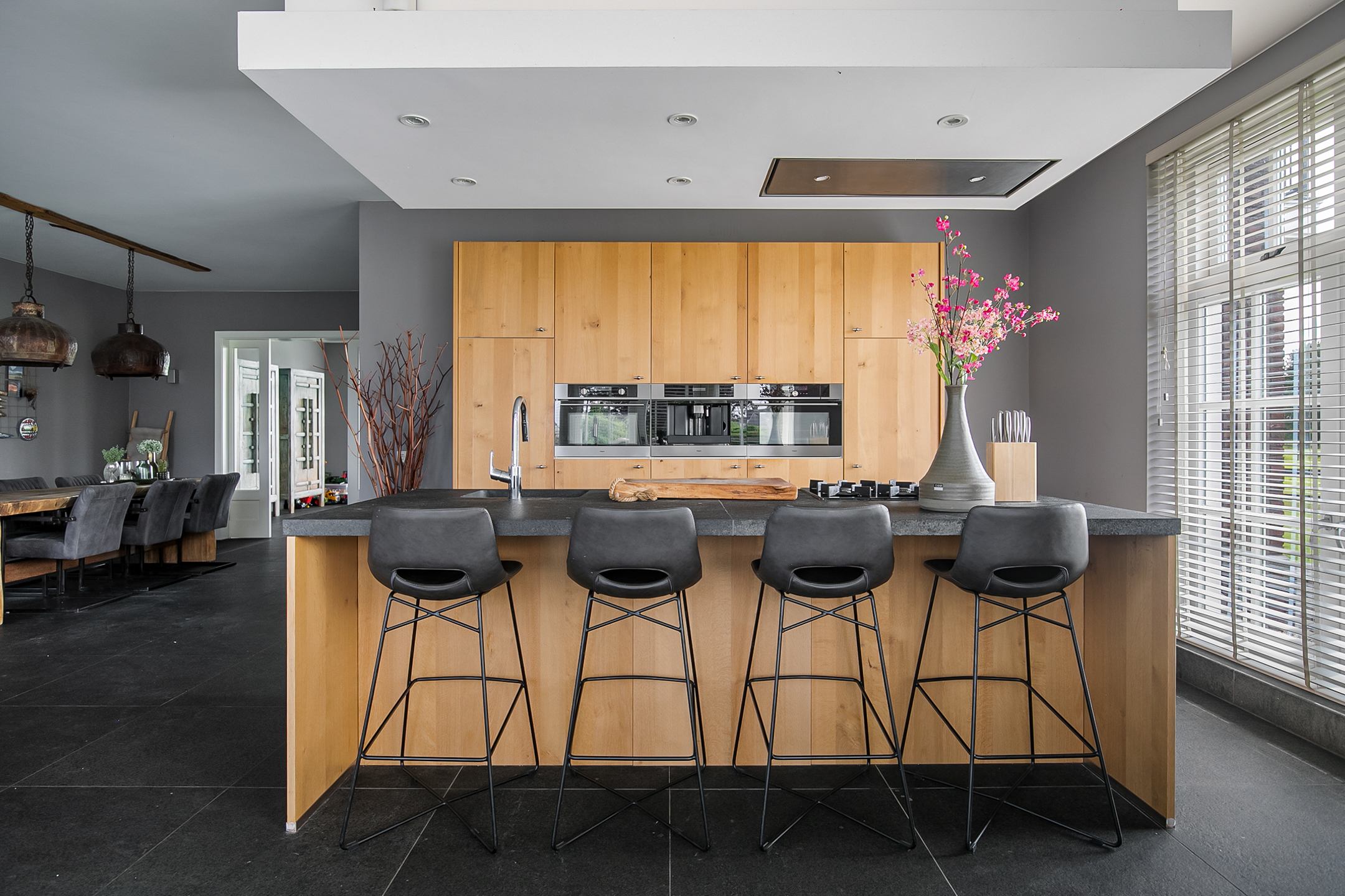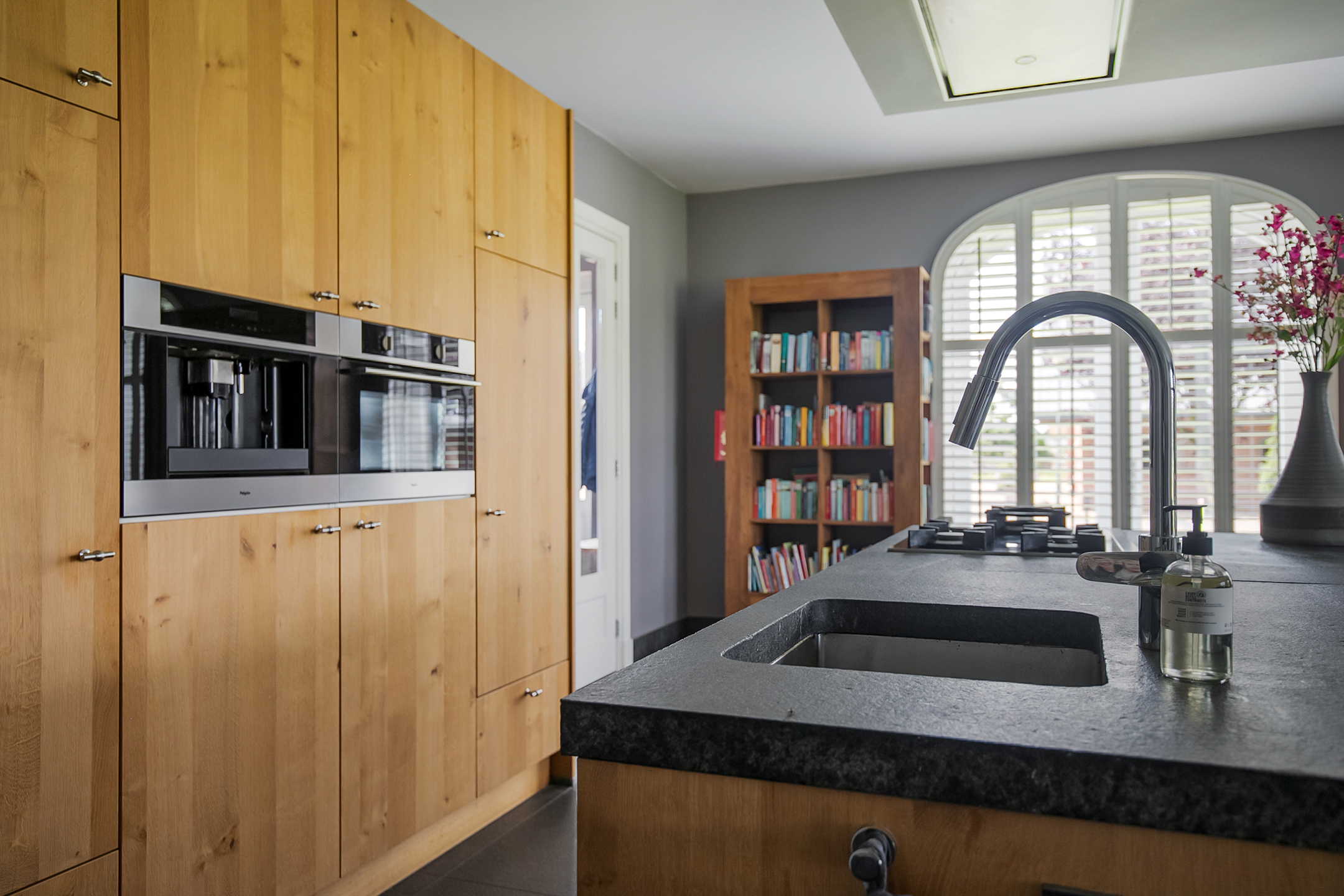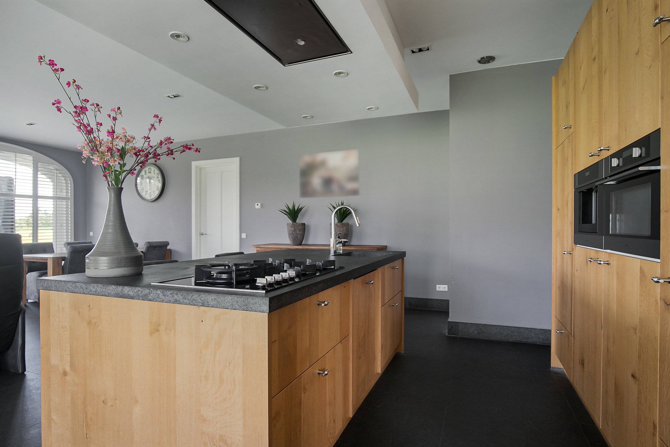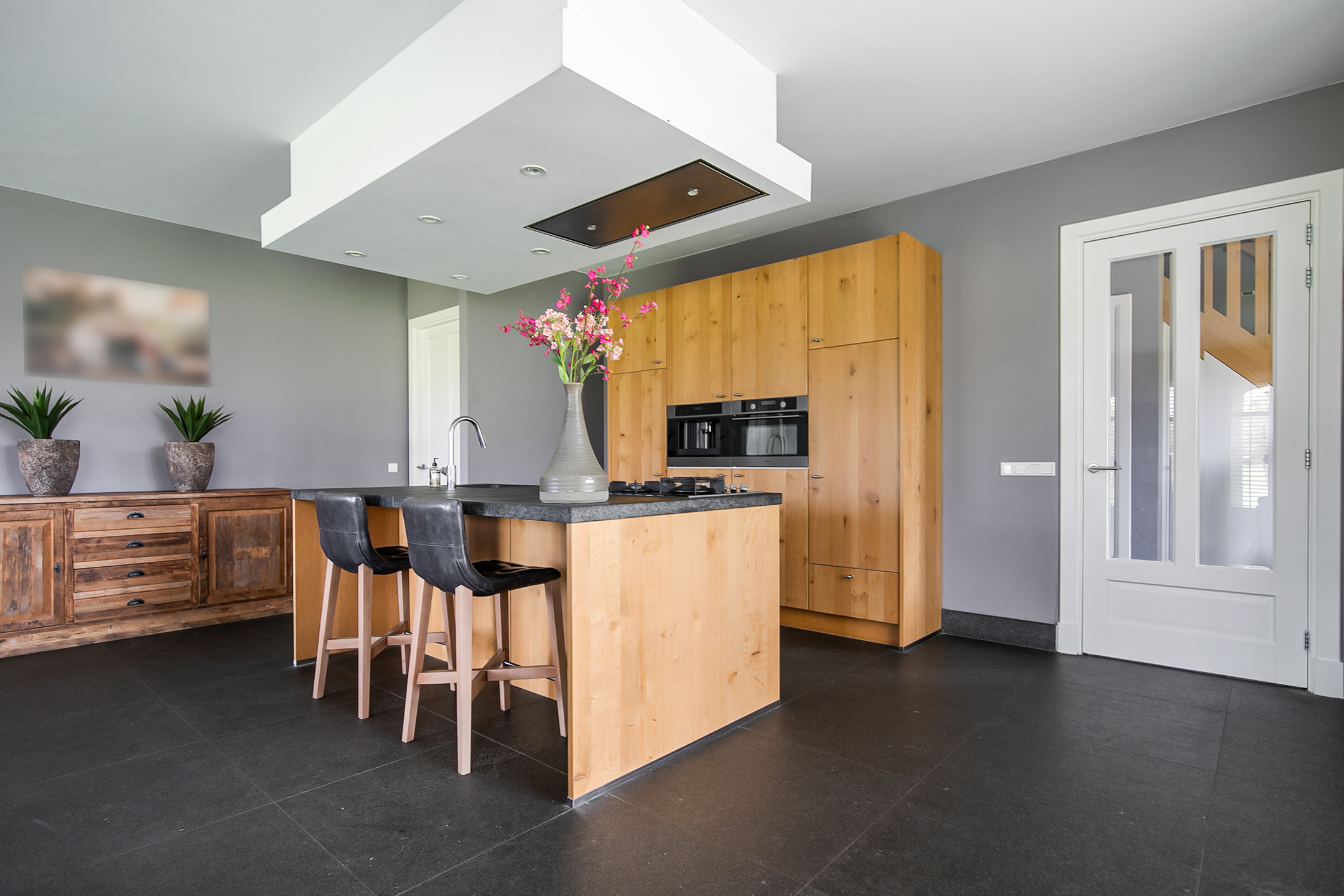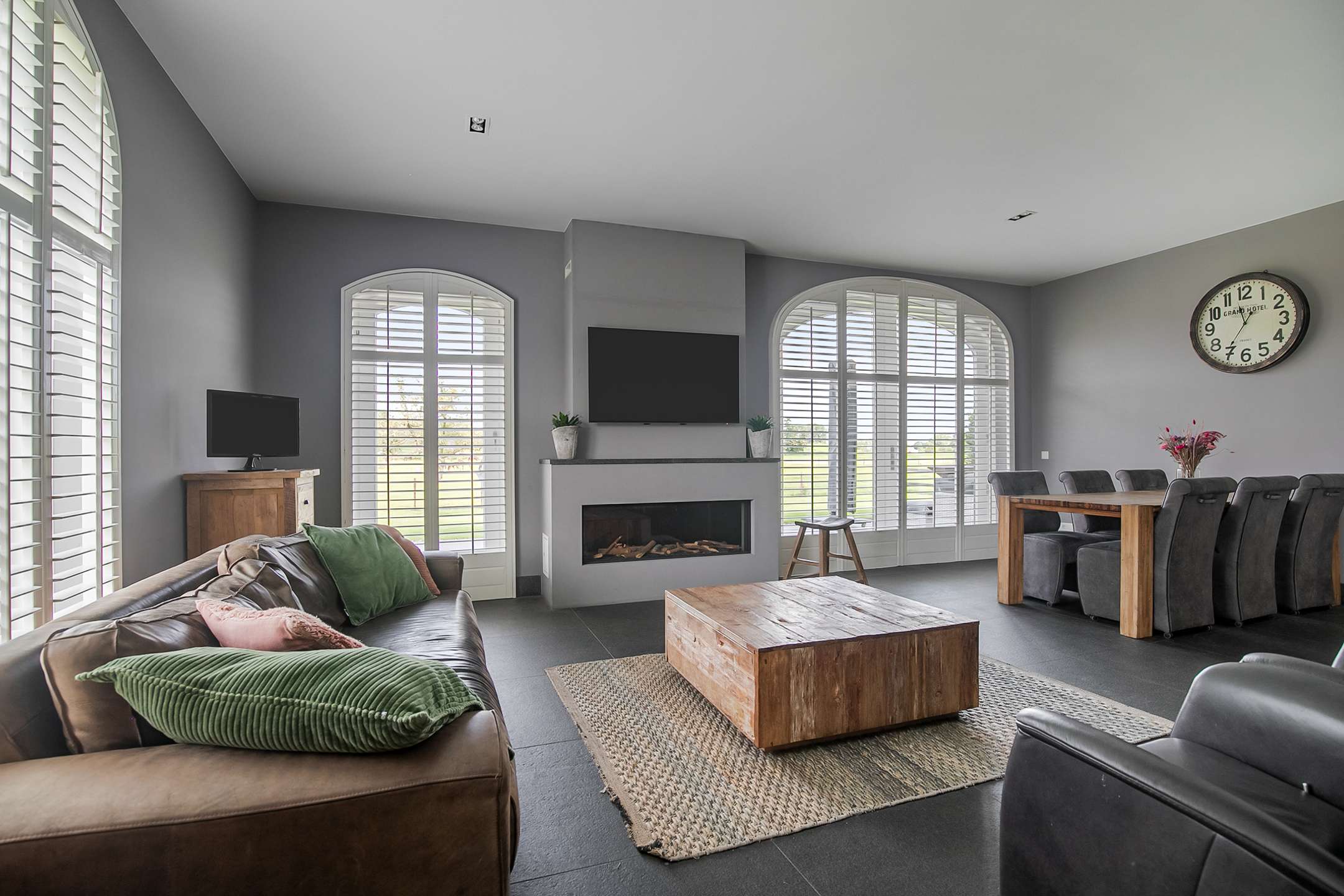 The covered entrance with a double sliding front door, gives this villa an attractive appearance. The spacious reception hall with imposing wooden staircase provides access to the living room and the 1st floor. The hall has a natural stone tiled floor, stucco walls and a stucco ceiling. The spacious living kitchen with dining area has a natural stone tiled floor, stucco walls and a stucco ceiling with recessed lighting. The kitchen features a wall-mounted unit with appliance wall and a cooking and rinsing island. The appliance wall is further equipped with an oven, coffee maker, steam oven and fridge. The island features a 5-burner gas hob with built-in extractor fan in the ceiling, a sink and a dishwasher. Various cupboards and drawers provide plenty of storage space. A large bay window/extension with French doors provide access to the garden. The many windows provide plenty of natural light. A fireplace adds atmosphere and warmth to the room. From the living room there is a nice view of the horse pastures. And here, too, large windows and double doors provide a sea of light. In addition, there is a beautiful, large fireplace with a gas fire that provides even more atmosphere and warmth in the room. Sliding doors close off the living room from the kitchen/dining area. Semi-circular French doors in the side wall of the house provide access to the front house. The spacious entrance hall provides access to the utility/laundry room, living room, toilet room and the meter cupboard. The utility/laundry room is equipped with a sink. Also located here are the connections for the washing equipment. From here, there is access to the office/workroom. The office space is a fine room which is obviously suitable for various purposes, such as a playroom or chill room.