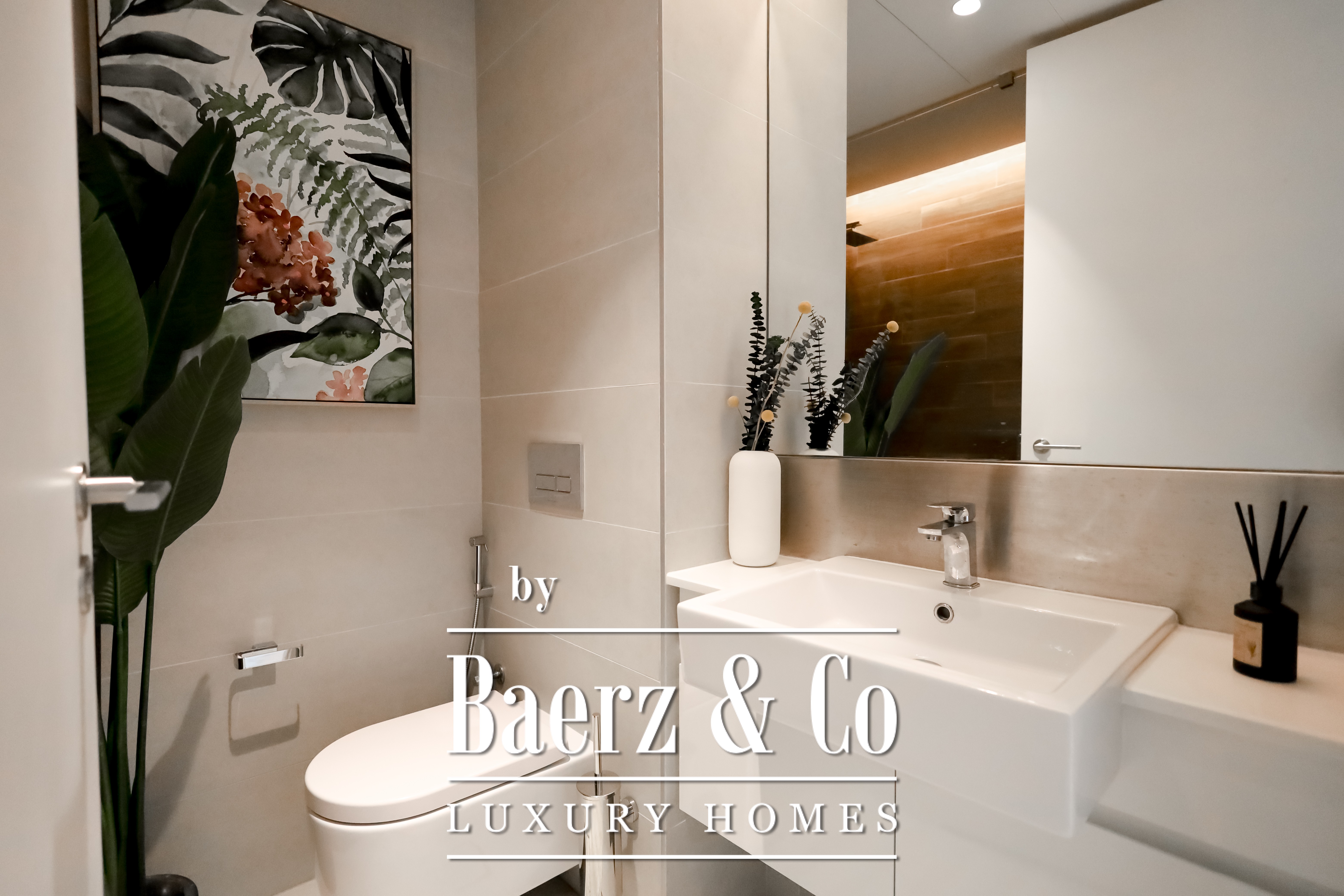 Both bedrooms offer direct sea views, the master suite anchored by a deep soaking tub and a walk-in shower that elevate daily ritual into retreat. Every detail, from advanced home technology to thoughtfully curated furniture, speaks to refined standards and modern comfort.