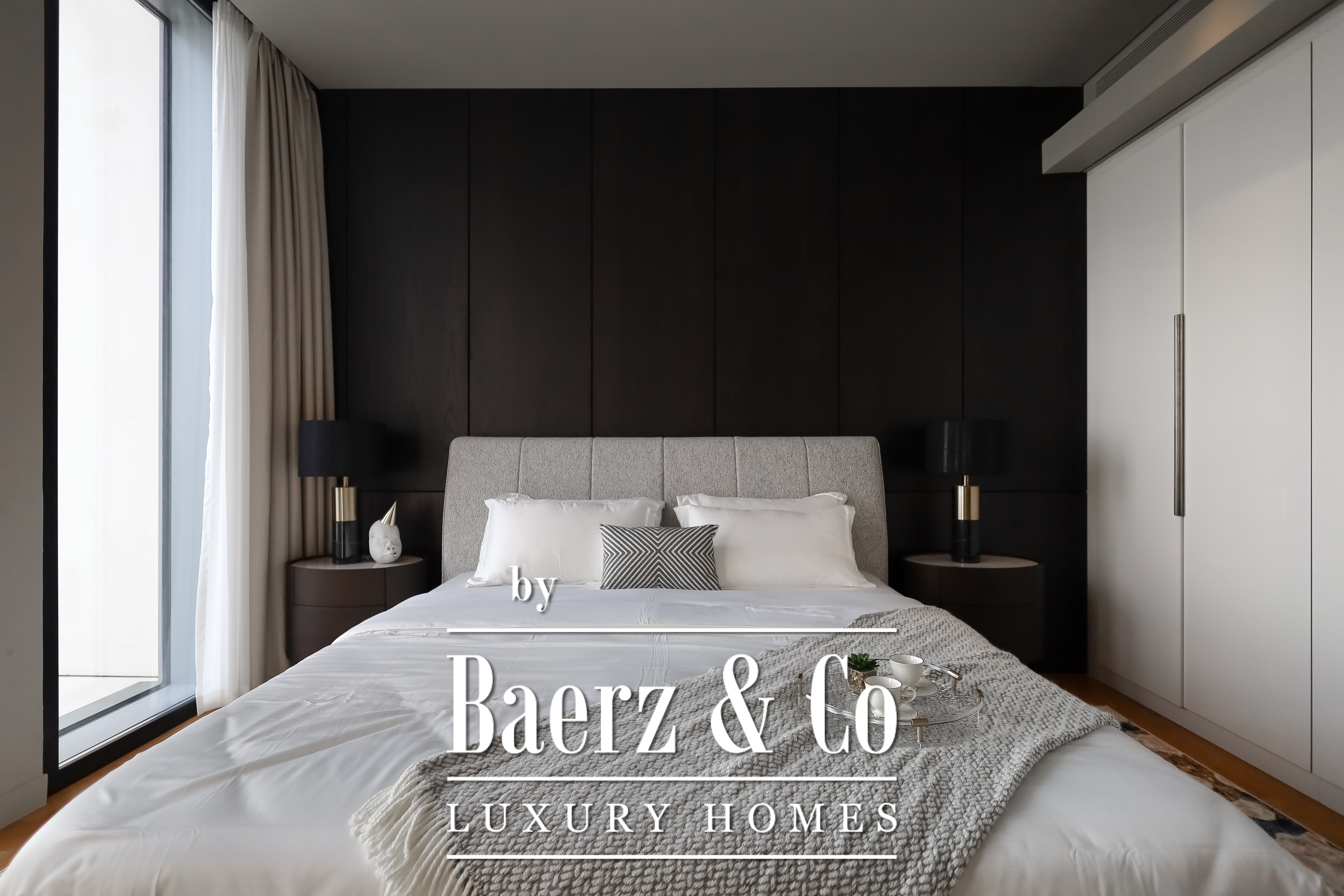 Natural light streams through floor-to-ceiling windows, illuminating the contemporary interiors adorned with bespoke furnishings and original artwork. The open-plan living area flows seamlessly into a state-of-the-art kitchen featuring designer countertops, sleek cabinetry, and premium appliances, making it a space of both aesthetic restraint and culinary possibility.