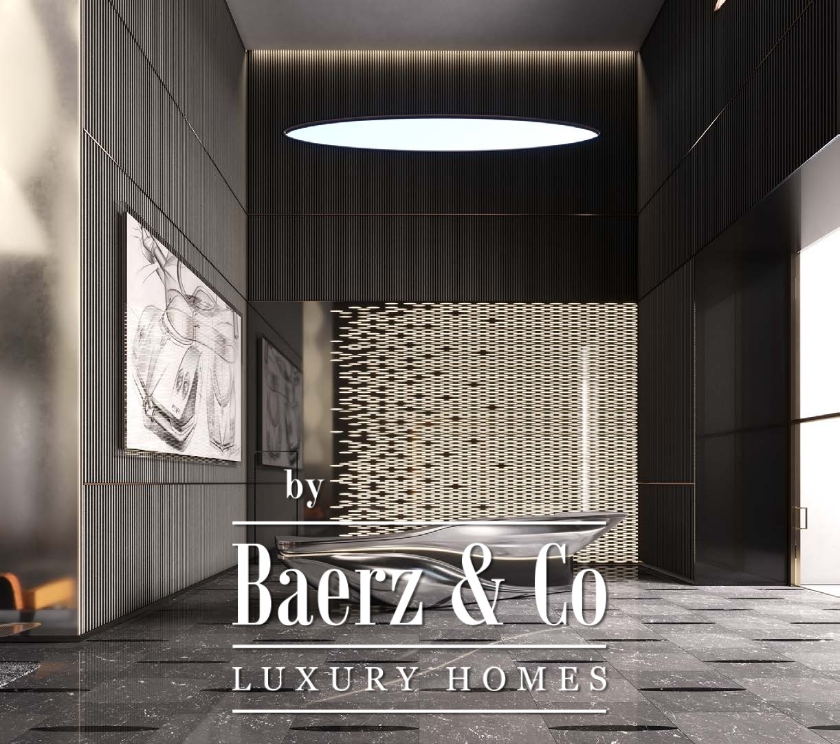 The interiors, inspired by Horacio Pagani, are distinguished by sculptural forms, luxury materials, and Italian detailing, creating a calm yet expressive environment. A contemporary kitchen with integrated appliances stands at the heart of daily life, while soaring ceilings and smart home technology ensure comfort and discretion. The private balcony invites quiet contemplation over the city and water, bordered by minimalist glass.