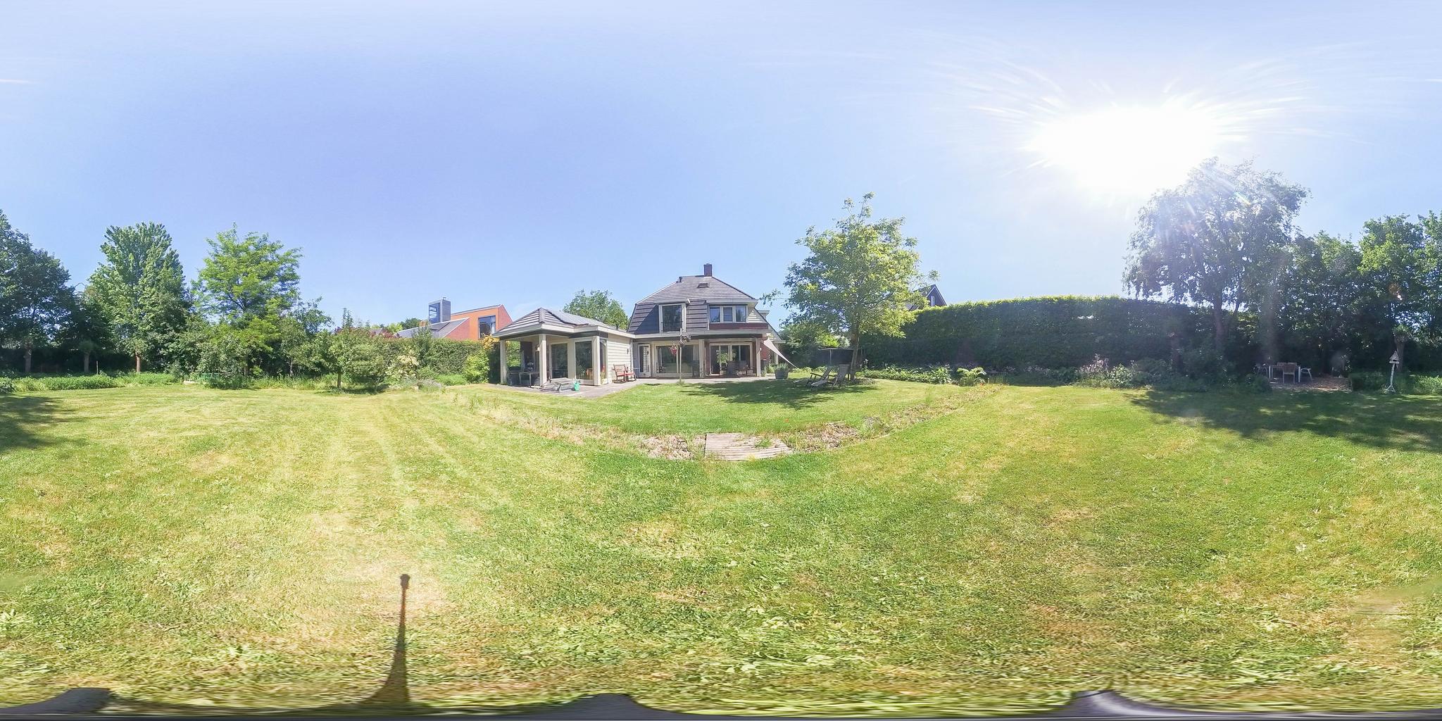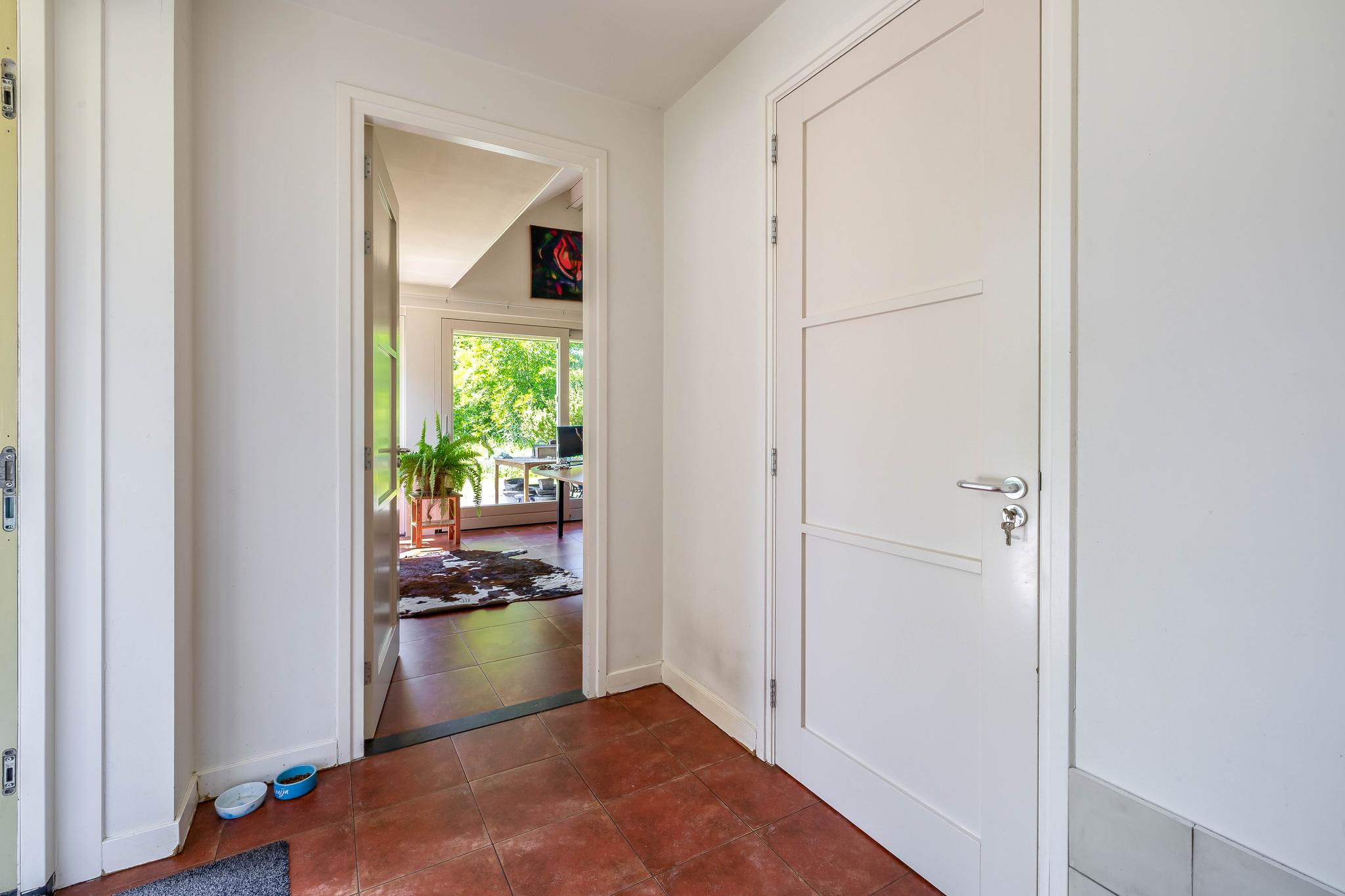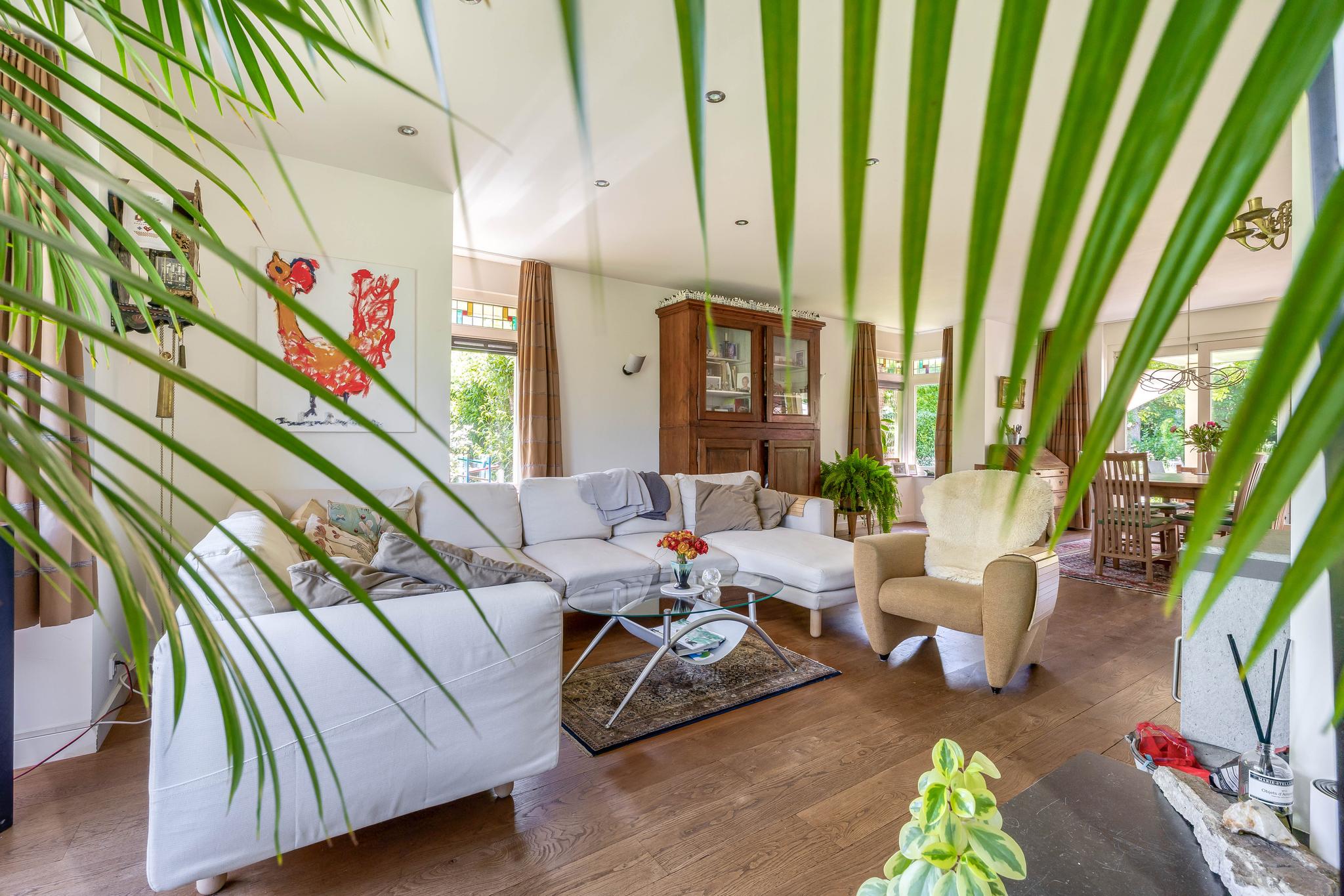 The backyard, designed by architect Martin Buijtels, offers plenty of privacy. The garden is beautifully landscaped with various tiled terraces, including two patio covers, one of which has a skylight and built-in lighting. There is also a lawn, various borders, a wooden deck, a vegetable garden, several fruit trees, including apple and plum trees, and a walnut tree. For convenience, there is a wall tap, a scrub pit, garden lighting, and electricity. The garden is fenced in on all sides, partly with a brick fence and partly with a gate, and is accessible via a back entrance with a lockable gate on both sides.