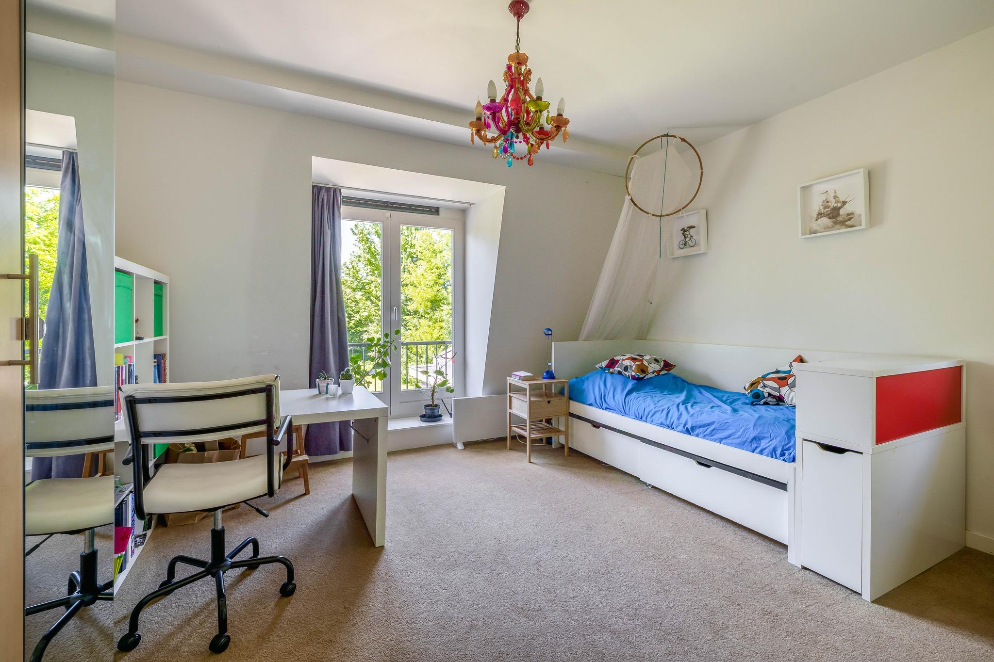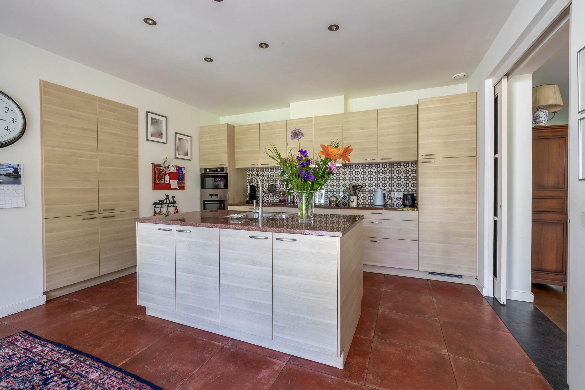From the reception hall, you enter the very spacious living room, a wonderful place to relax. It is divided into a study/TV corner and a spacious sitting area with a wood-burning stove. The large dining area is adjacent to the garden and has sliding doors to the backyard and the covered terrace. Thanks to the large windows, the bay window at the front with stained glass in the upper part of the windows in the living room, there is plenty of natural light.