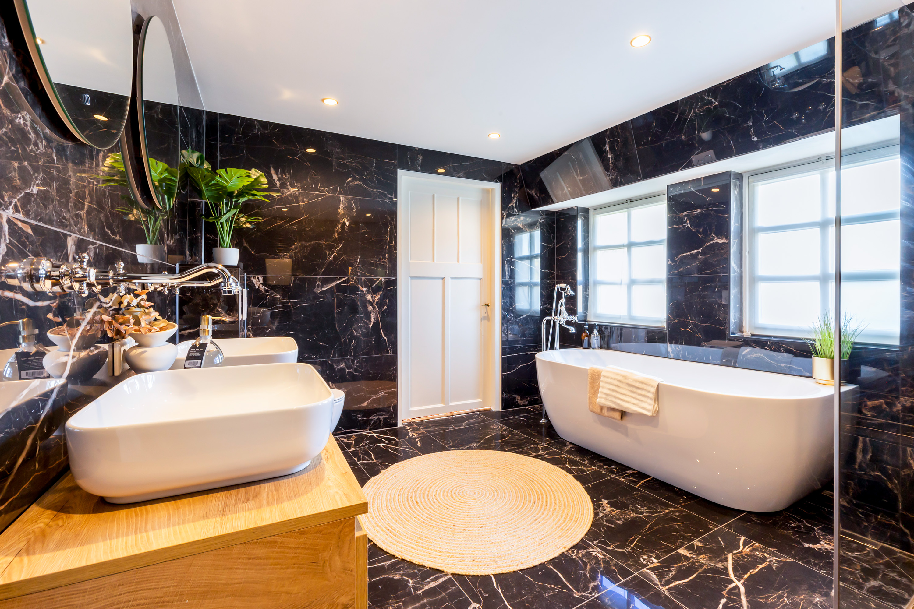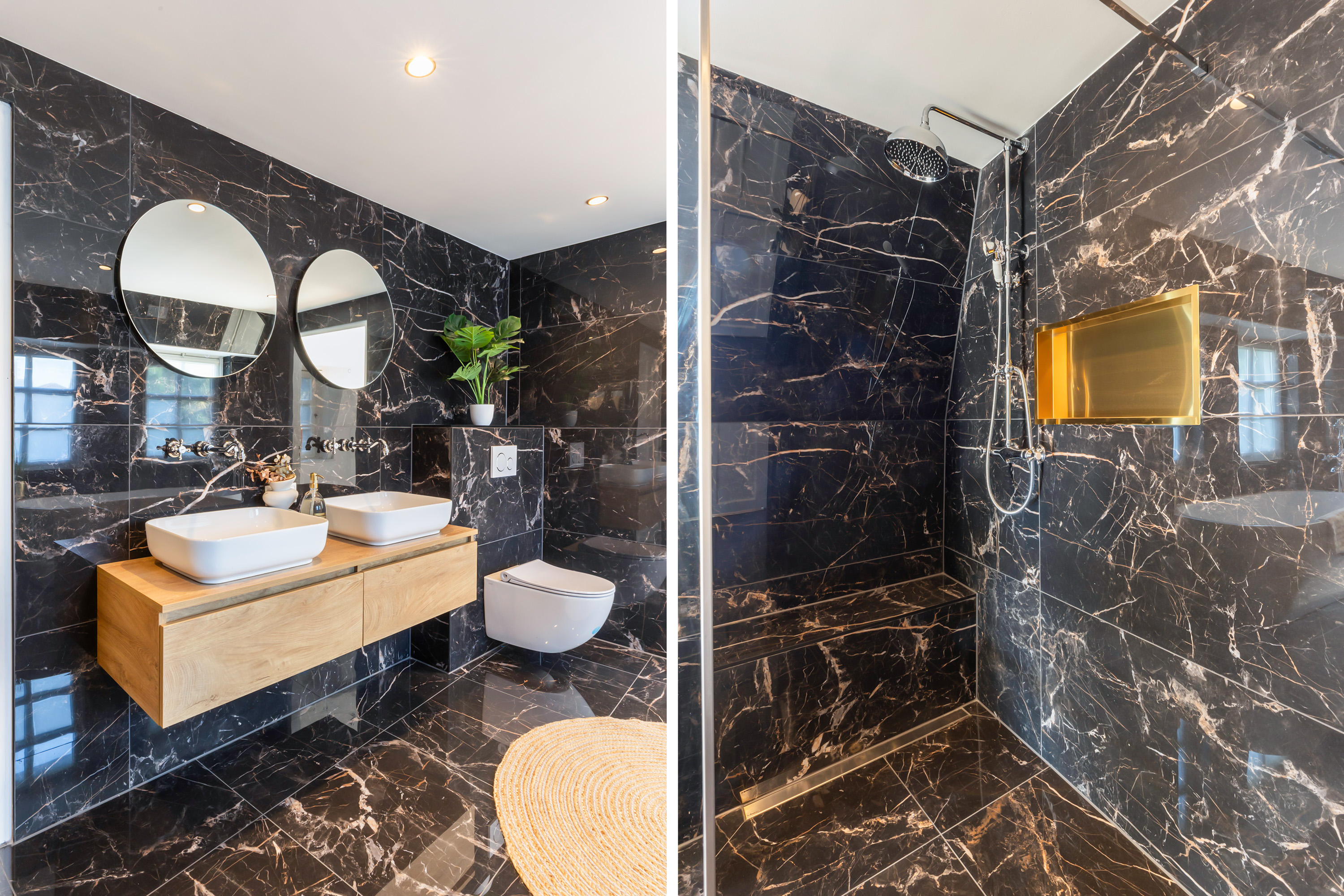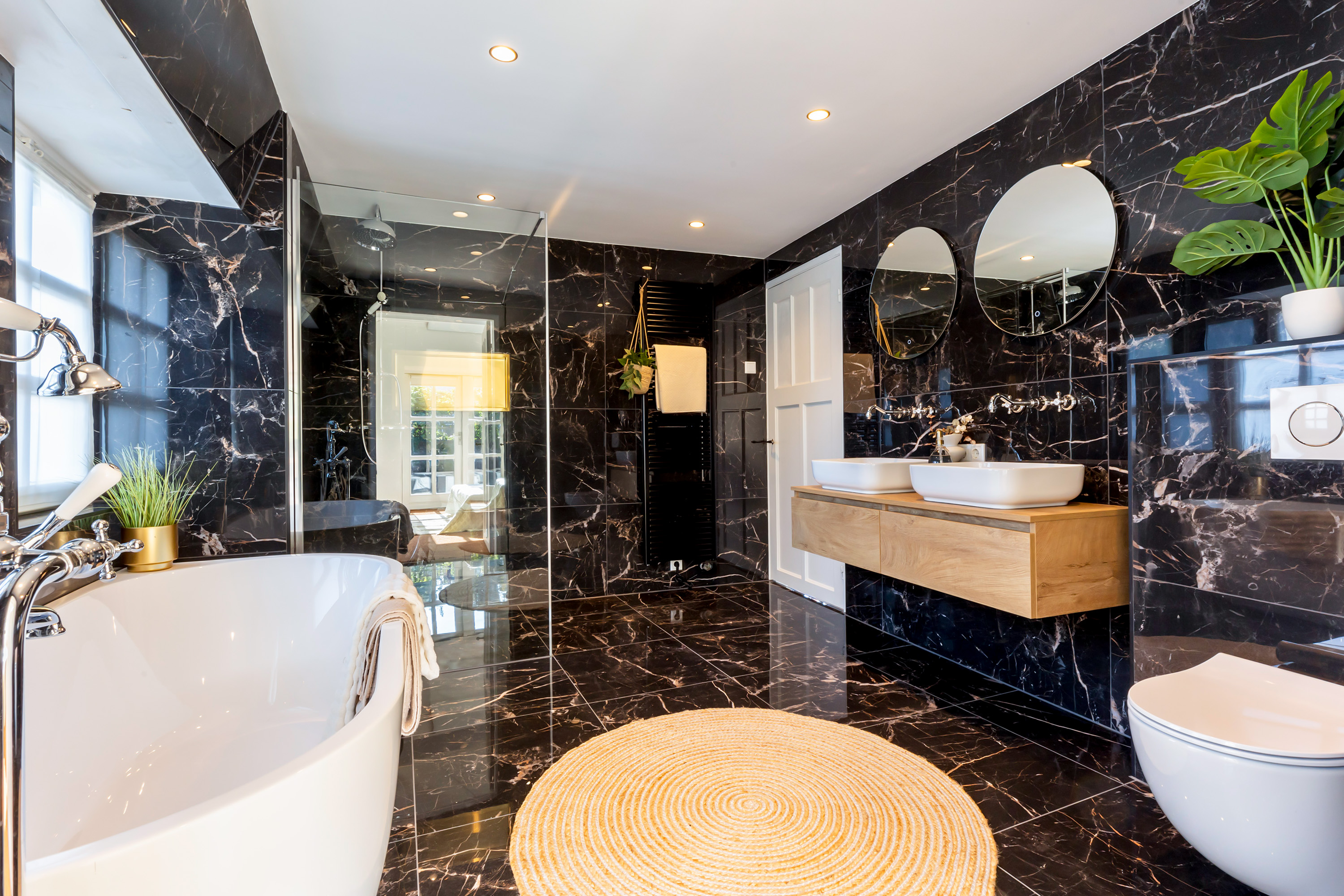 The bathroom is modern and luxurious, fitted with a spacious walk-in shower with copper-coloured fittings and a glass screen, a semi-freestanding bathtub, a double washbasin unit with wall-mounted taps, illuminated mirrors and a second toilet.
