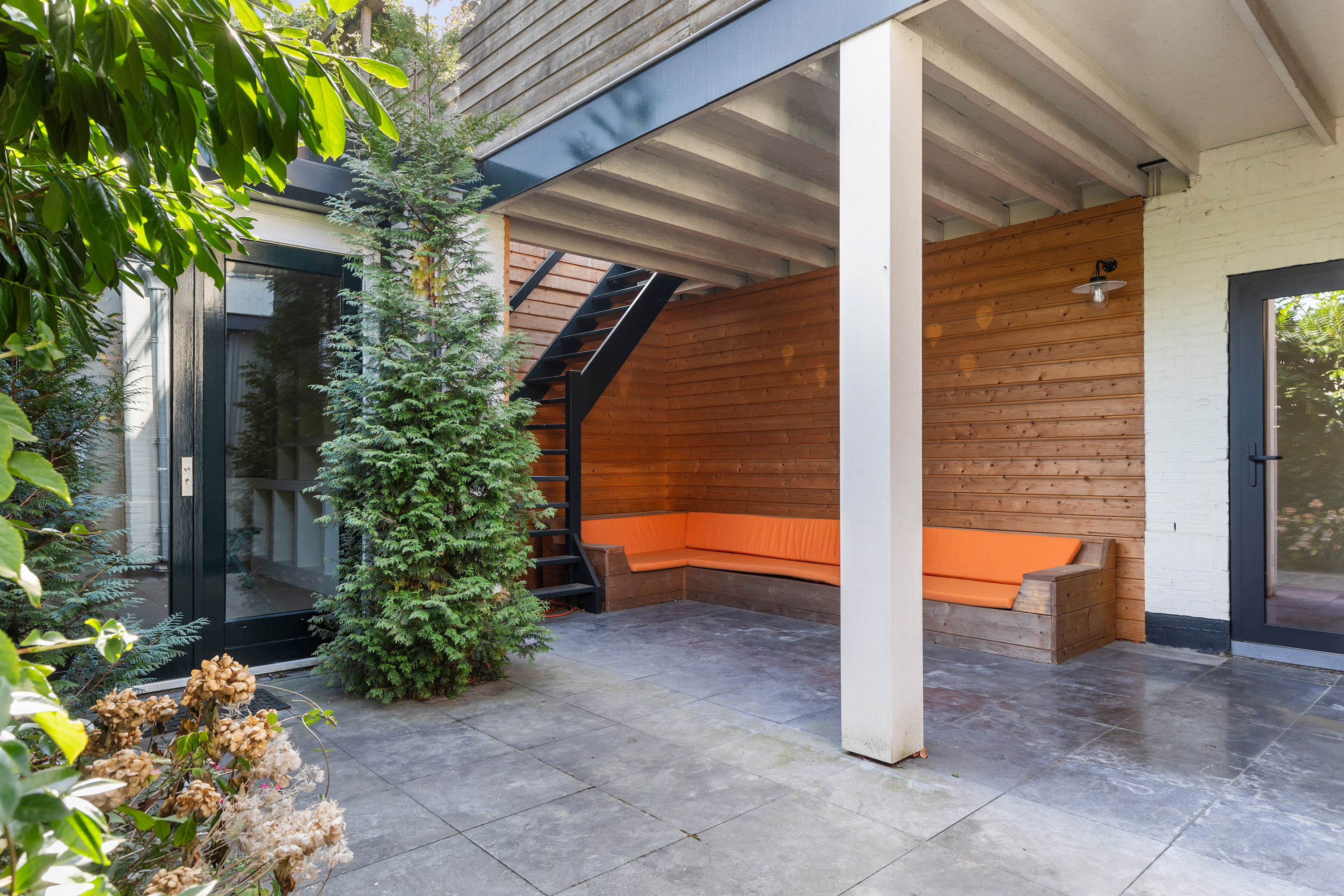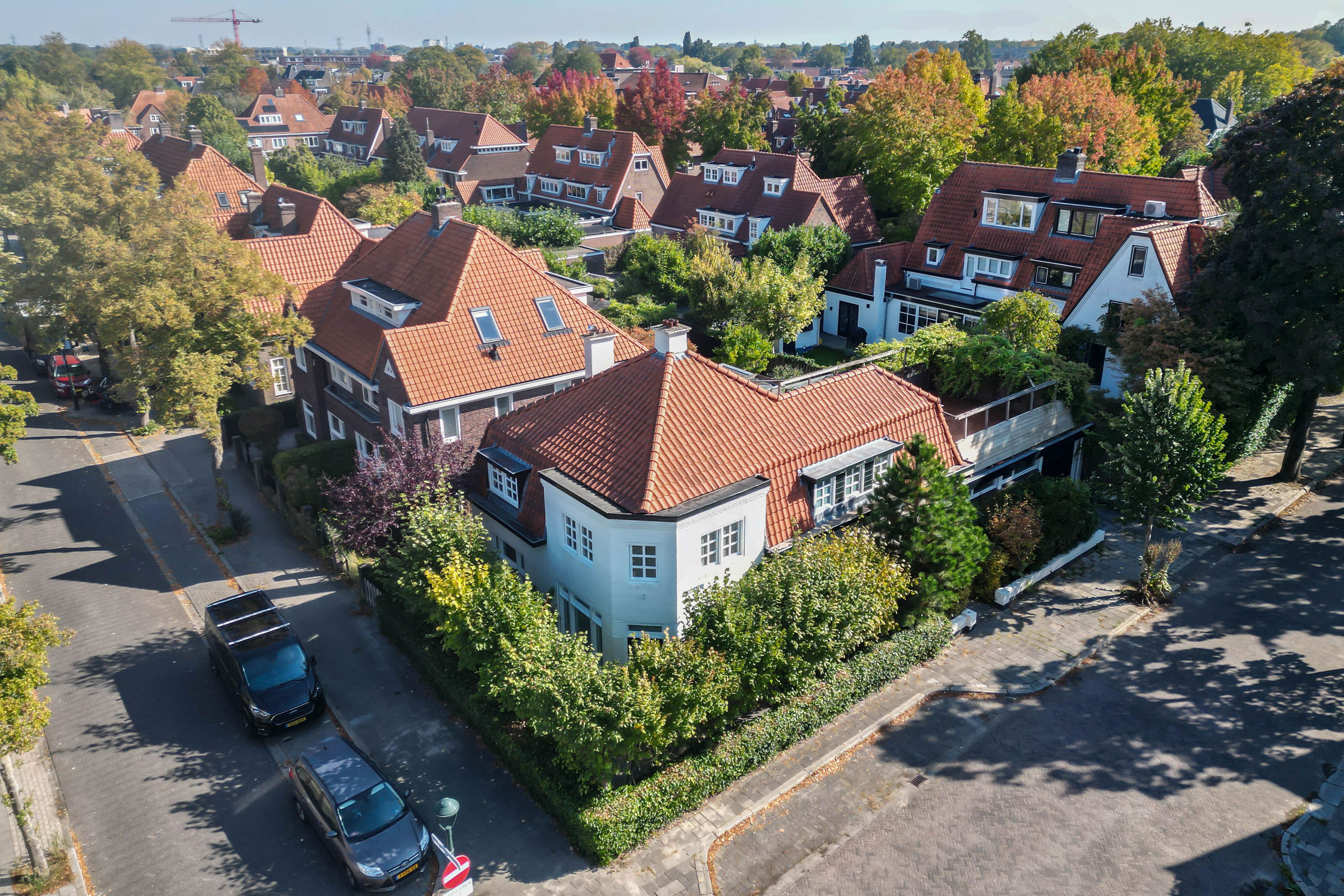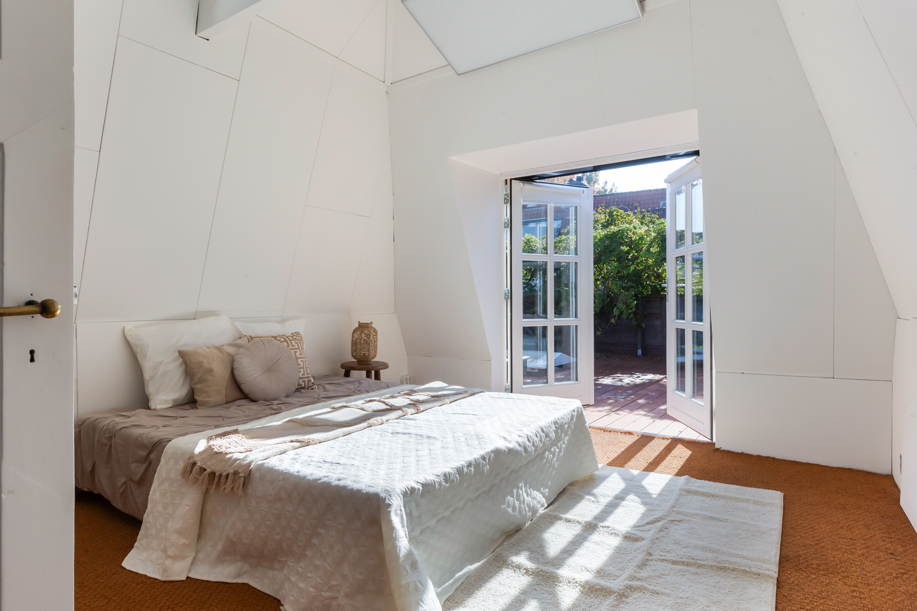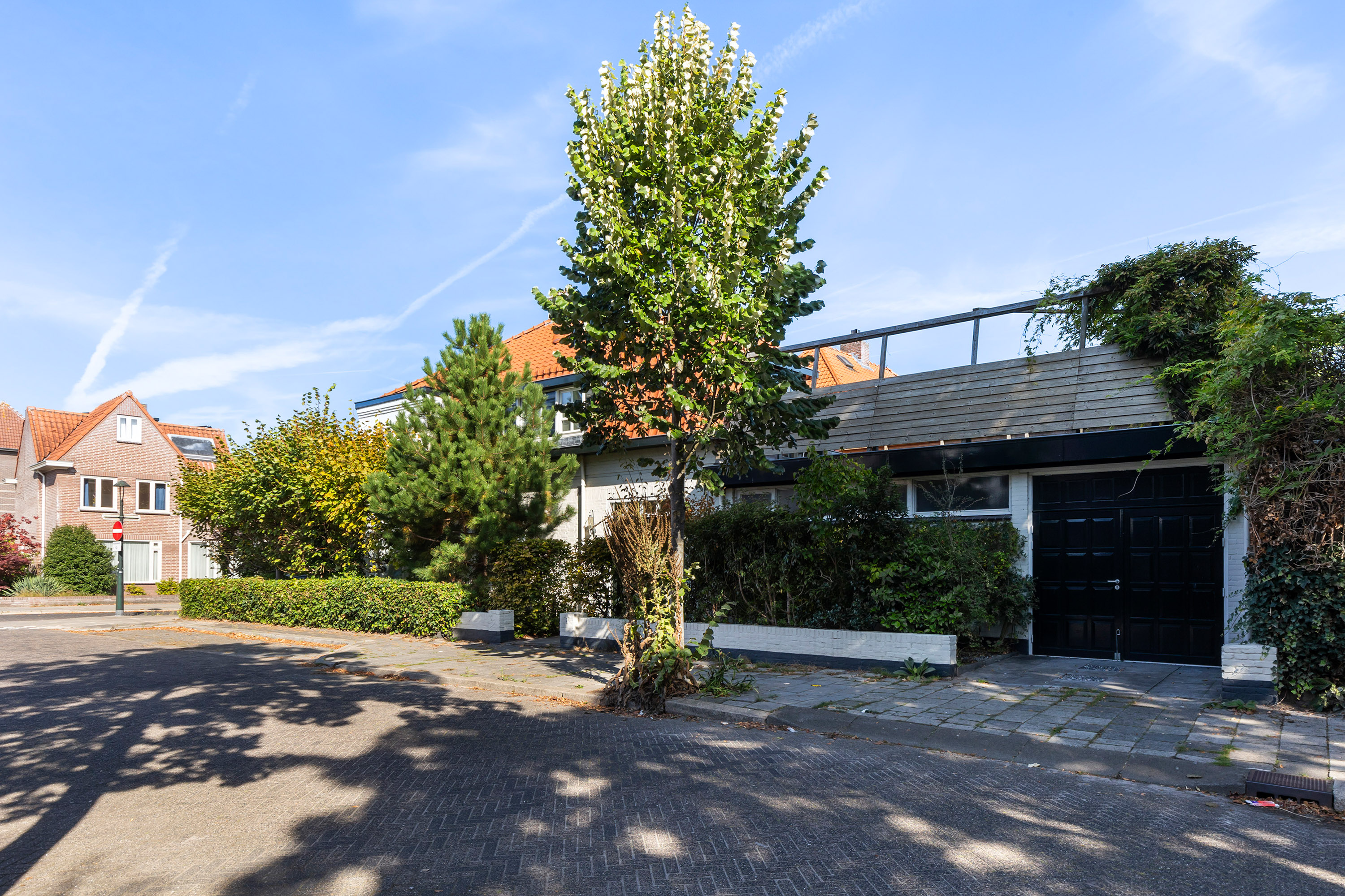 The appearance is both robust and romantic, with white façades, red roof tiles and wide eaves. The 331 m² plot includes a private city garden with terraces to the south-west and east, a veranda and a large roof terrace of 55 m². Thanks to the sunny position, composite decking and full fencing, this is a place designed for relaxation and enjoyment in complete privacy.