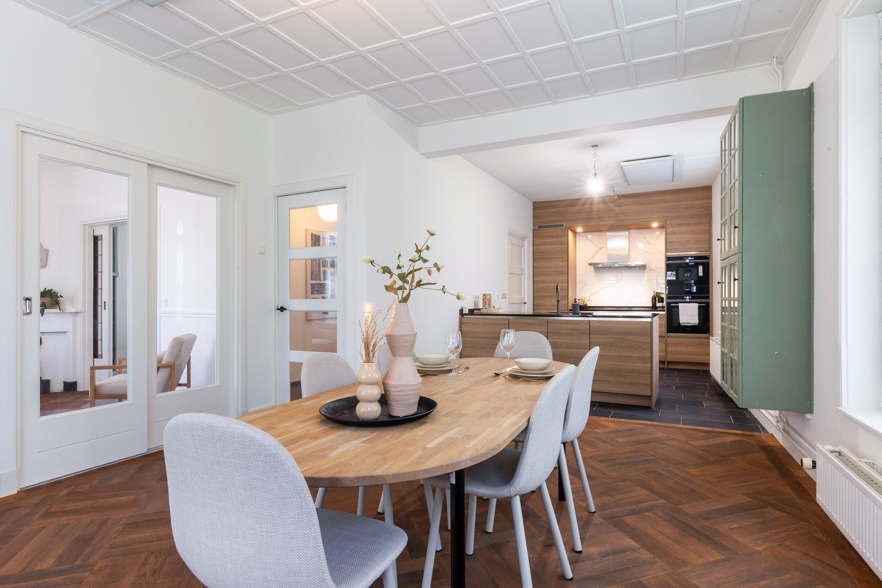 Inside, the atmosphere is warm, stylish and surprisingly spacious. The double front doors open onto a generous hallway with cloakroom space, access to the cellar and a modern toilet. From here you can reach both the kitchen-diner and the en-suite living rooms.
