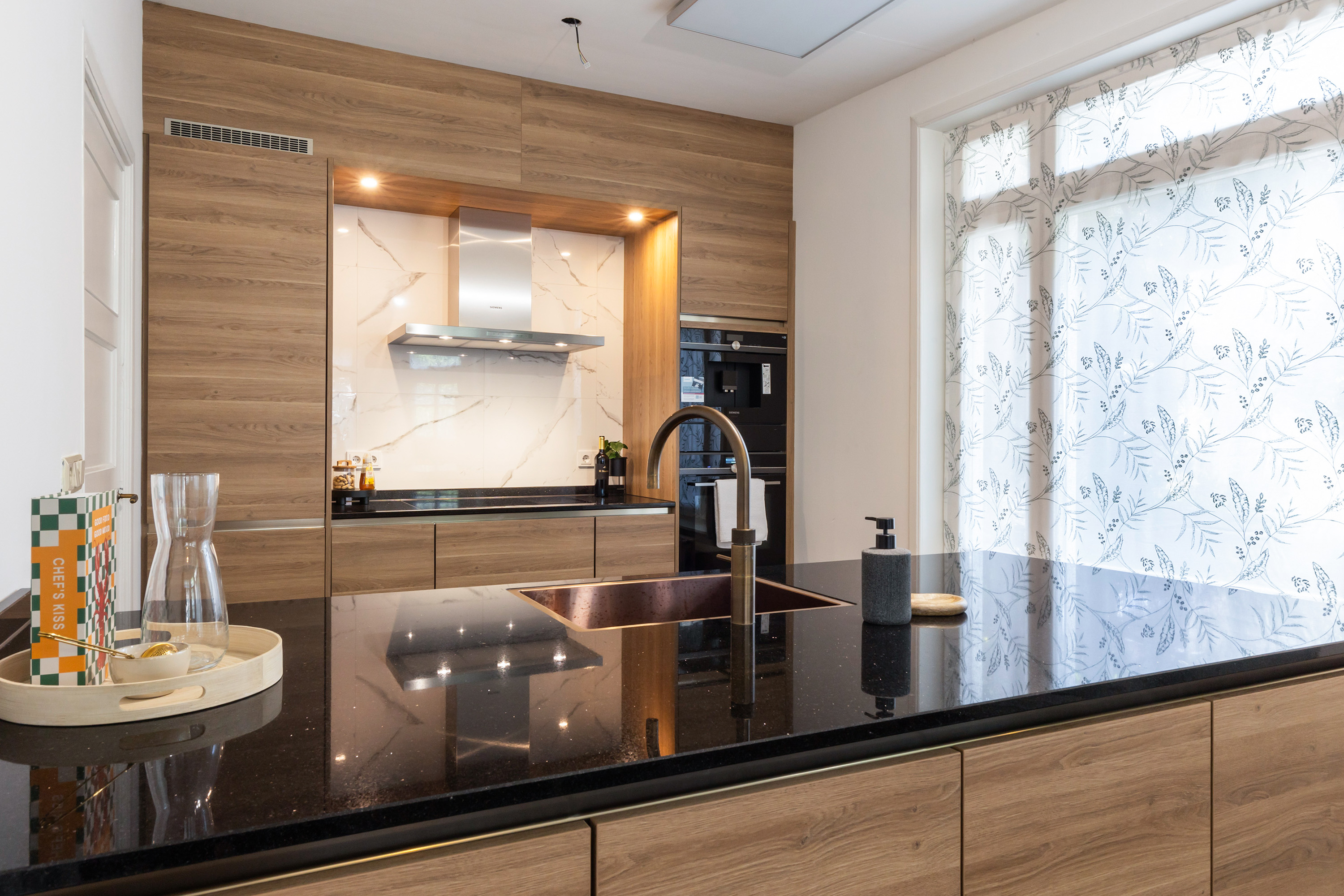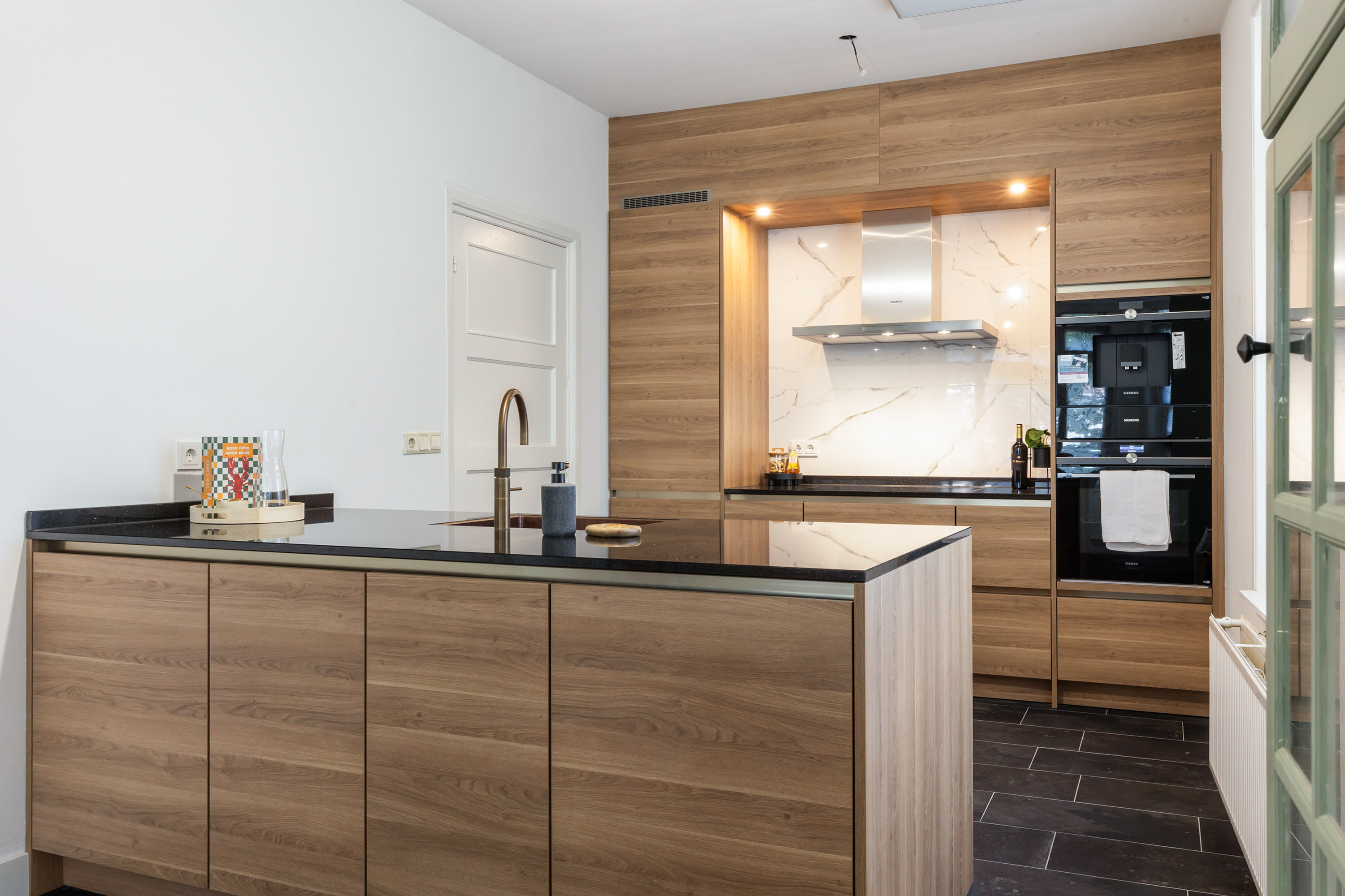 The kitchen-diner forms the heart of the home. Large new windows and the renewed door to the front garden create a light and welcoming space. The brand-new Siematic kitchen features a dual arrangement with island and is fitted with Siemens appliances, including an induction hob with fish burner, combi-oven, built-in coffee machine with warming drawer, dishwasher and a stylish bronze-coloured Quooker. The black granite worktop contrasts beautifully with the oak cabinetry and the marbled splashback. Additional cabinetry has been added at the rear of the island, ensuring practicality and design go hand in hand. The adjoining dining area is generous, easily accommodating a large table, with French doors opening directly onto the south-west facing terrace.