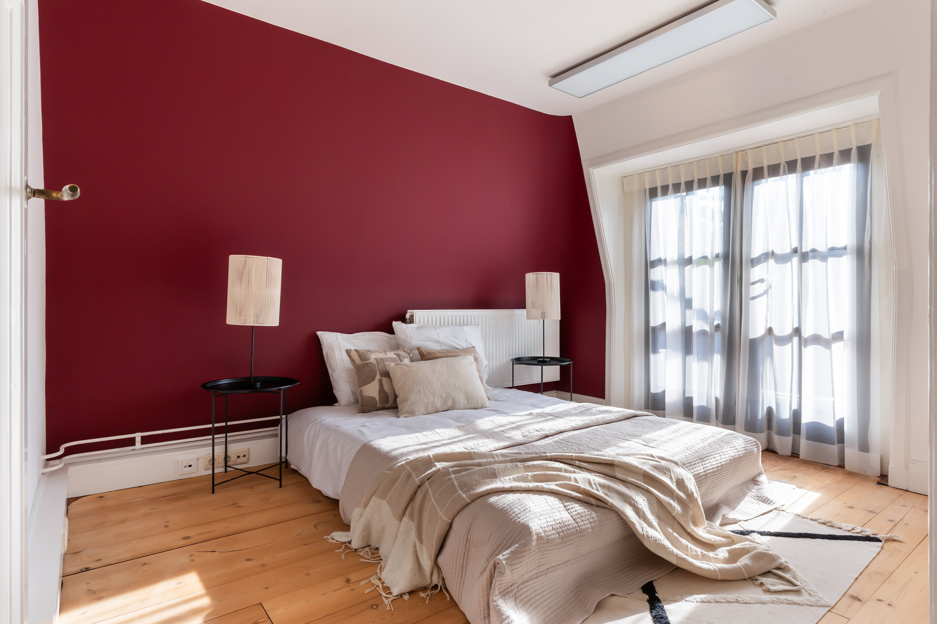 The spacious landing leads to the bedrooms and bathroom. The bedrooms are light and airy, with wooden flooring and smooth plastered walls. Four of the bedrooms are large enough to accommodate a double bed. Two have built-in wardrobes, the turret room has a charming corner window, and two others have French doors to the roof terrace. The fourth bedroom is connected to the bathroom and could also serve as a guest room. From this room, a fixed staircase leads to a small loft. The fifth room is currently used as a study but could just as easily serve as a dressing room, nursery or walk-in wardrobe.