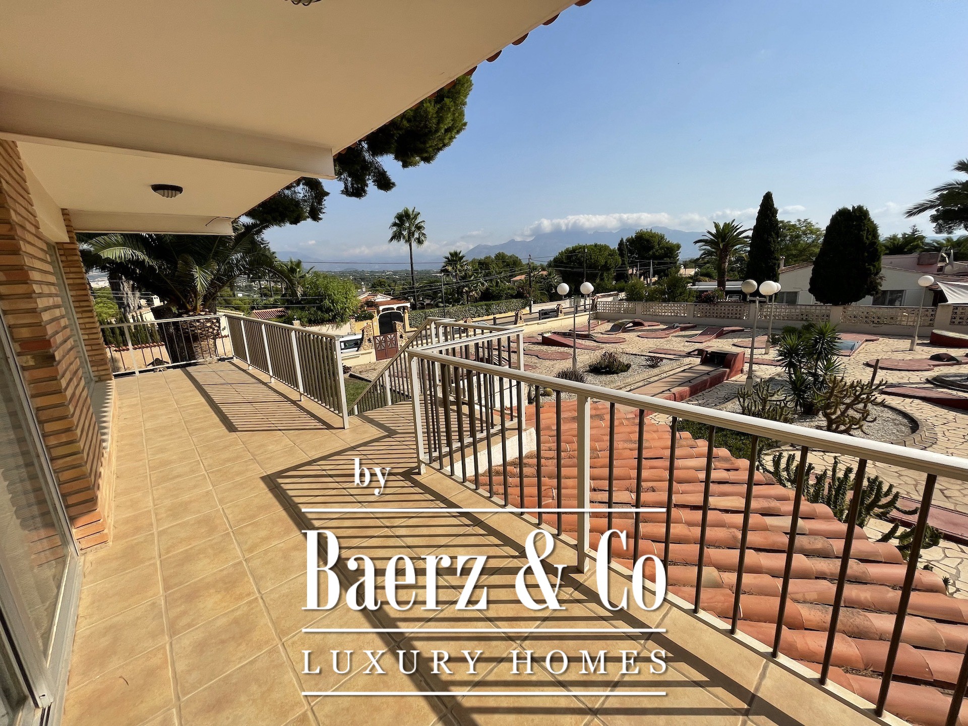 Outdoors, the villa extends across a 2,500 m² plot, with mature gardens hosting a private pool, barbecue area, and thoughtfully designed mini-golf course. The sense of privacy is enhanced by fencing and a security door, while air conditioning, satellite TV, double glazing, and an alarm system quietly underpin daily comfort. Covered and open terraces, as well as a discreet laundry and storage room, provide effortless rhythm for refined living.