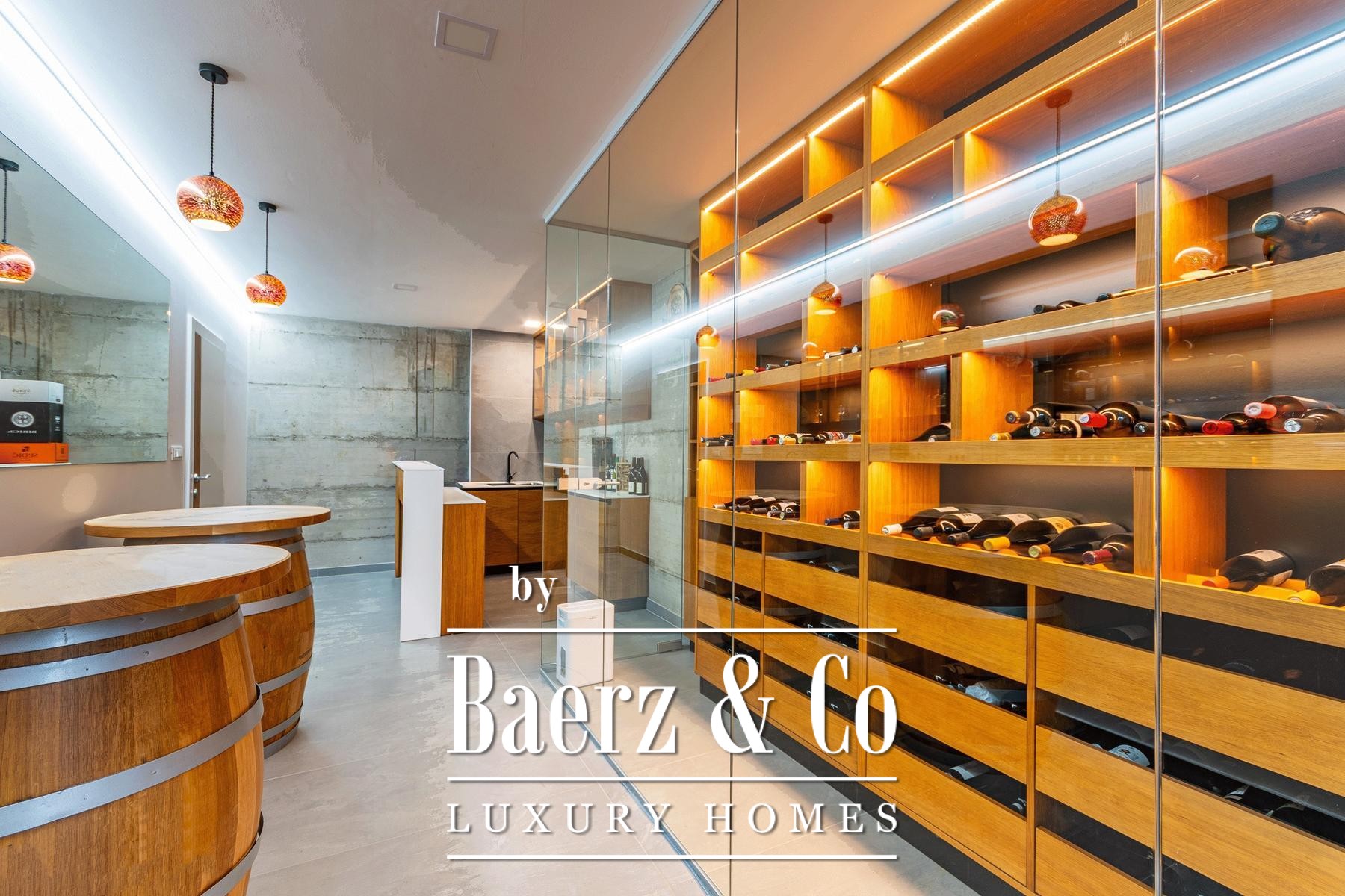 The villa’s architecture flows effortlessly between its three levels. The ground floor features an open kitchen, dining, and living zone, anchored by a fireplace and opening onto a broad terrace that welcomes natural light. A bedroom and bathroom with WC complete this floor. On the first level, a separate entrance leads to two bedrooms, a spacious bathroom, and a flexible kitchenette and living arrangement, with another terrace that frames the scenery. The finished basement provides a private sauna, wine cellar, and garage, grounding the home in quiet luxury.