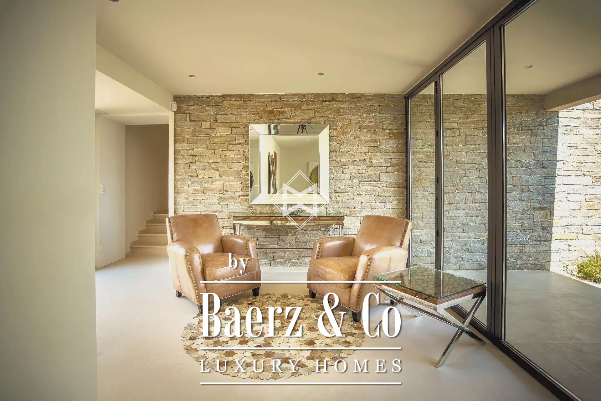 Villa Grimaud with sea and golf views embodies a restrained elegance set within the gated domain of Beauvallon Bartole. This modern villa extends across a living area of 292 m² and a total area of 490 m², offering careful architecture where noble materials, including natural stone, marble, precious wood, and glass, define the tactile rhythm of each space.