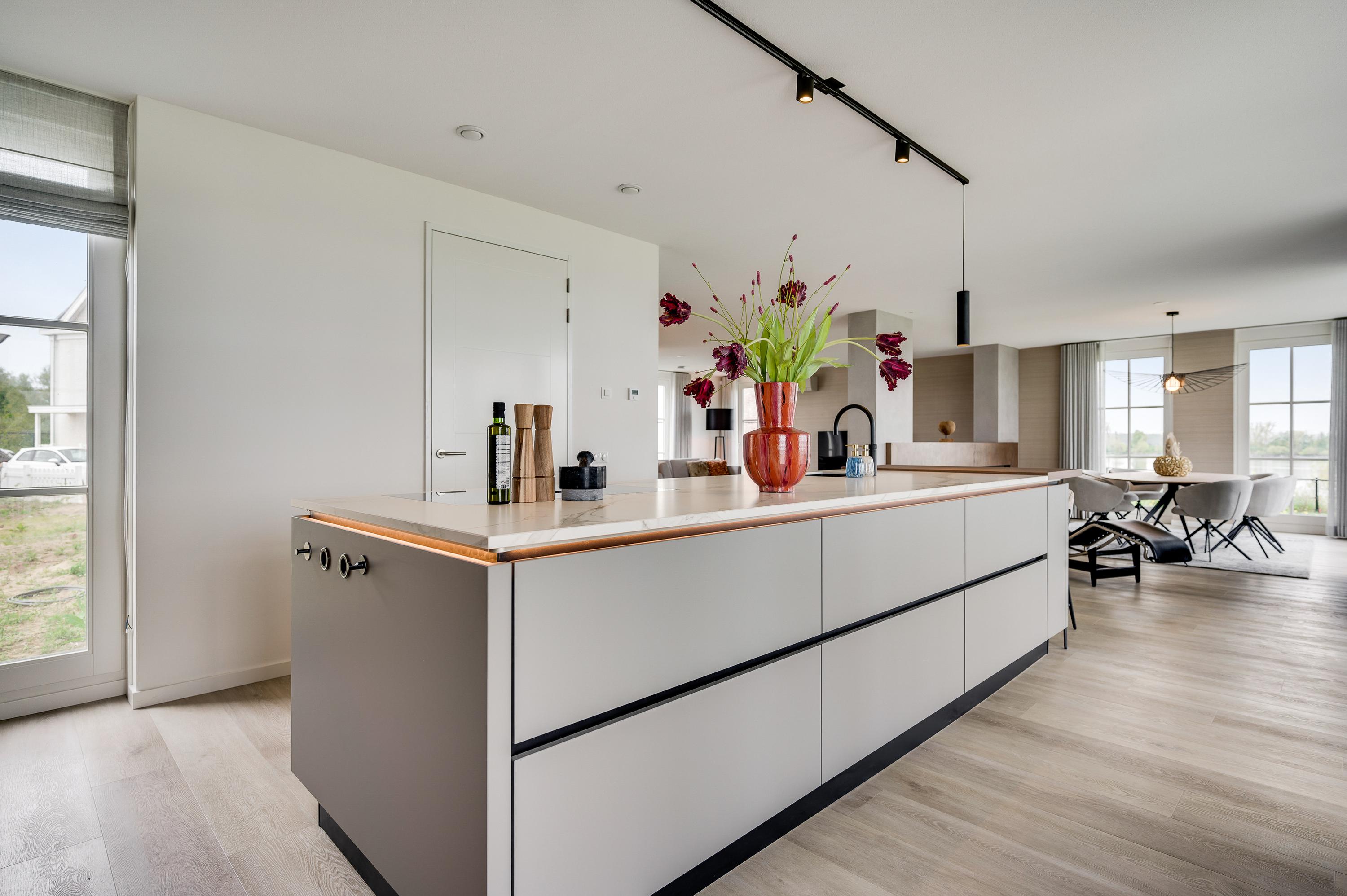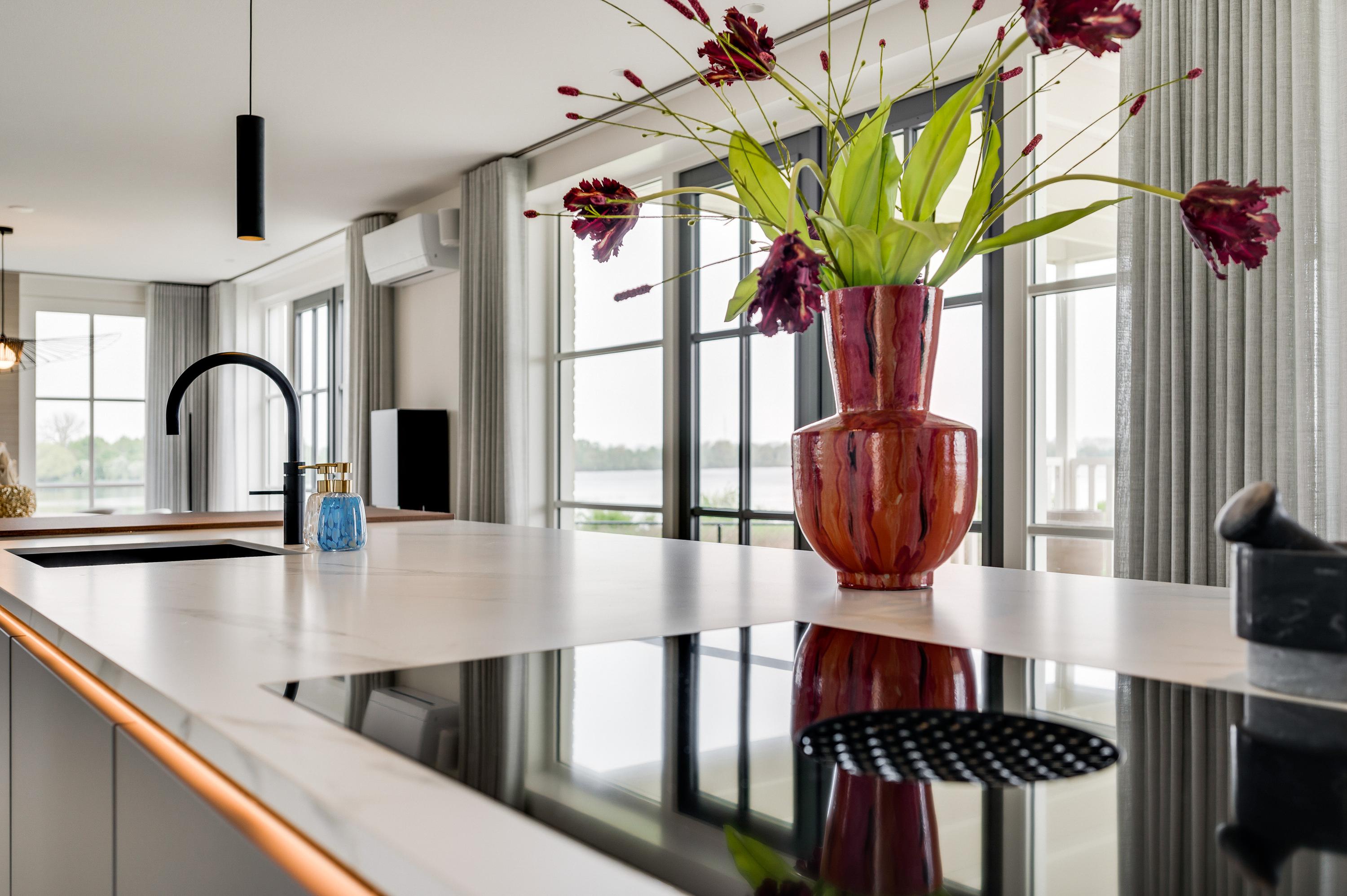 A bar has been created at the end of the island. Here you can enjoy a cup of coffee and the newspaper in the morning or the children can do their homework while you are cooking. All conveniences have been considered, such as a Quooker with hot and cold water, a Bora induction hob, a dishwasher, fridge, freezer and wine climate cabinet from Miele and an oven and microwave from AEG. The utility room is equipped with the white goods connections and has a door to the outside, so you don't have to go through the house with the groceries.