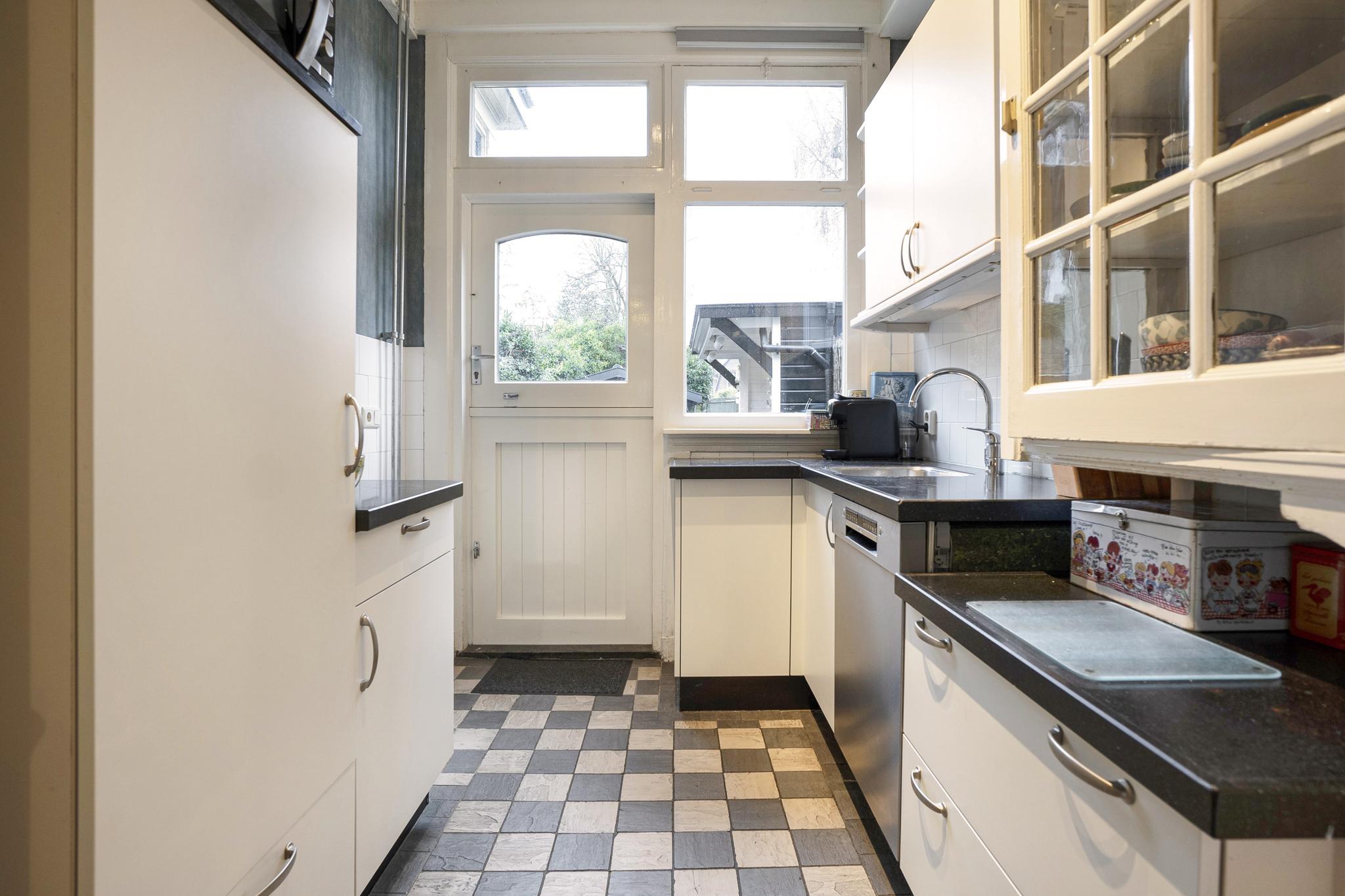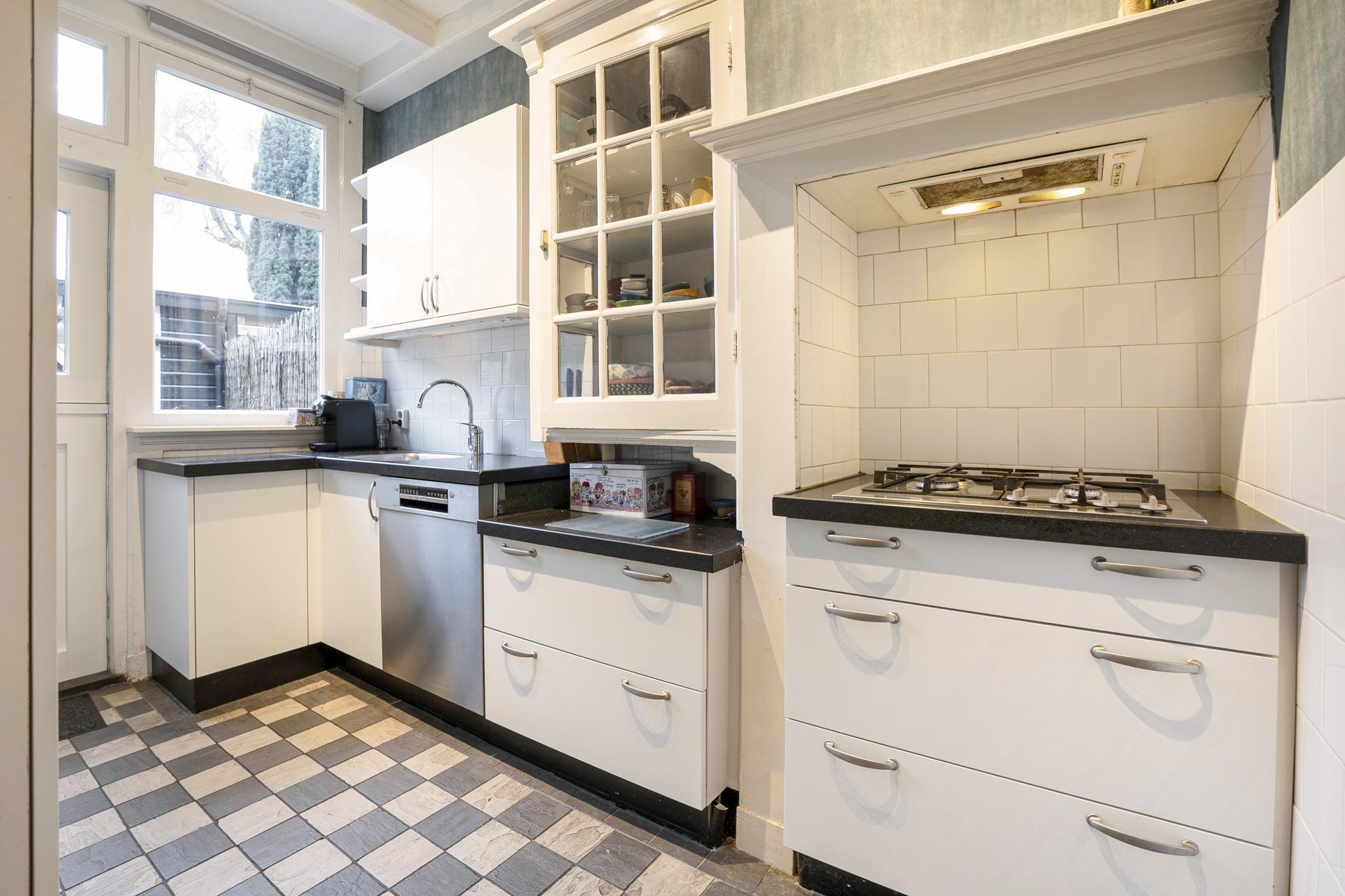 Through the vestibule, which features an original marble floor, you enter the hall with a tiled floor that extends into the kitchen. The kitchen has been updated with new cupboard doors and a stove, combined with a glass cabinet. It is equipped with a dishwasher (2023), a four-burner gas hob, a refrigerator, and a natural stone countertop. From the hall, you can access the toilet, the under-stair cupboard, and a spacious cellar (with sufficient headroom), which houses the central heating boiler and connections for a washing machine and dryer. The living room with en-suite doors, featuring oak plank flooring and a gas fireplace, is also accessible from the hall. The conservatory, designed in an authentic style, has French doors that open onto the back garden, which is also accessible from the kitchen.