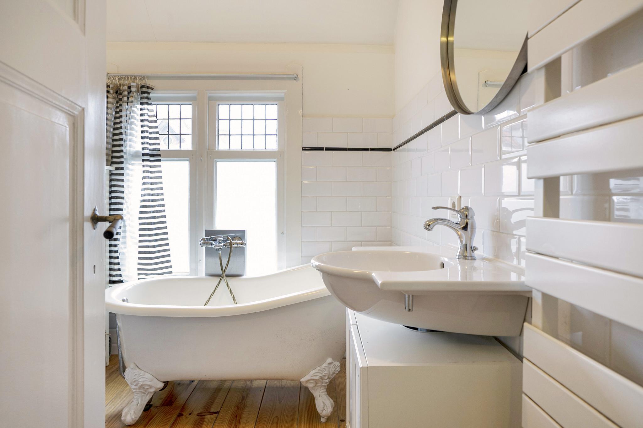 The staircase with a landing leads to the first floor. Here you will find one smaller and two larger bedrooms, one of which has a balcony. The bathroom includes a shower, a second toilet, and a free-standing clawfoot bath. All bedrooms feature built-in wardrobes.