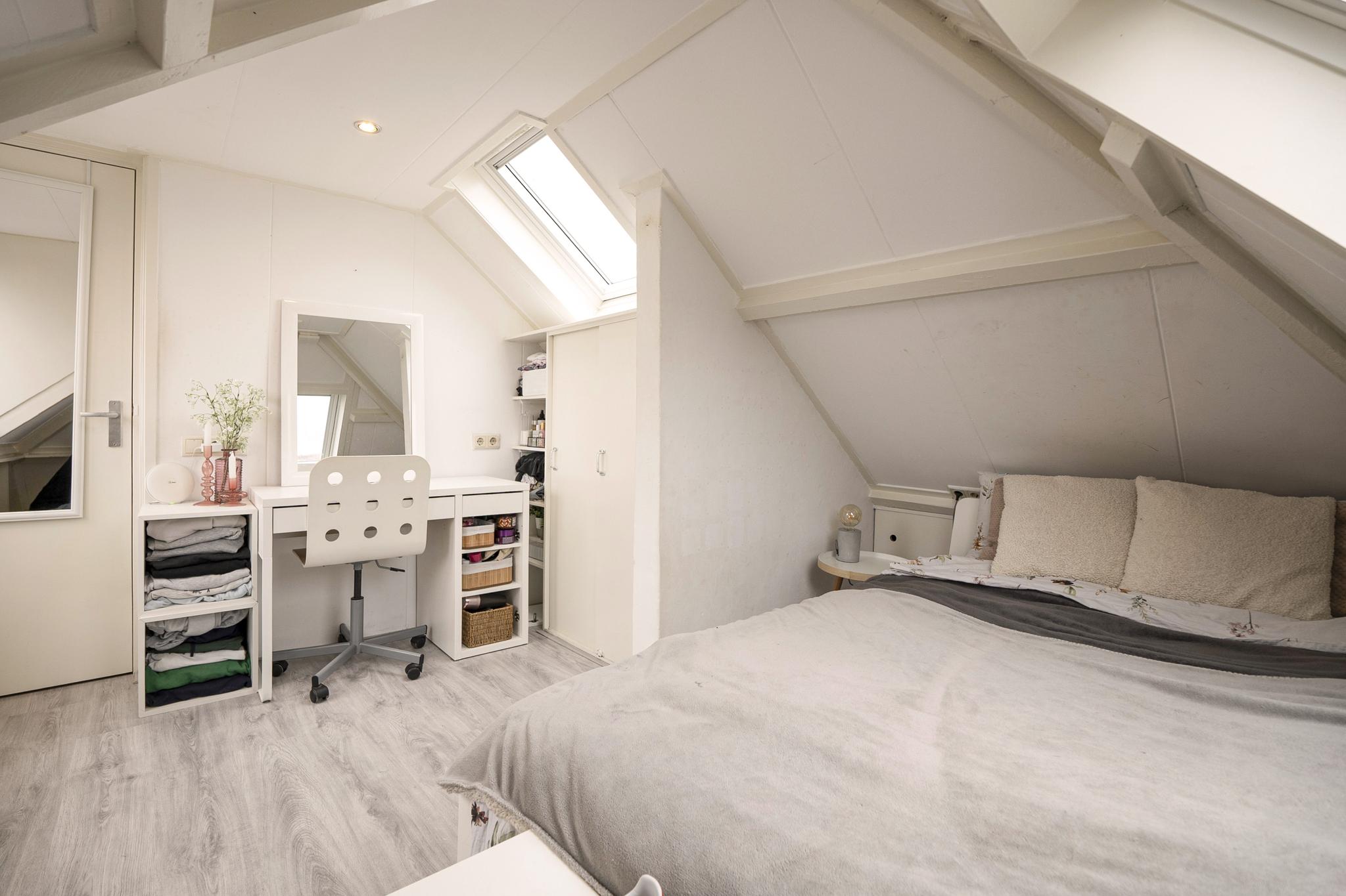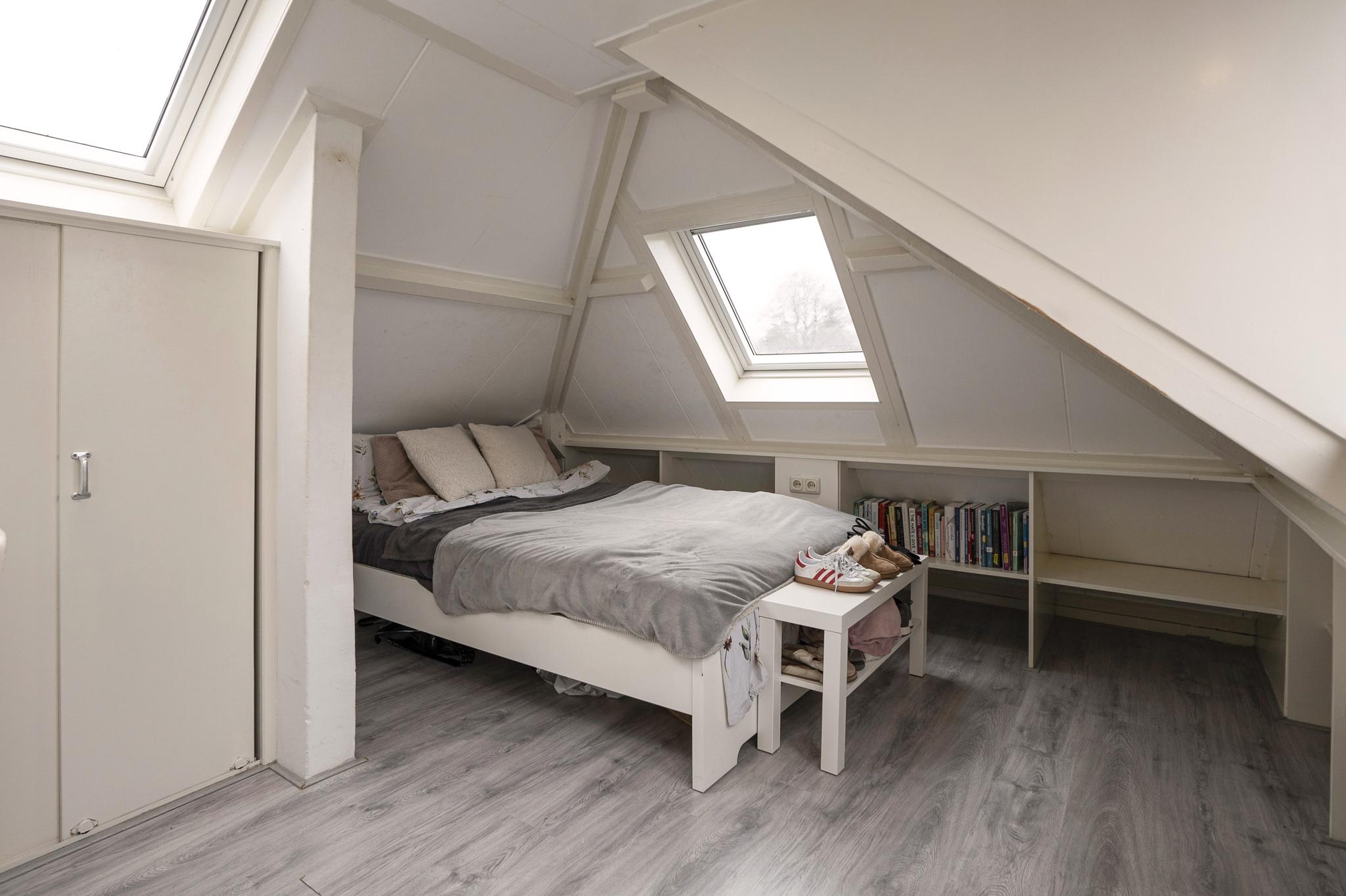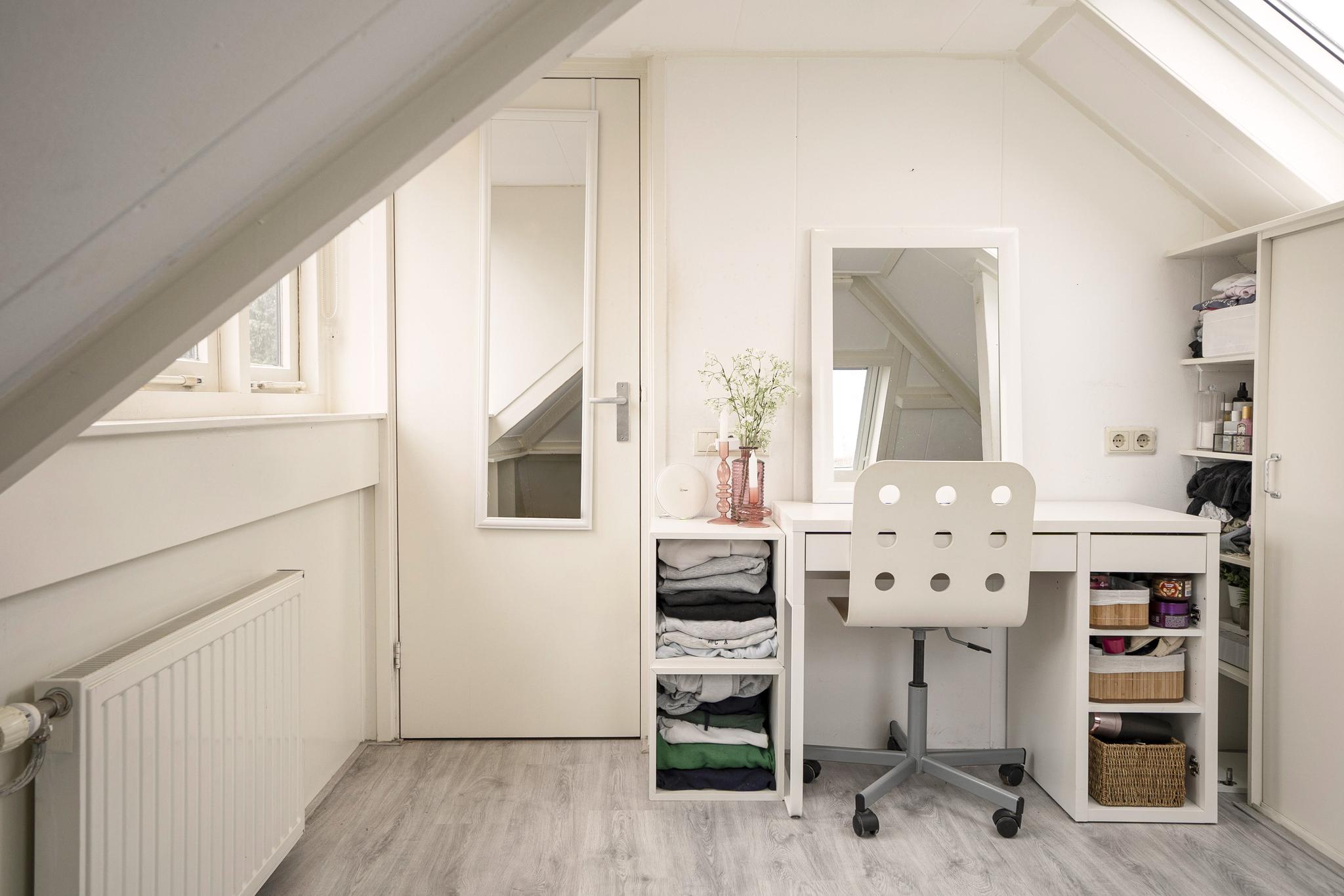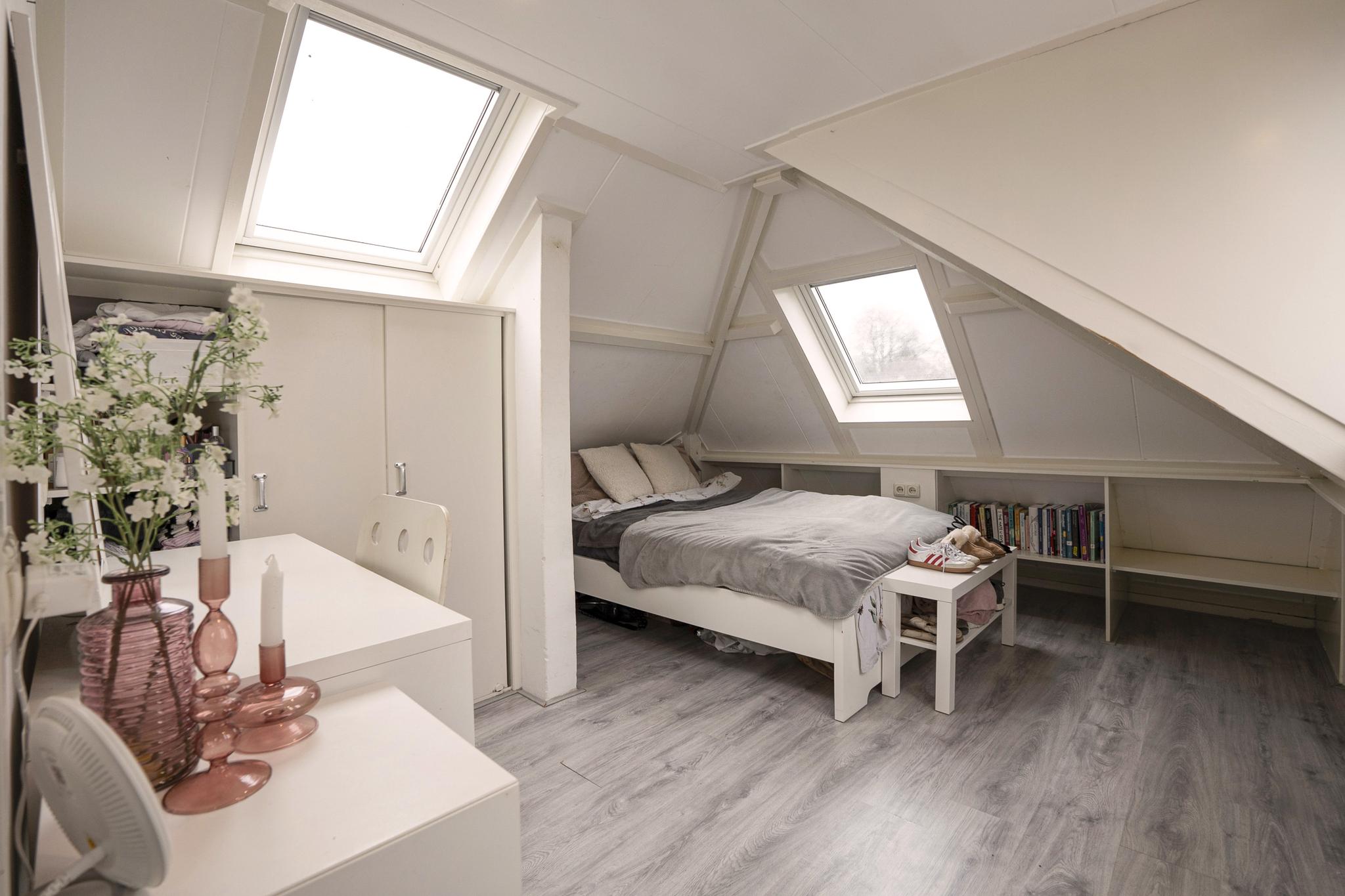 A fixed staircase leads to the attic, where a fourth bedroom has been created. Thanks to the roof windows and dormer window, this space is light and spacious. Additionally, sliding panels provide ample storage space under the roof, making this a fully functional bedroom.