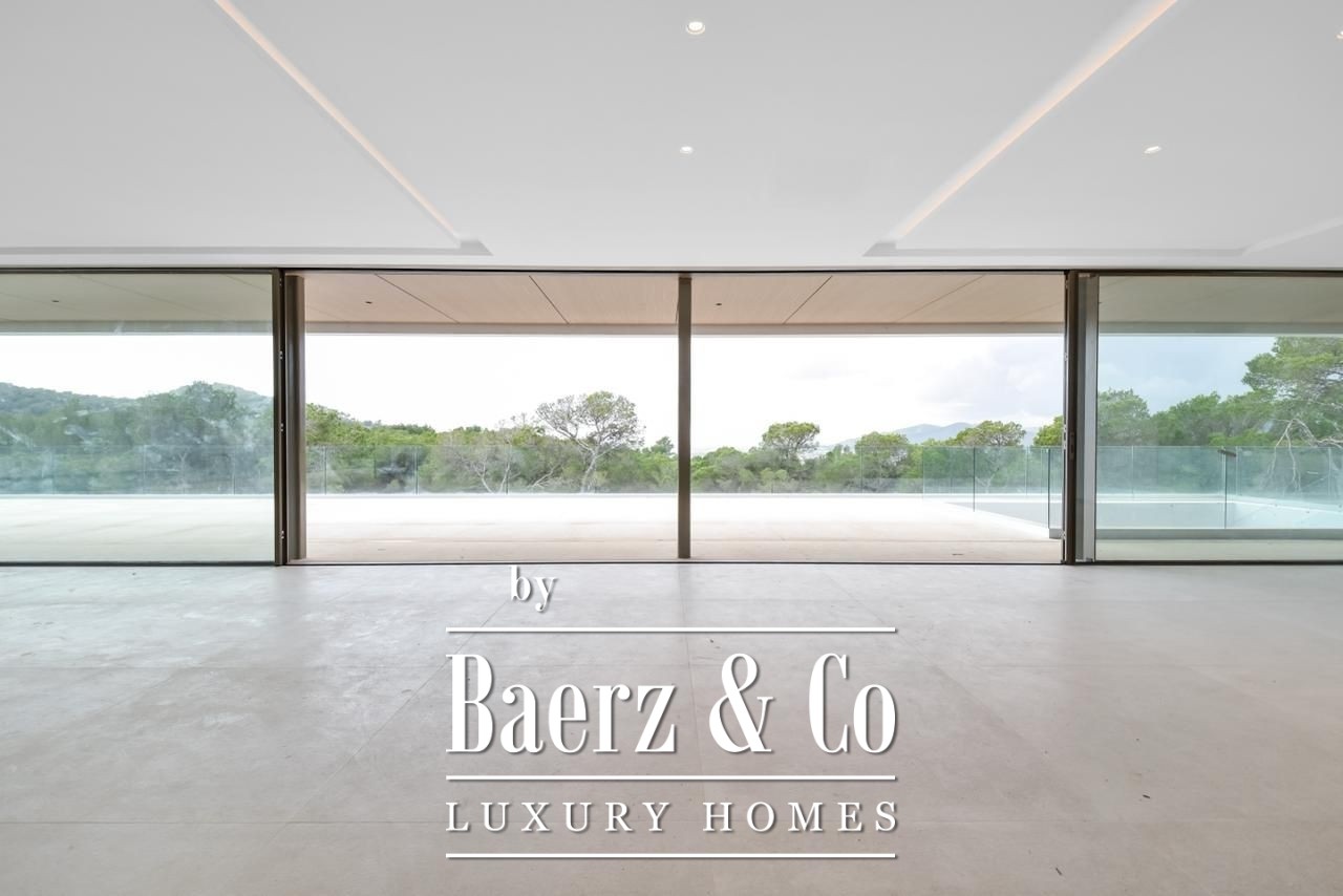 The interior welcomes natural light through high ceilings and expansive sliding glass doors, dissolving boundaries between indoor and outdoor spaces. An open-plan living room flows into a sophisticated kitchen, designed for entertaining and quiet reflection alike. Premium materials, contemporary finishes, and integrated appliances underscore a commitment to modern comfort. From every vantage, views stretch to lush gardens, the city, Salinas, and out to the distant sea and Formentera, reinforcing the villa’s sense of serene perspective.