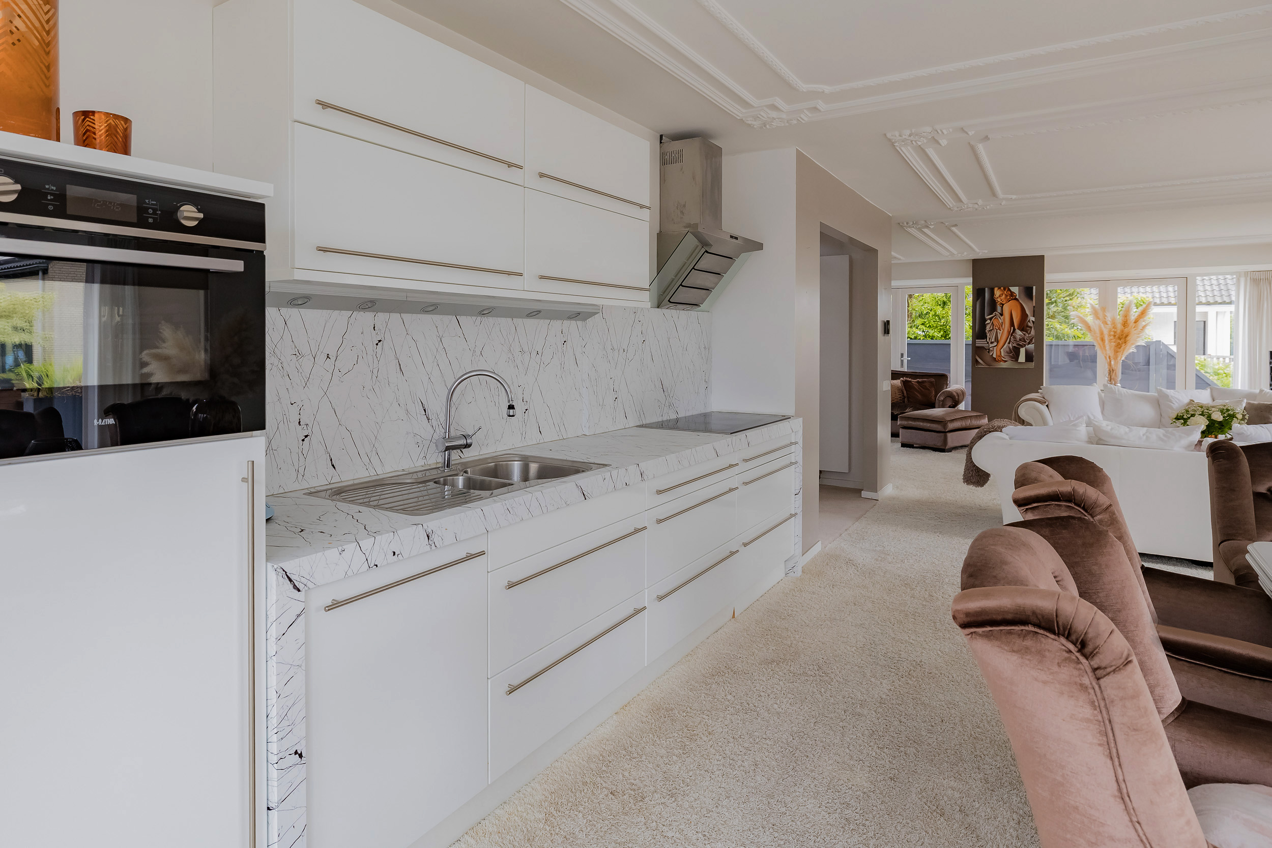 You enter the house through a generous hallway with loft and the staircase upstairs. A checkroom niche with toilet and meter cupboard provide a practical layout. The living room is spacious, bright and cozy and features a large bay window, classic decorative moldings on the ceiling and a cozy gas fireplace. Thanks to three pairs of double doors and a sliding door, the living room is in direct connection with the sunny terrace on the water.