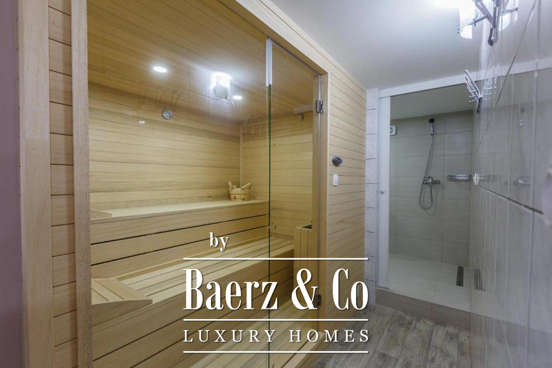 A heated swimming pool, edged with sun loungers and a calm area for unwinding, anchors the courtyard, while terraces offer ocean glimpses. The basement welcomes with a gym, sauna with bathroom, fully equipped kitchen, and a game room, ensuring leisure and vitality are always close at hand. The ground floor features a modern kitchen, living space, two bedrooms, two bathrooms, and a broad shaded terrace—ambient for slow mornings or open-air evenings among family and friends.
