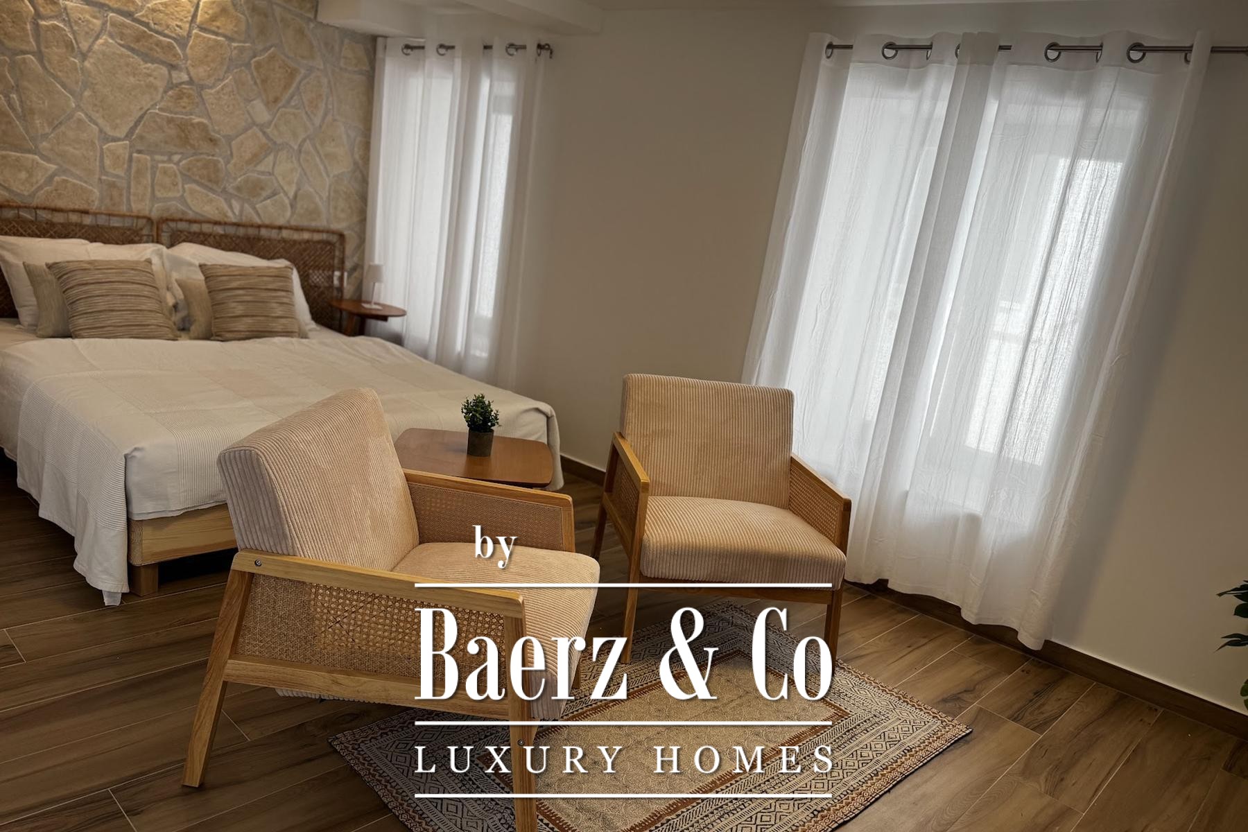 Above, a four-bedroom duplex apartment presents a refined layout—two bedrooms, two bathrooms, a kitchen and living zone, and a 44.70 m² terrace shaded by a wooden canopy. The attic extends the experience with two more bedrooms, each with a private bathroom, and a generous storage room. In total, there are 7 bedrooms and 7 bathrooms, each with air conditioning and en suite privacy.