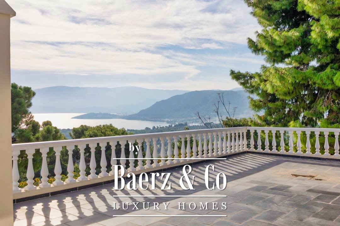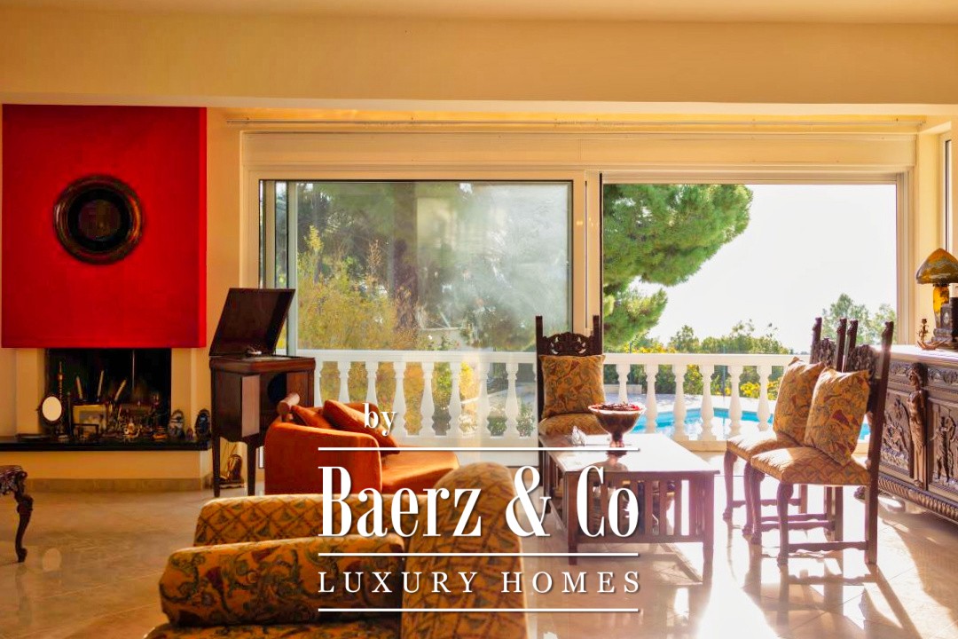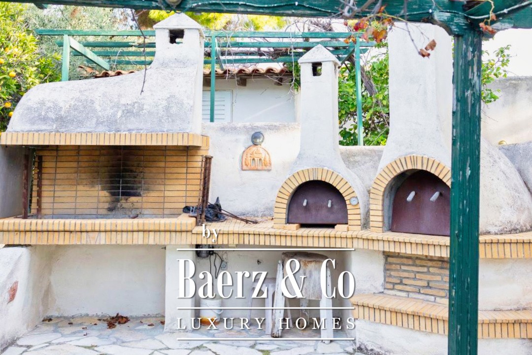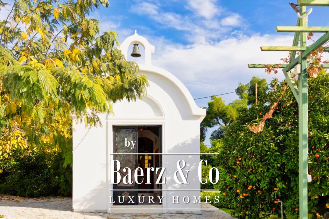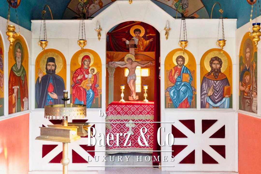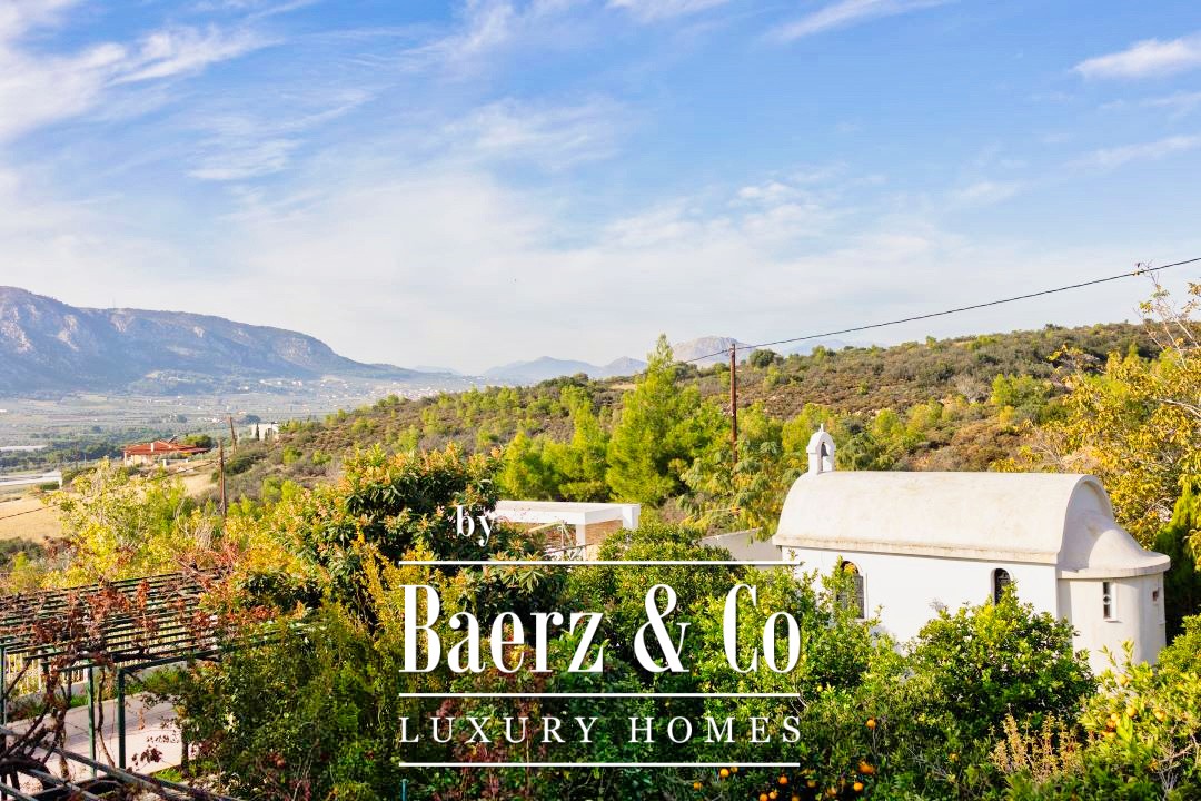 Outdoors, a 12 by 7 meter pool rests amid stonework and gardens, shaded by a raised iron pergola. The estate’s orchard, nourished by a private well, flourishes with orange, lemon, fig, olive, and grapes across one acre of land. At its heart stands a chapel of 22 m², appointed with marble iconostasis and frescoes. Security and comfort are assured with double glazing, oil heating, air conditioning, security door, alarm, and a fire extinguishing system. This luxury villa for sale in Kechries is a rare retreat, balancing privacy and connection to the Greek landscape.