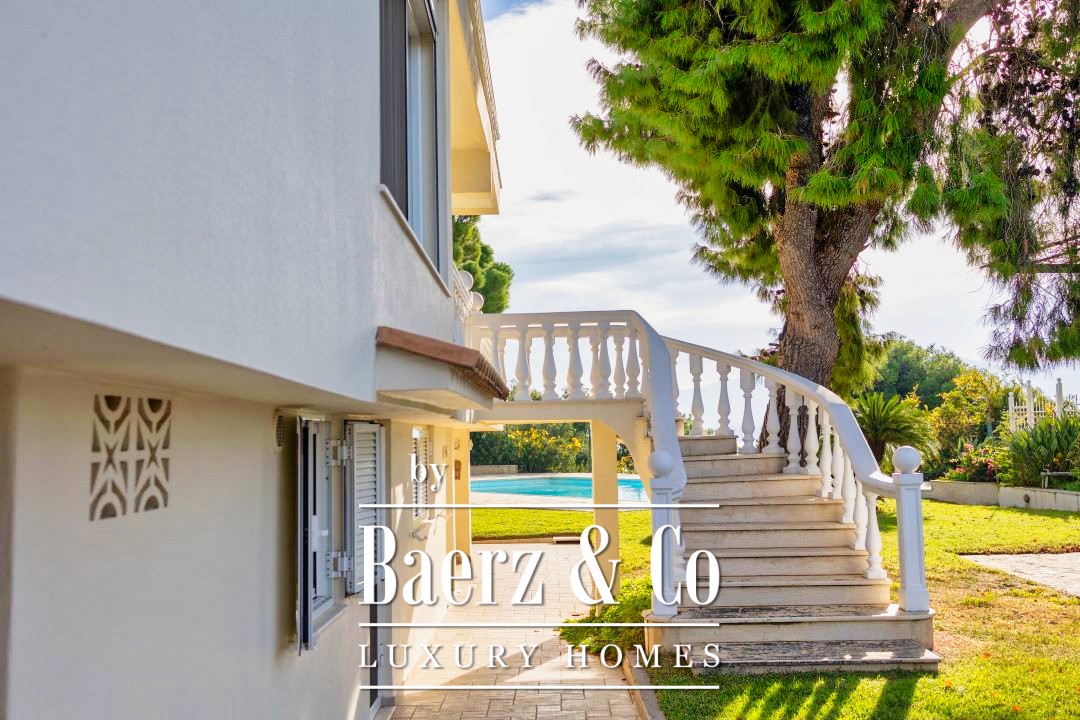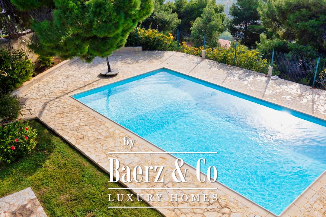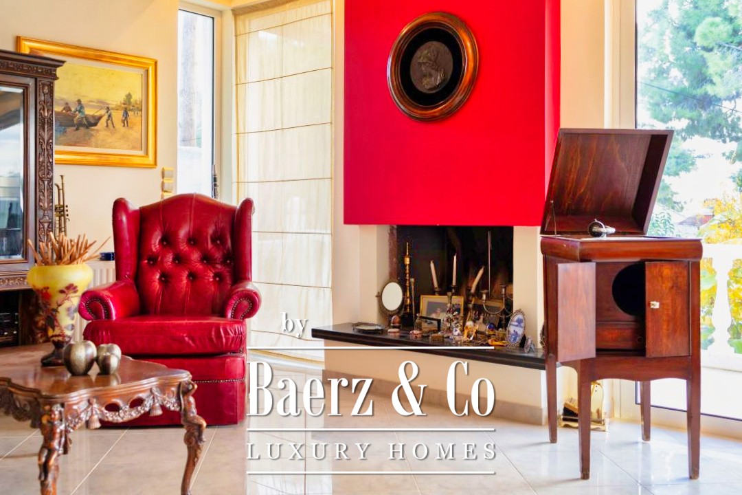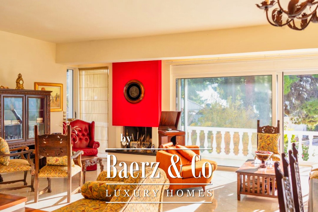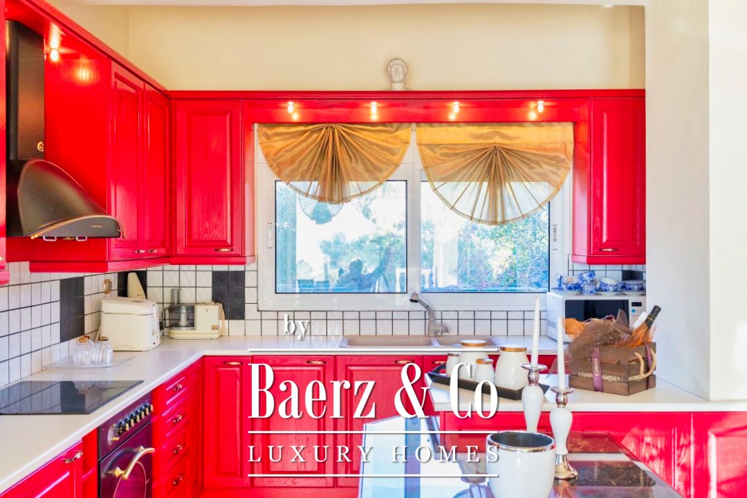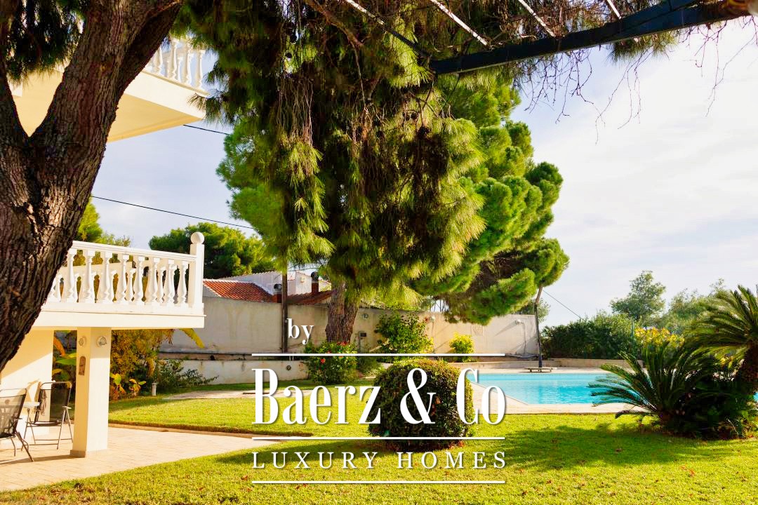 Outdoors, a 12 by 7 meter pool rests amid stonework and gardens, shaded by a raised iron pergola. The estate’s orchard, nourished by a private well, flourishes with orange, lemon, fig, olive, and grapes across one acre of land. At its heart stands a chapel of 22 m², appointed with marble iconostasis and frescoes. Security and comfort are assured with double glazing, oil heating, air conditioning, security door, alarm, and a fire extinguishing system. This luxury villa for sale in Kechries is a rare retreat, balancing privacy and connection to the Greek landscape.