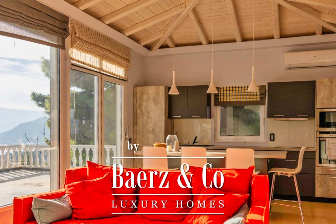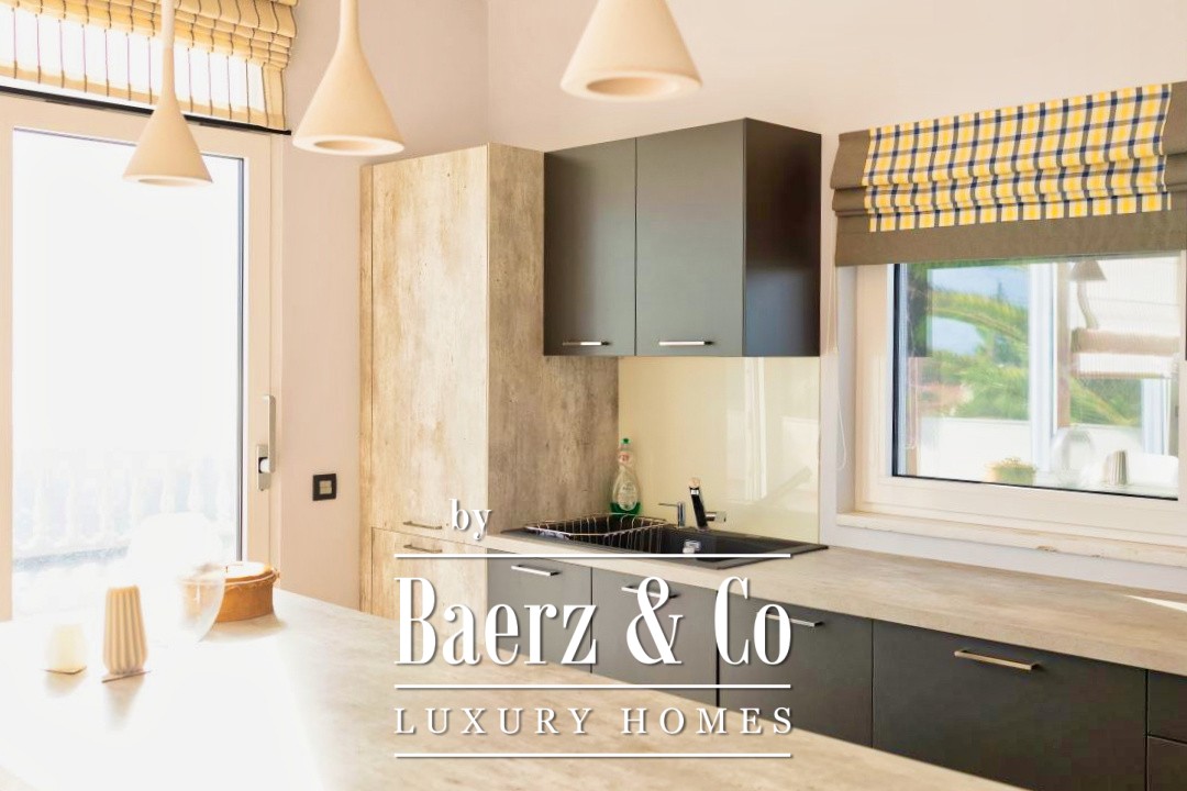Detached house Kechries stands just above the bay, immersing you in an atmosphere of understated luxury and panoramic sea views. The main residence unfolds over 342 m², comprised of three levels crafted for a serene and expansive lifestyle. On the first floor, 115 m² of refined living space includes an open-plan area with rosy wood cabinetry and a fireplace, a bedroom, and a bathroom featuring a bathtub. Large balcony doors guide you from the living area to a wrap-around marble terrace, offering vistas over the pool and Kechries bay.