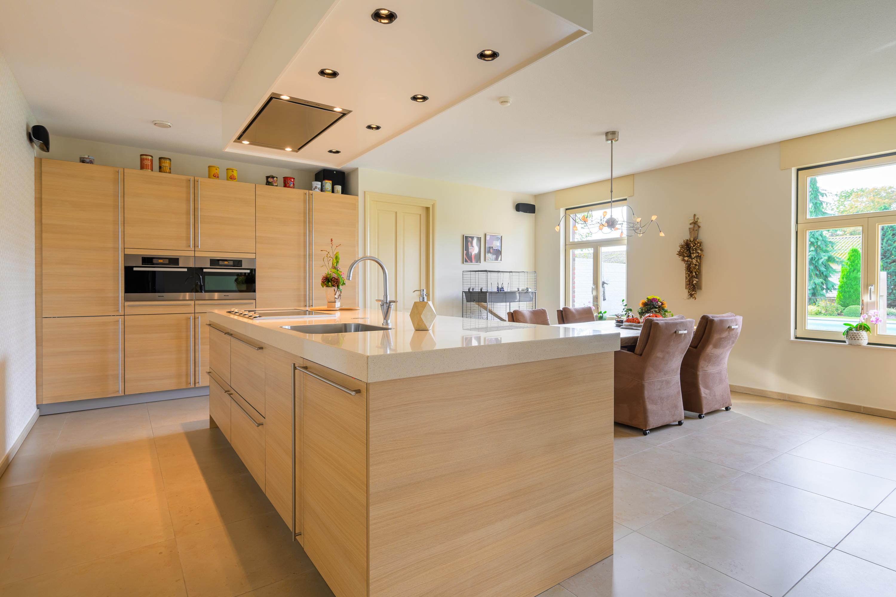 Dankzij de open verbinding tussen de keuken en zowel het eet- als het leefgedeelte is er genoeg ruimte om gezellig met het hele gezin samen te zijn. De moderne halfopen keuken is geplaatst in een praktische wandopstelling, aangevuld met een kookeiland, waardoor je over meer dan voldoende werk- en opbergruimte beschikt. Daarnaast is het geheel voorzien van alle wenselijke inbouwapparatuur, zoals: een inductiekookplaat, spoelbak, vaatwasser, stoomoven, combimagnetron en koelkast. De keuken heeft veel daglicht en biedt een mooi uitzicht op de tuin. Aangrenzend bevindt zich de bijkeuken, voorzien van een hoekopstelling met koelkast, combi-oven, ingebouwde grill en frituurpan, en een afzuigkap. Er is tevens een handige provisieruimte.