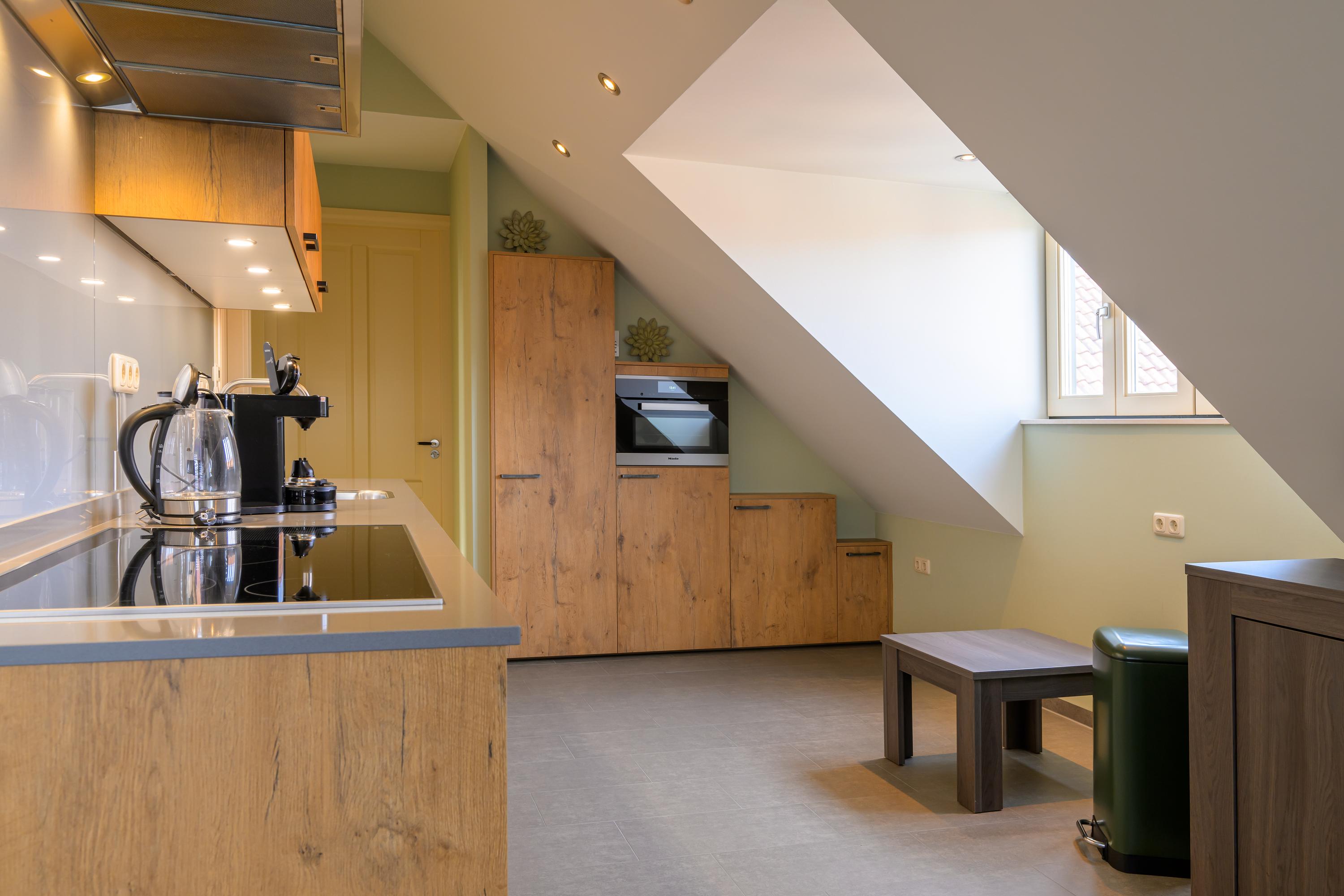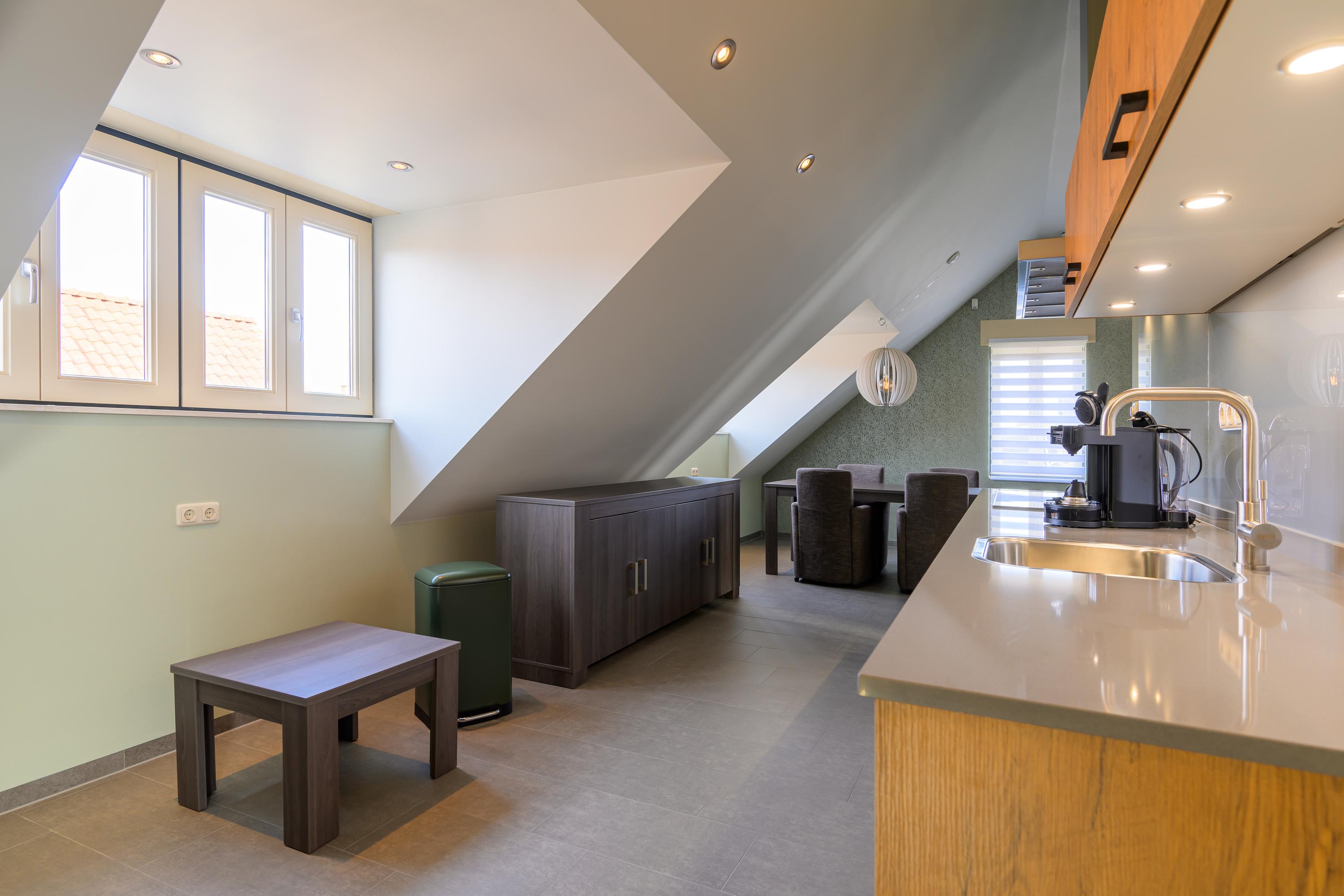 De eerste verdieping is toegankelijk via zowel de binnen- als de buitentrap. Ook hier is de ruimte verdeeld in twee delen. Het ene deel bevat een royale overloop, technische ruimte, zeer ruime slaapkamer en een bergzolder. Aan de andere kant bevindt zich een zelfstandig appartement, compleet uitgerust voor autonoom wonen. Via de buitentrap komen we binnen in een hal met toilet. Vanuit hier bereiken we de royale woon-/eetkamer. Deze is voorzien van een luxe keuken. De badkamer is uitgerust met: een wastafel, inloopdouche en witgoedaansluitingen. De slaapkamer heeft een handige schuifdeurenkast. Ook deze verdieping beschikt over vloerverwarming en profiteert van veel daglicht door de dakramen.