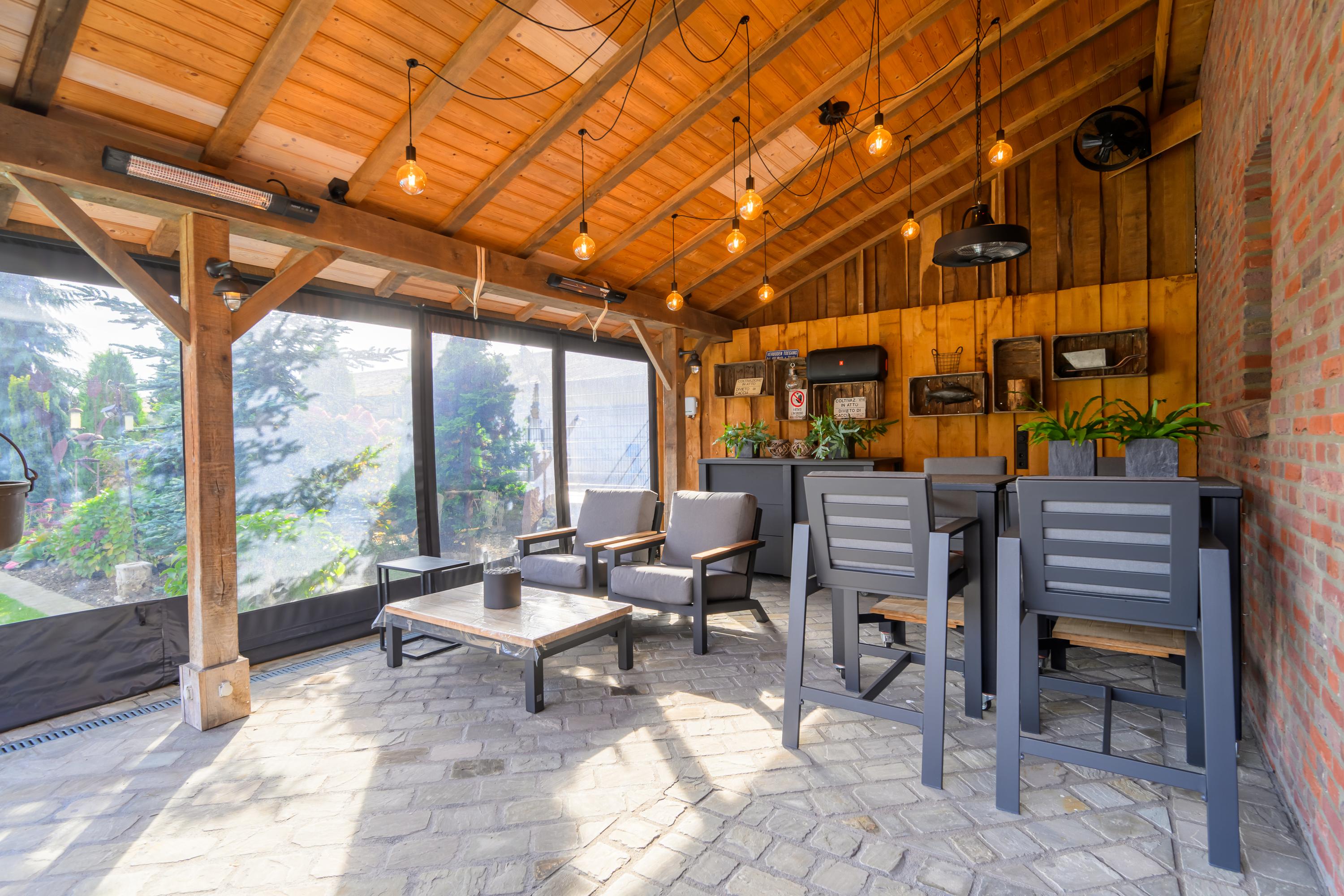 De vrijstaande garage is uitgerust met een elektrische poort, heeft een zolderruimte en een toilet. Het aangrenzende terras met overkapping biedt een heerlijke plek om van het buitenleven te genieten.